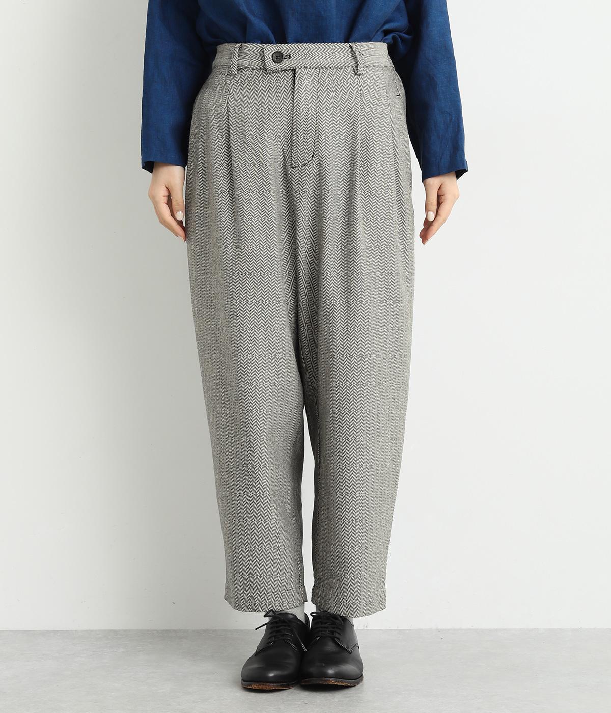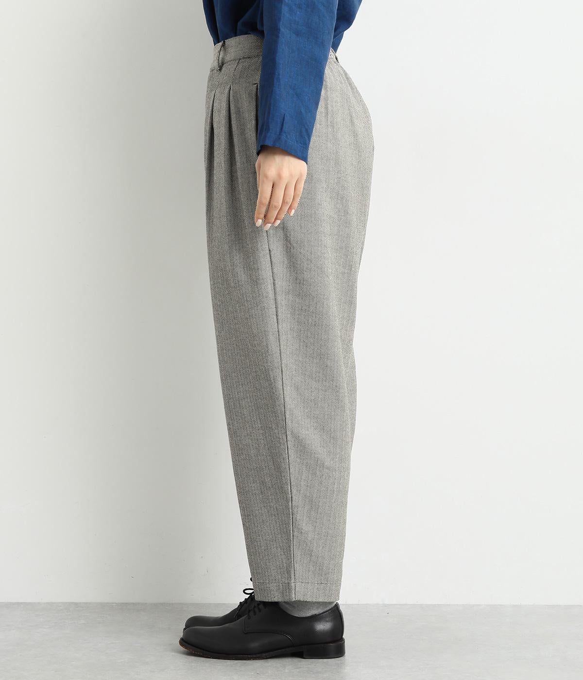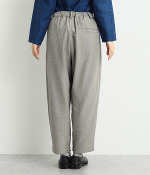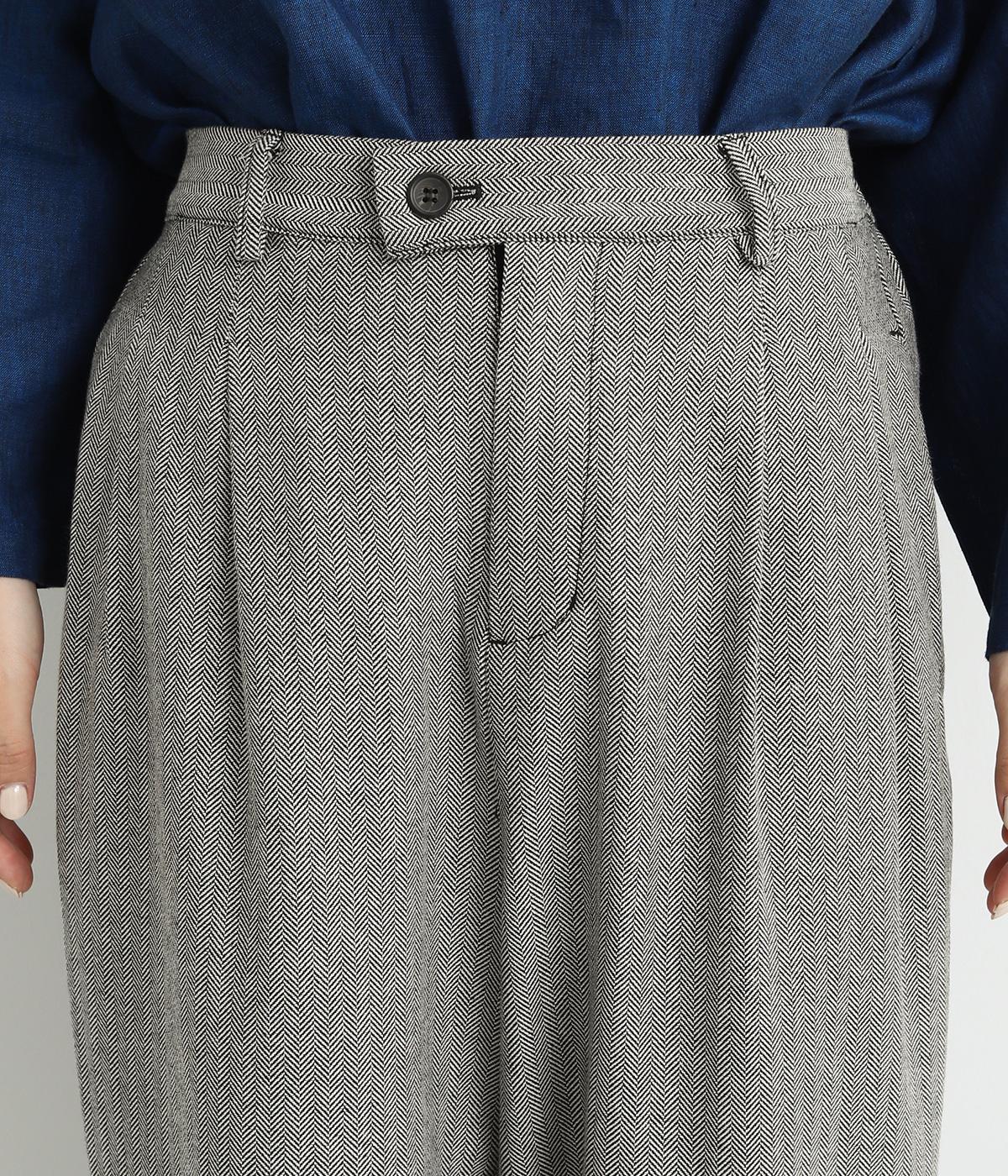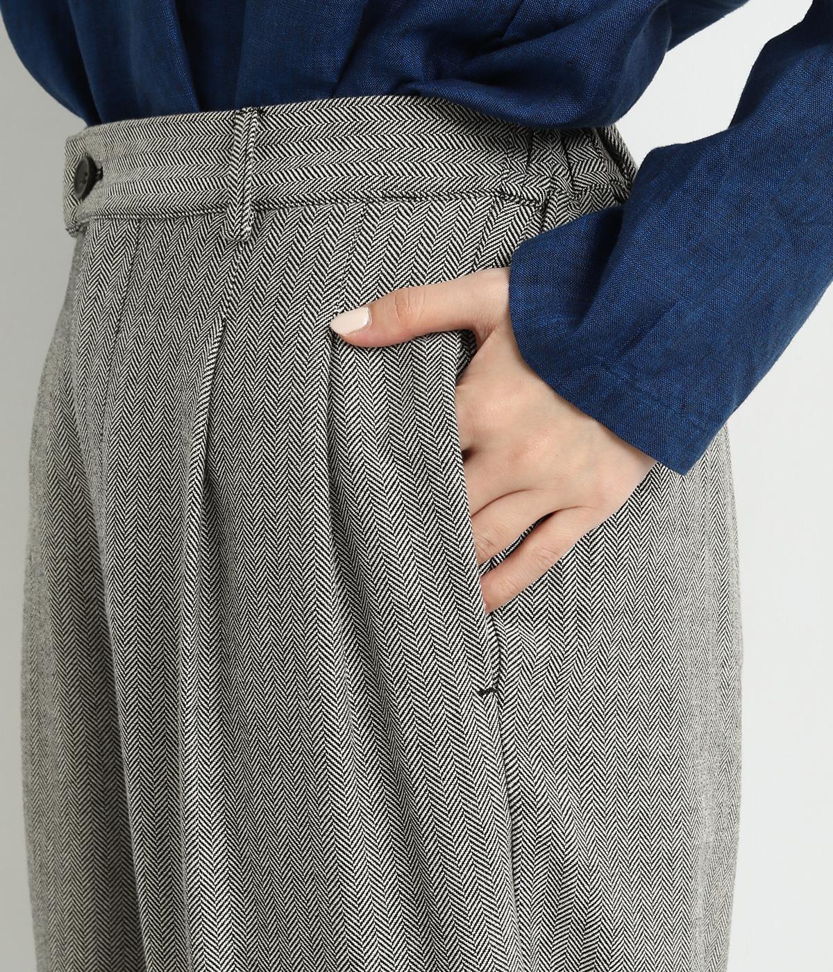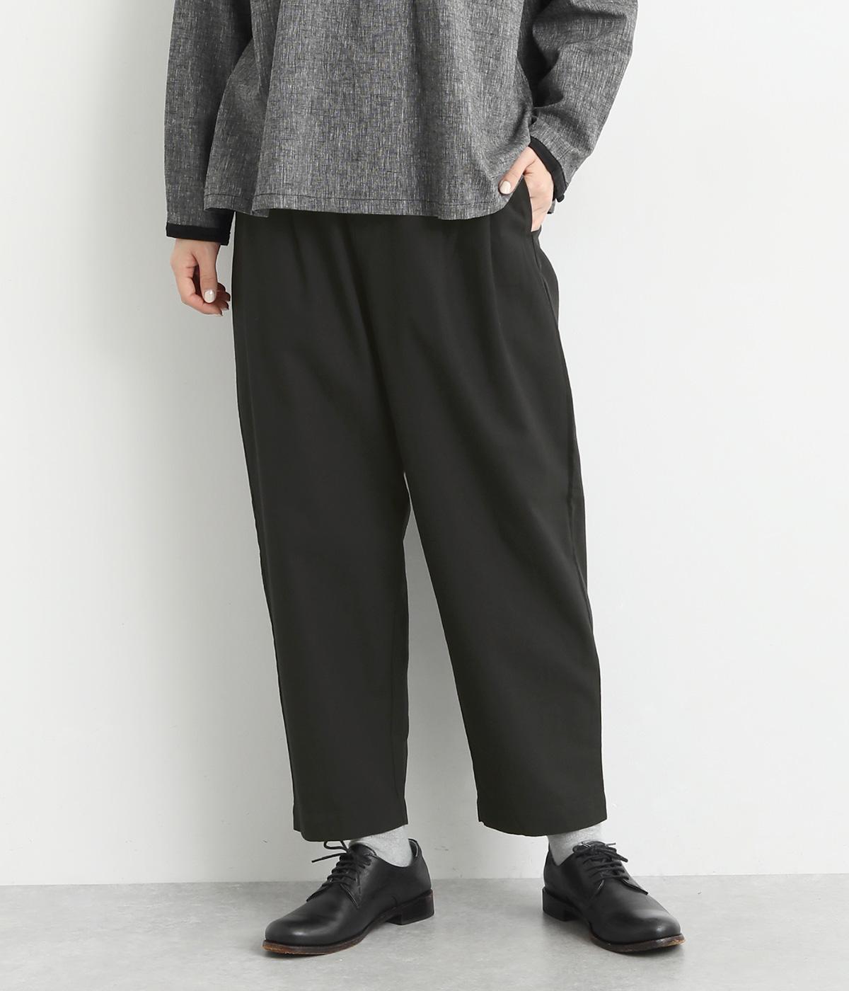 タックでワタリ幅をゆったり取り、裾に向かってすっきりとしたシルエットに仕立てました。ベルトまわりのデザインを活かしたトップスインの装いもおすすめ。前ファスナーで脱ぎはきしやすく、ウエスト後ろゴムでフィット感も◎。
