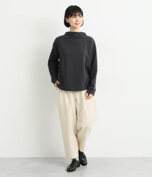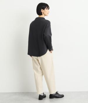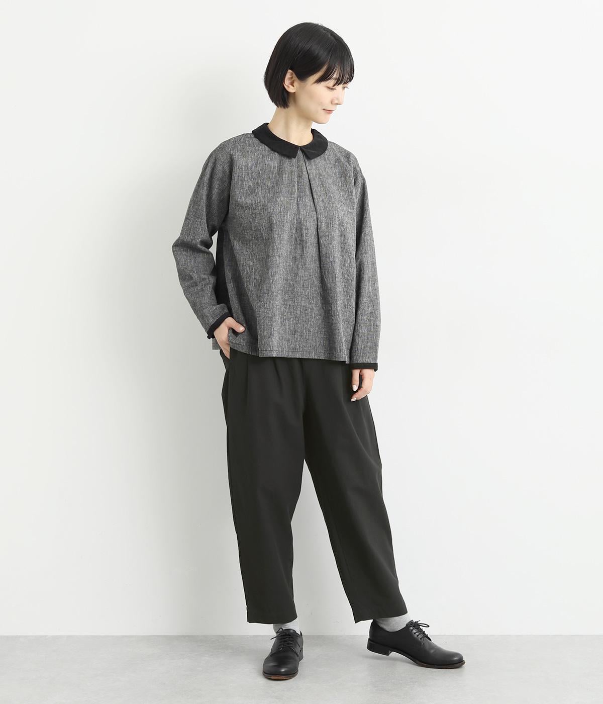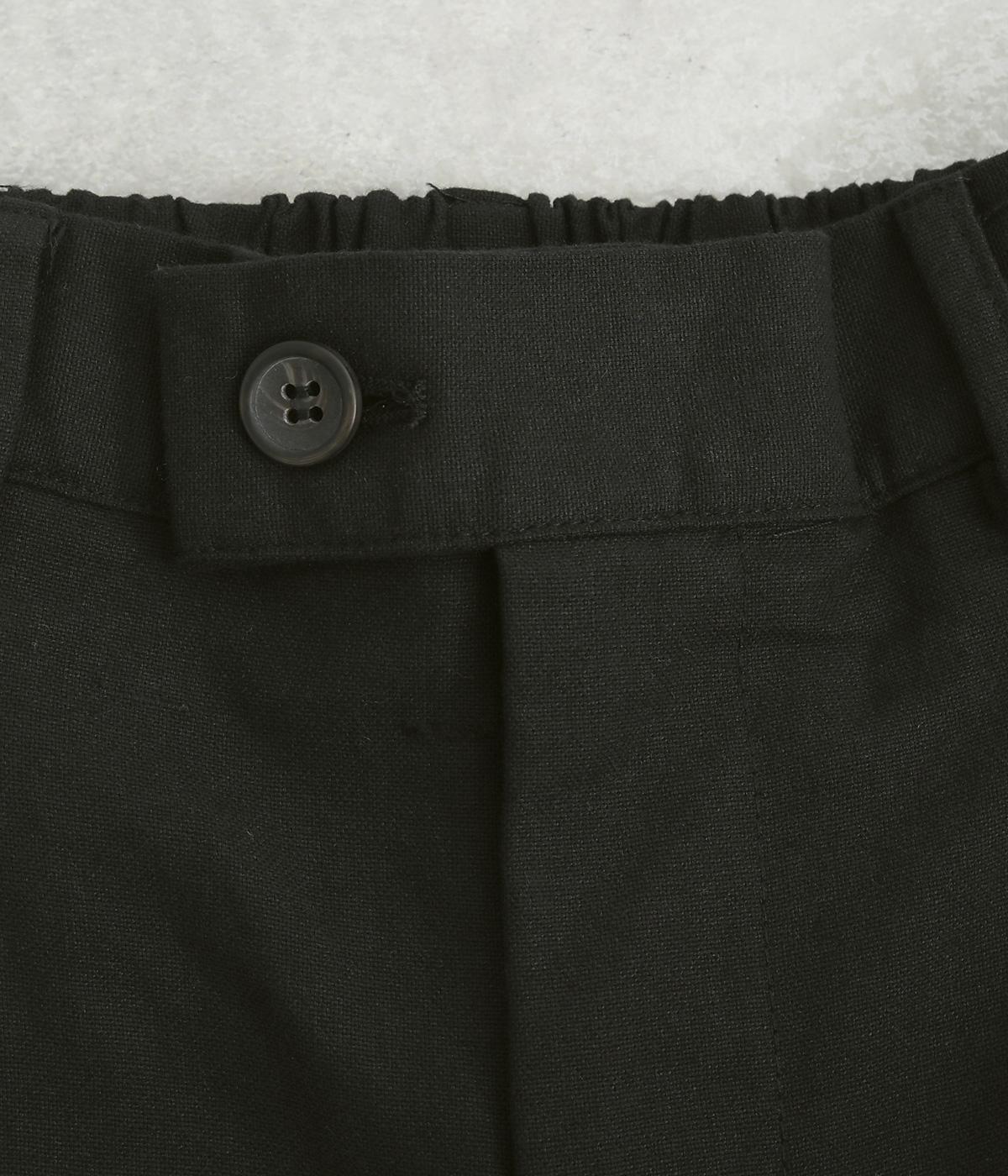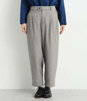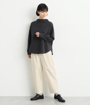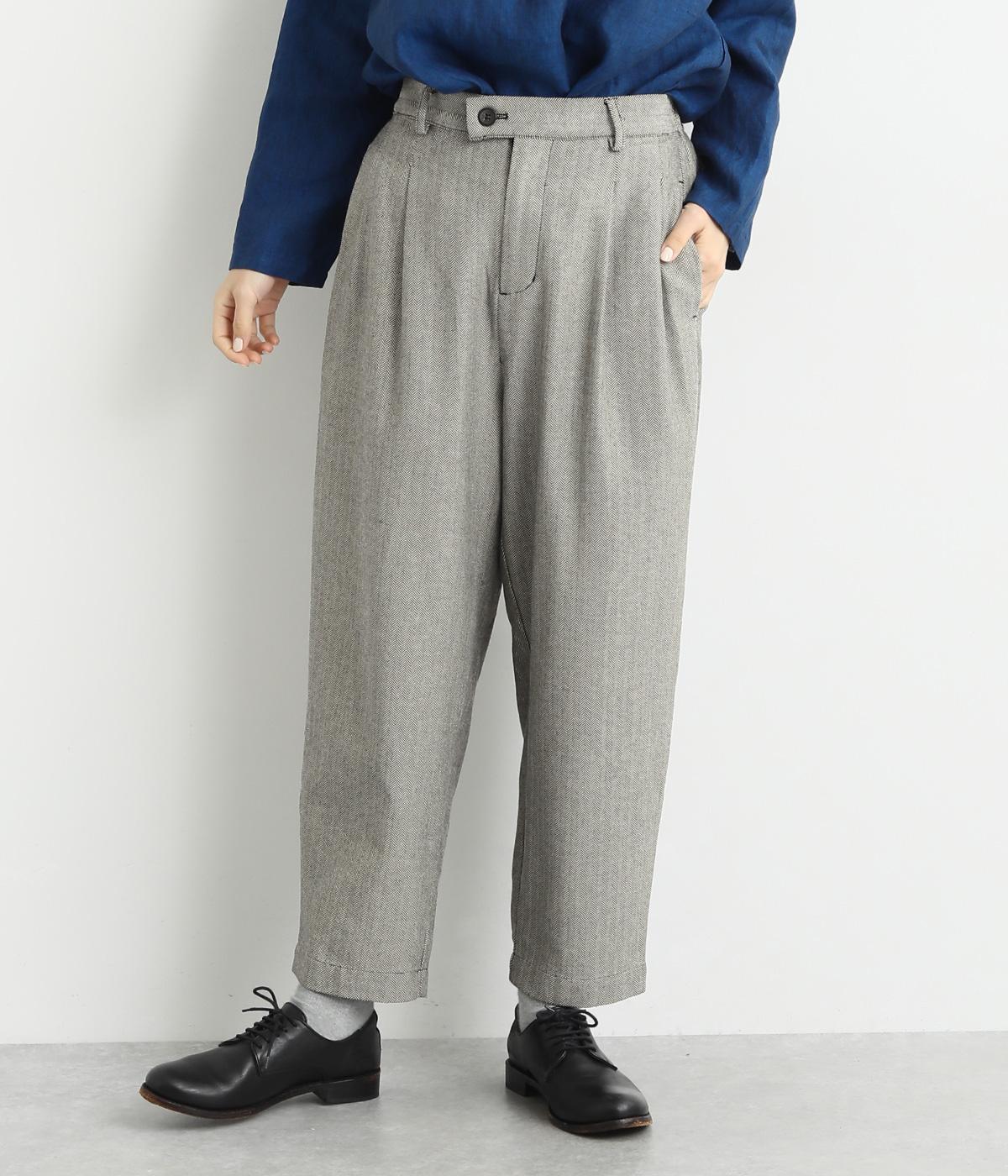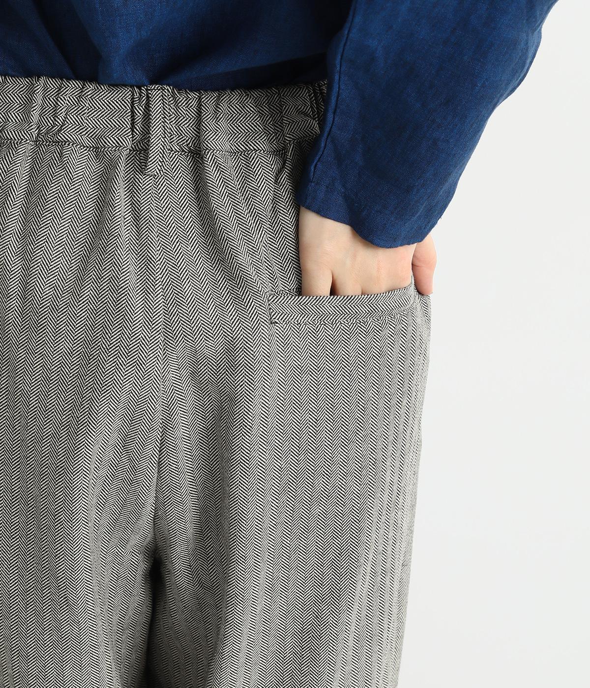 タックでワタリ幅をゆったり取り、裾に向かってすっきりとしたシルエットに仕立てました。ベルトまわりのデザインを活かしたトップスインの装いもおすすめ。前ファスナーで脱ぎはきしやすく、ウエスト後ろゴムでフィット感も◎。