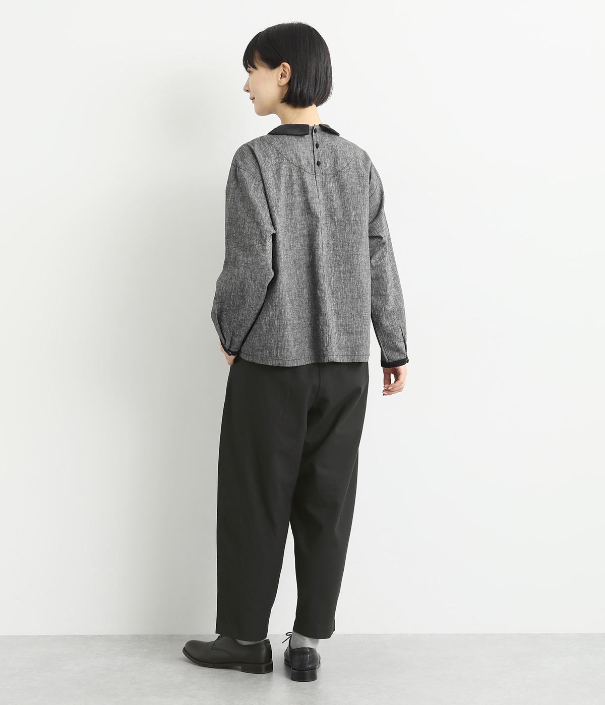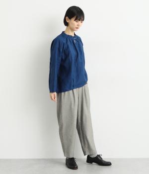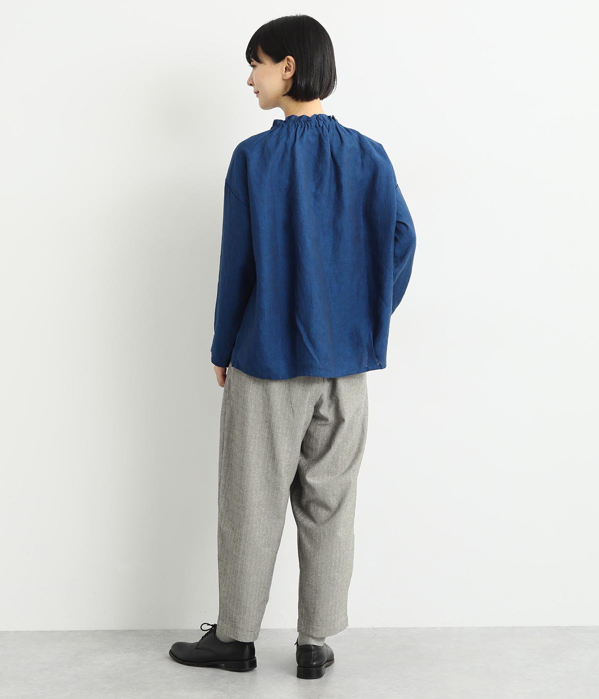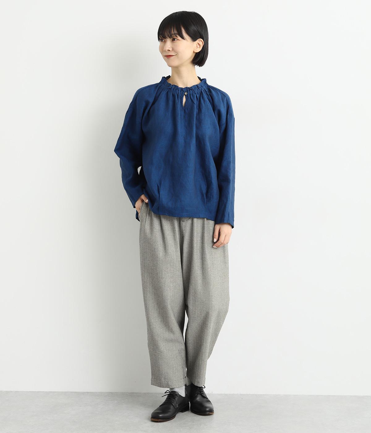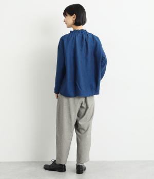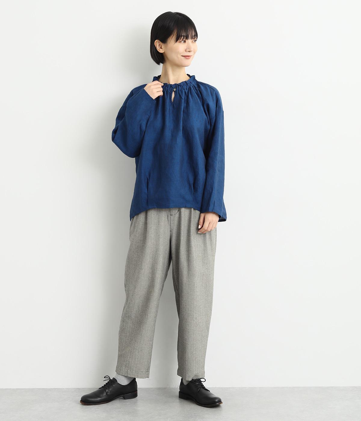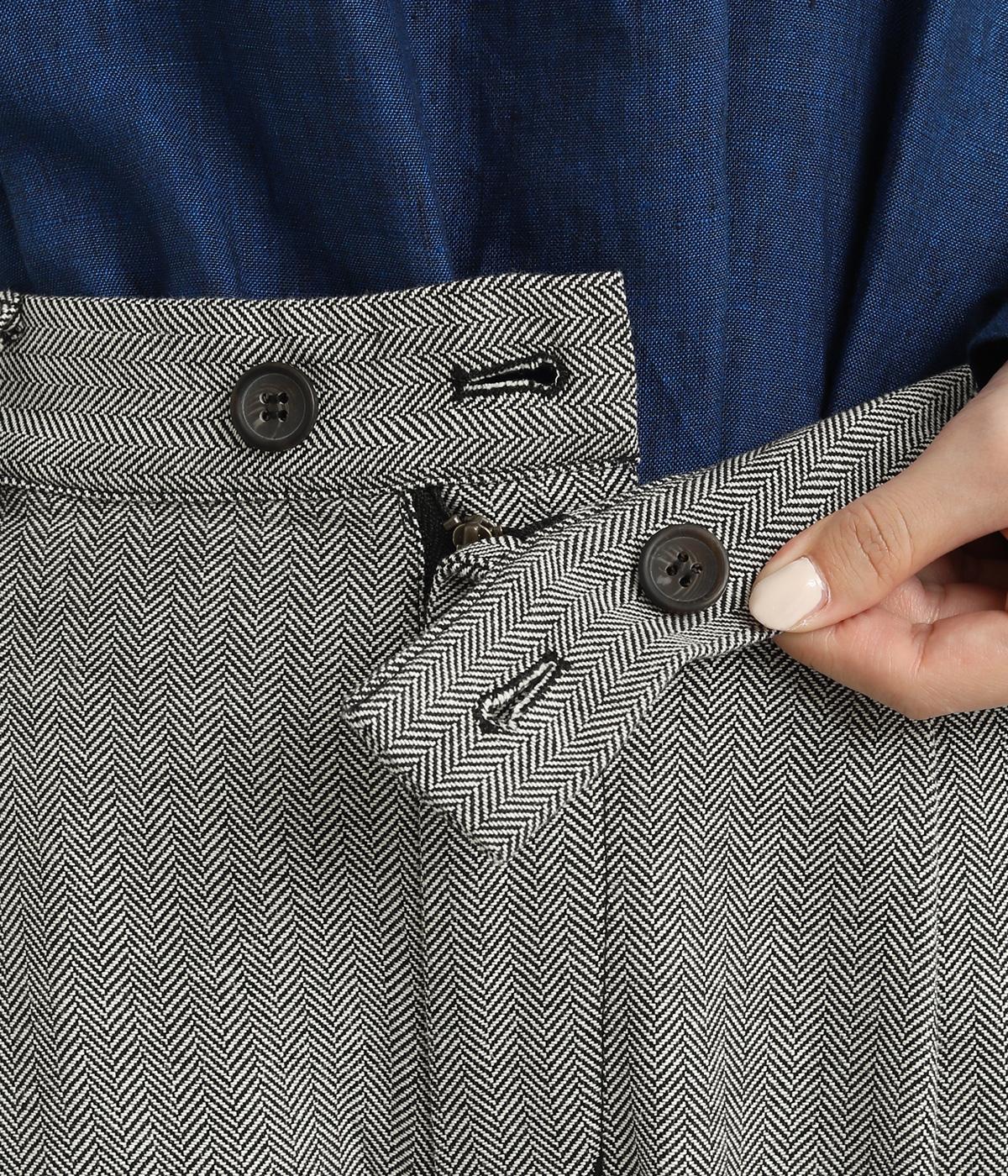 タックでワタリ幅をゆったり取り、裾に向かってすっきりとしたシルエットに仕立てました。ベルトまわりのデザインを活かしたトップスインの装いもおすすめ。前ファスナーで脱ぎはきしやすく、ウエスト後ろゴムでフィット感も◎。