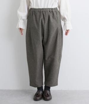 ナチュラル素材でデイリー使いしやすくもトラッドな雰囲気に仕立てました。タックを入れたコクーンシルエットがスタイリングのワンポイントに。裾まわりはすっきりまとめているので、レースアップシューズなどとも好相性です。