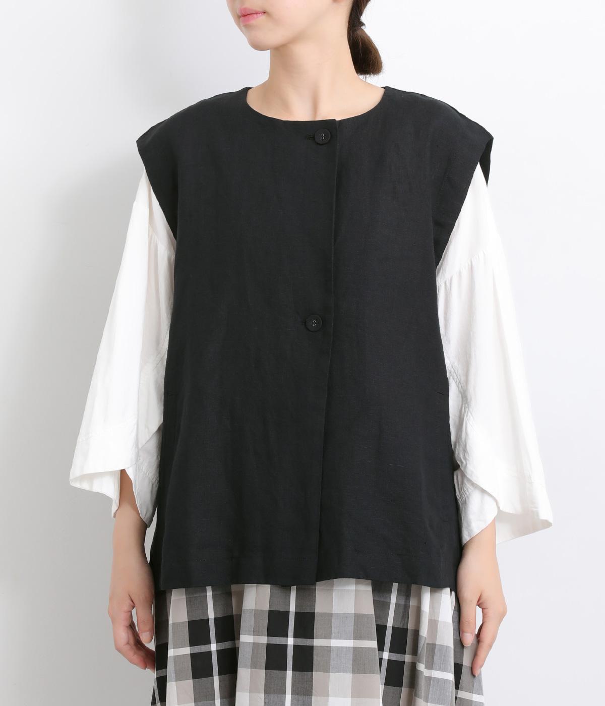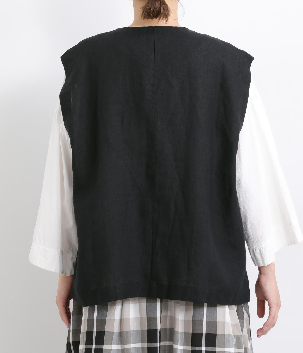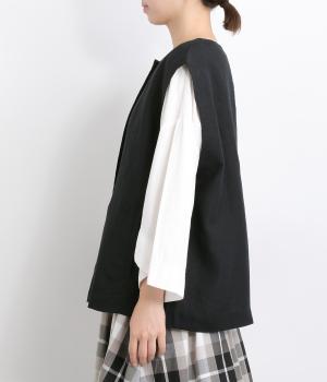 ドロップした広い肩幅と浅い合わせがデザインポイントのベストです。襟のように開けばすっきりと、上まで留めればトップス感覚でメイン使いにも。箱ポケットつきで利便性も高く、ボタンは共布でまとまりよく仕上げました。