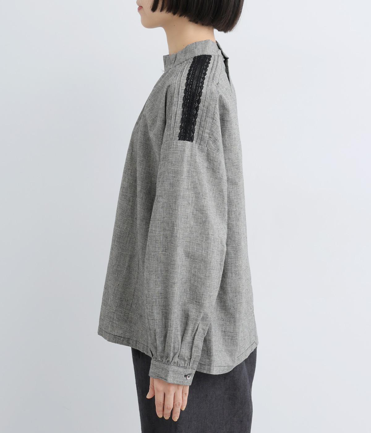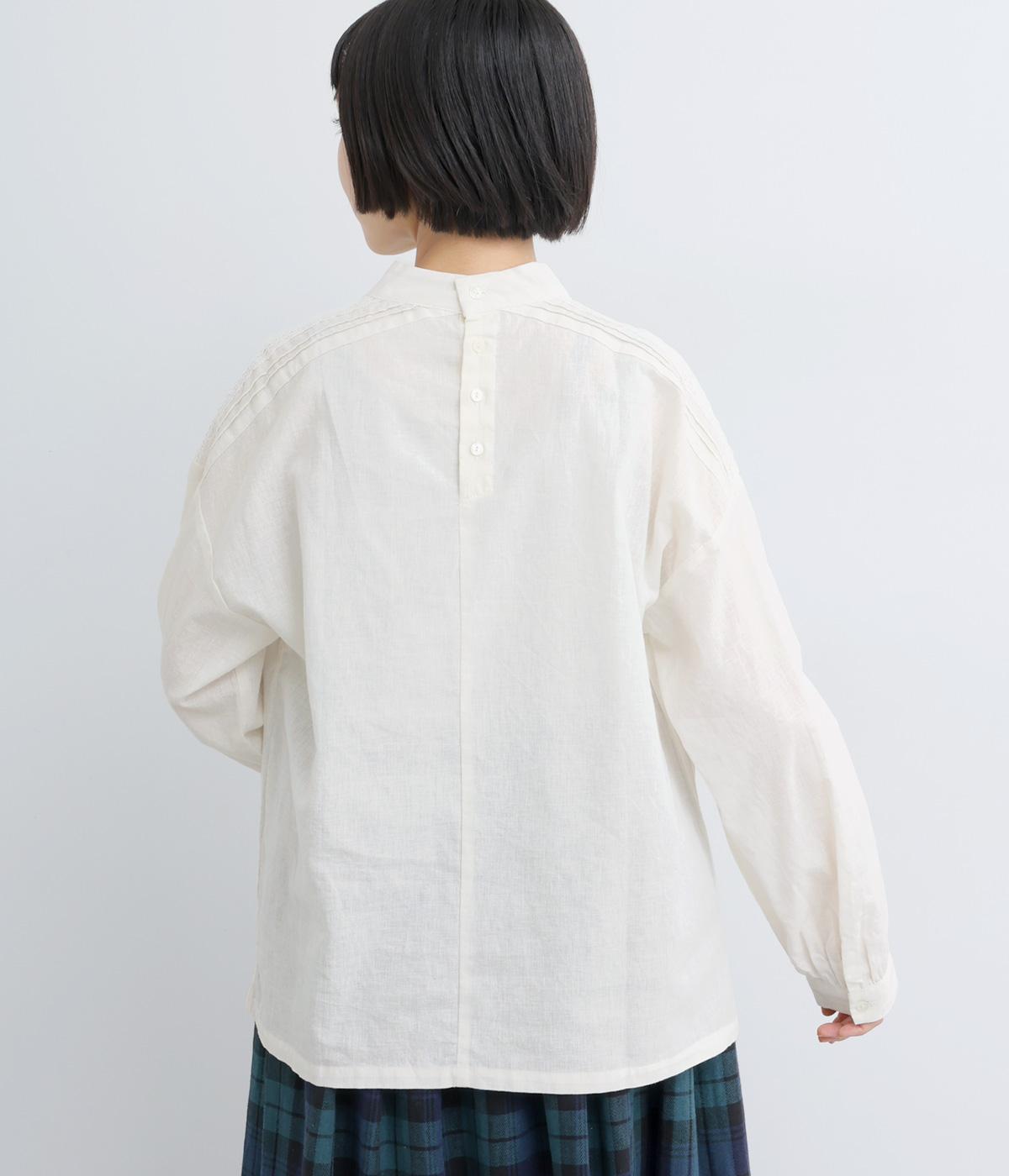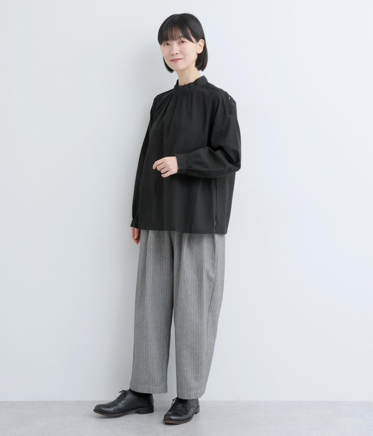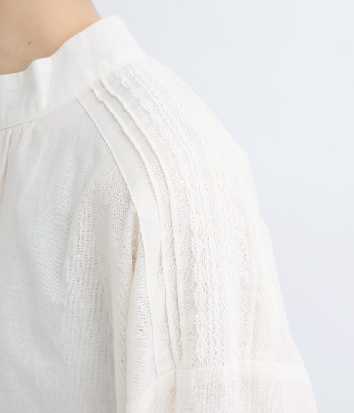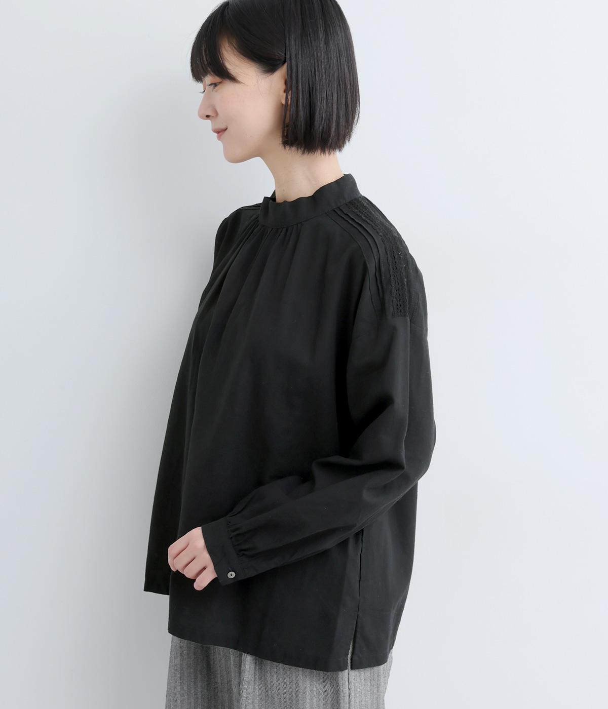 肩のピンタックとレース使いでほんのりと甘さを添えたハイネックブラウス。前ネック下にギャザーを入れて、ふんわりとしたゆとりのあるシルエットに仕上げました。後ろのボタン開き仕様が着脱をアシスト。抜け感を演出する裾のサイドスリットもポイントです。