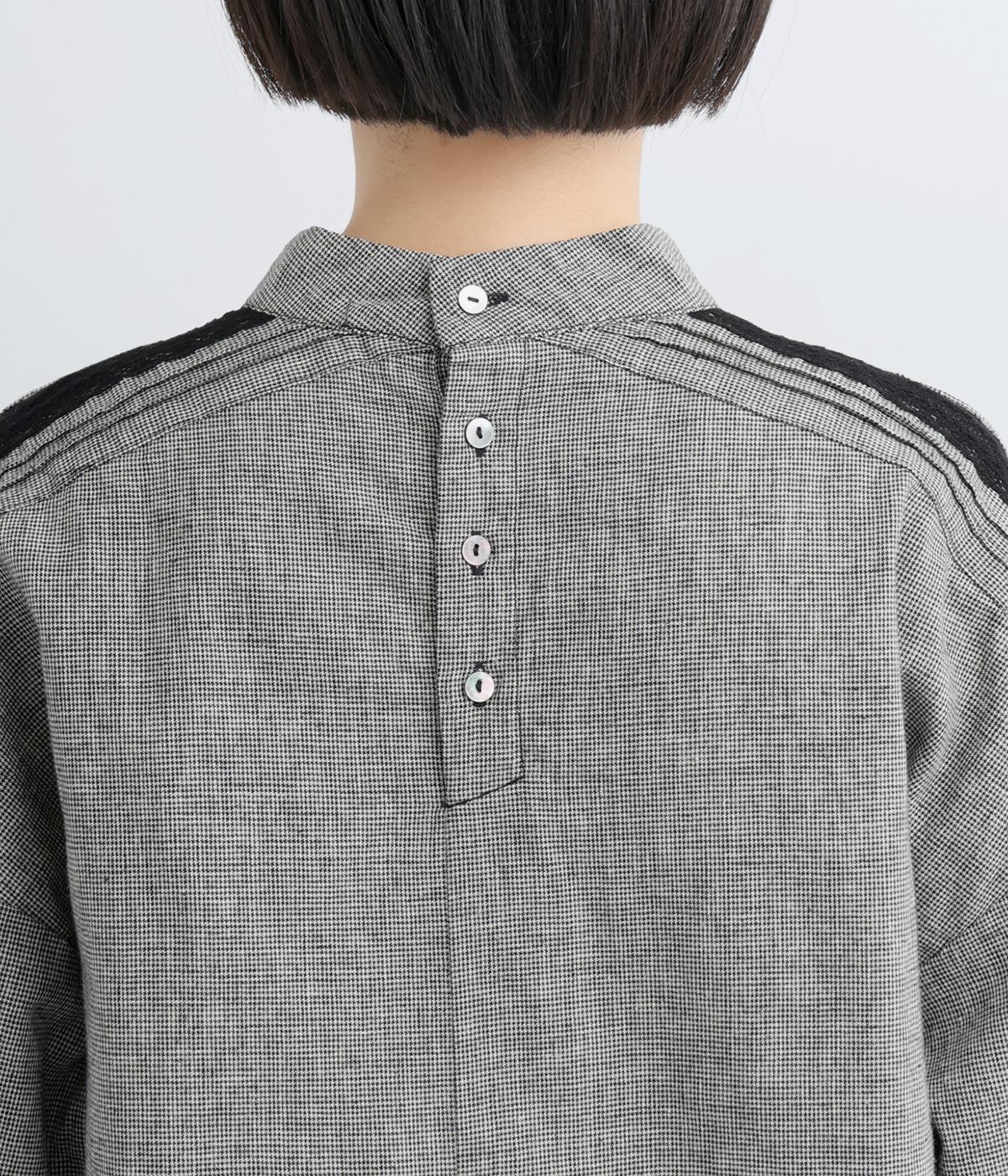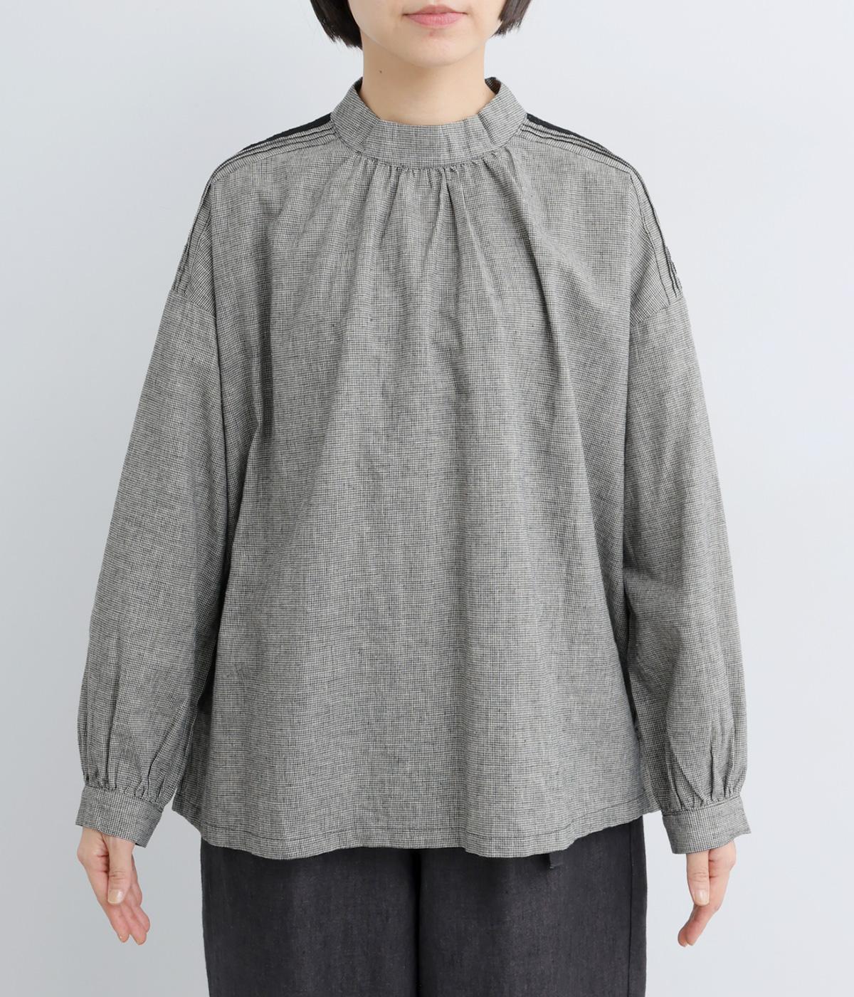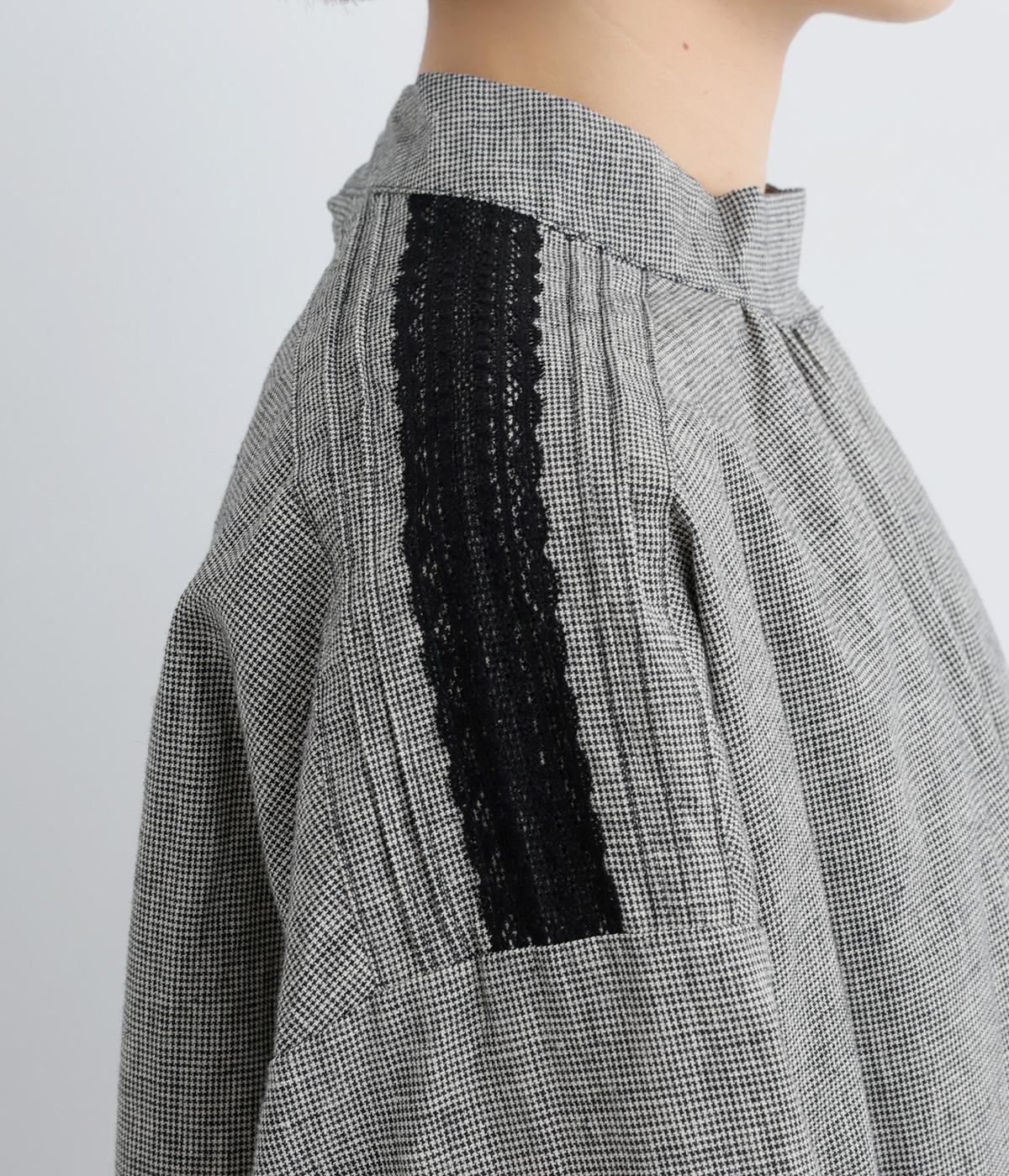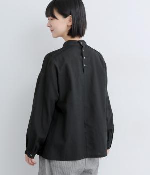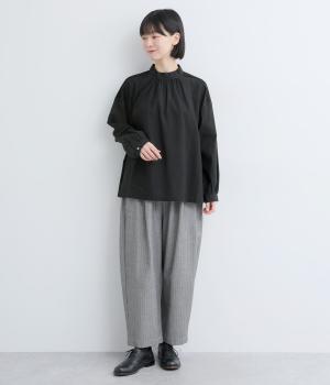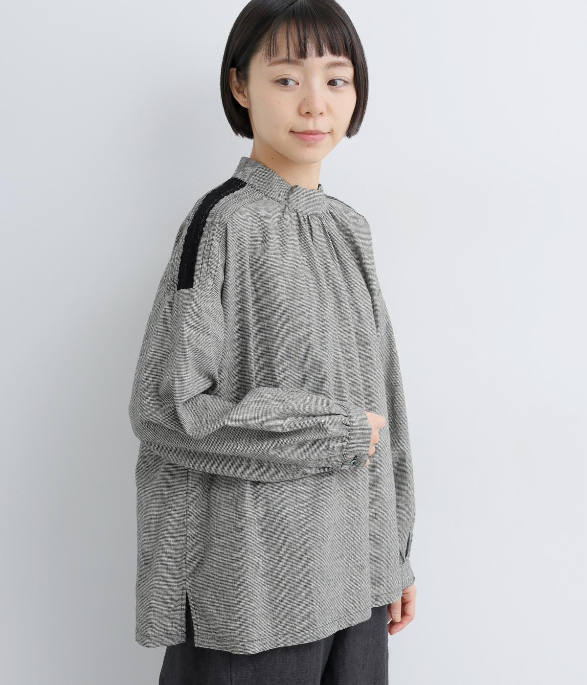 肩のピンタックとレース使いでほんのりと甘さを添えたハイネックブラウス。前ネック下にギャザーを入れて、ふんわりとしたゆとりのあるシルエットに仕上げました。後ろのボタン開き仕様が着脱をアシスト。抜け感を演出する裾のサイドスリットもポイントです。