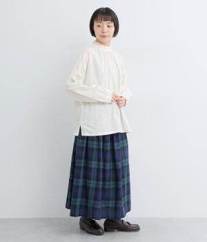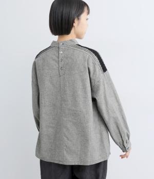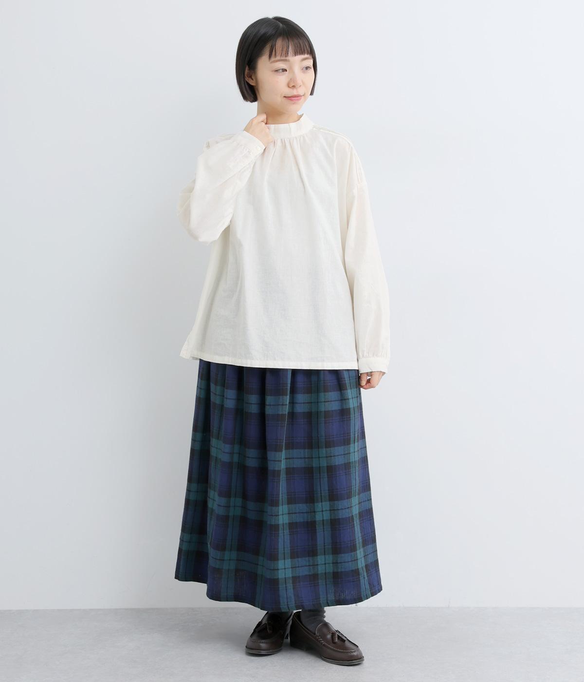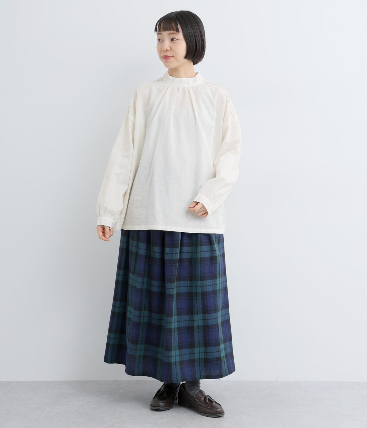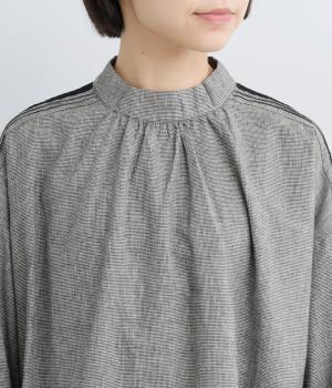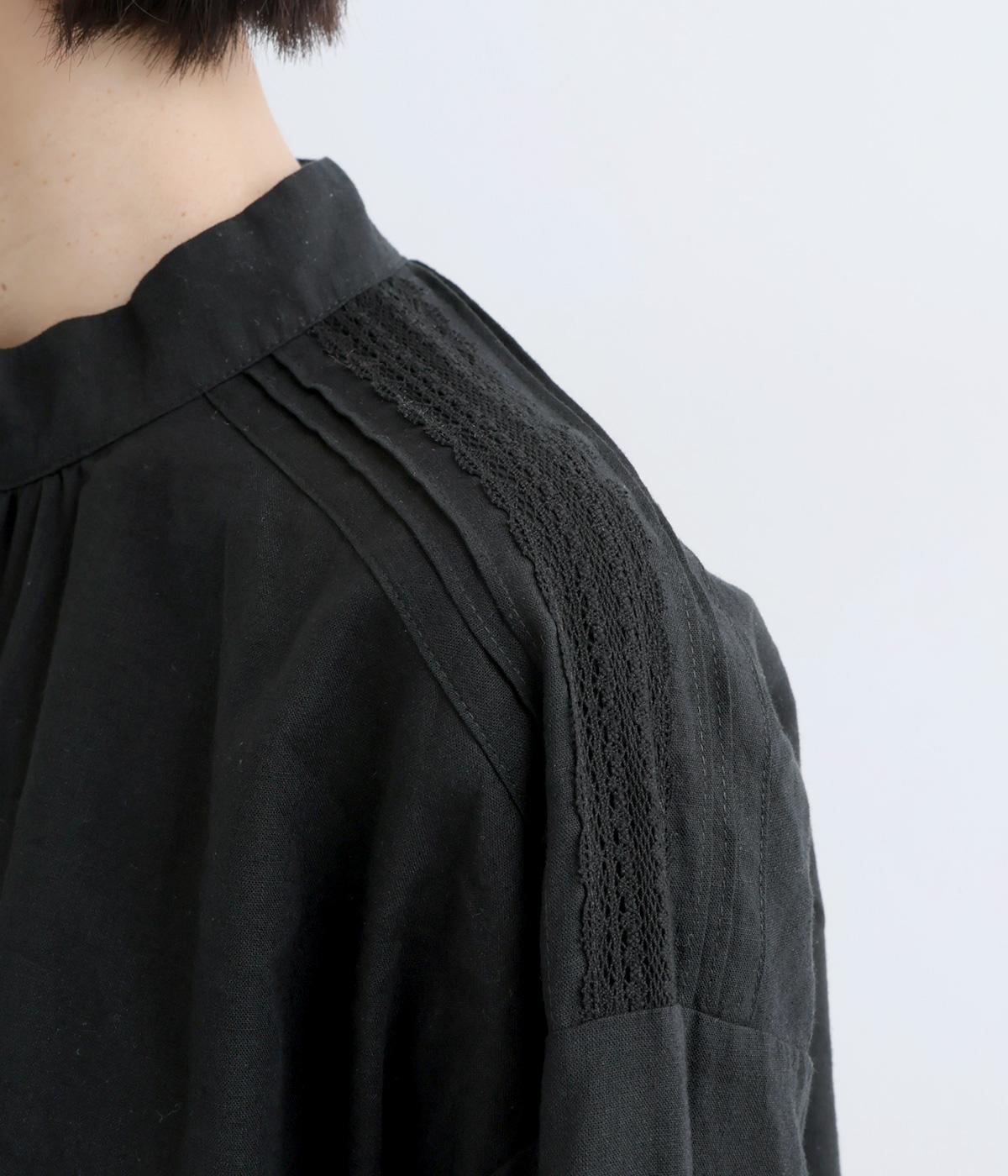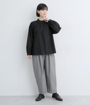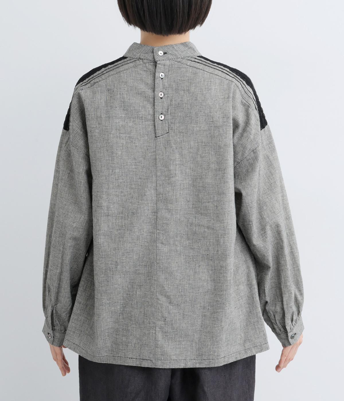 肩のピンタックとレース使いでほんのりと甘さを添えたハイネックブラウス。前ネック下にギャザーを入れて、ふんわりとしたゆとりのあるシルエットに仕上げました。後ろのボタン開き仕様が着脱をアシスト。抜け感を演出する裾のサイドスリットもポイントです。