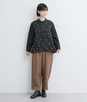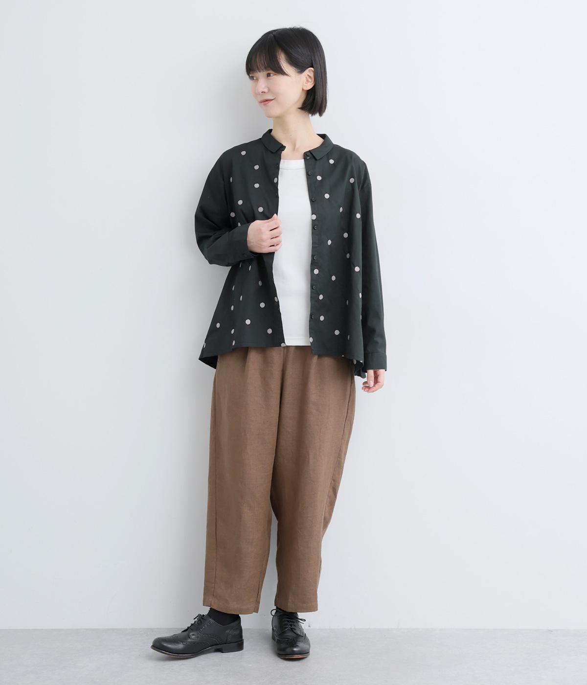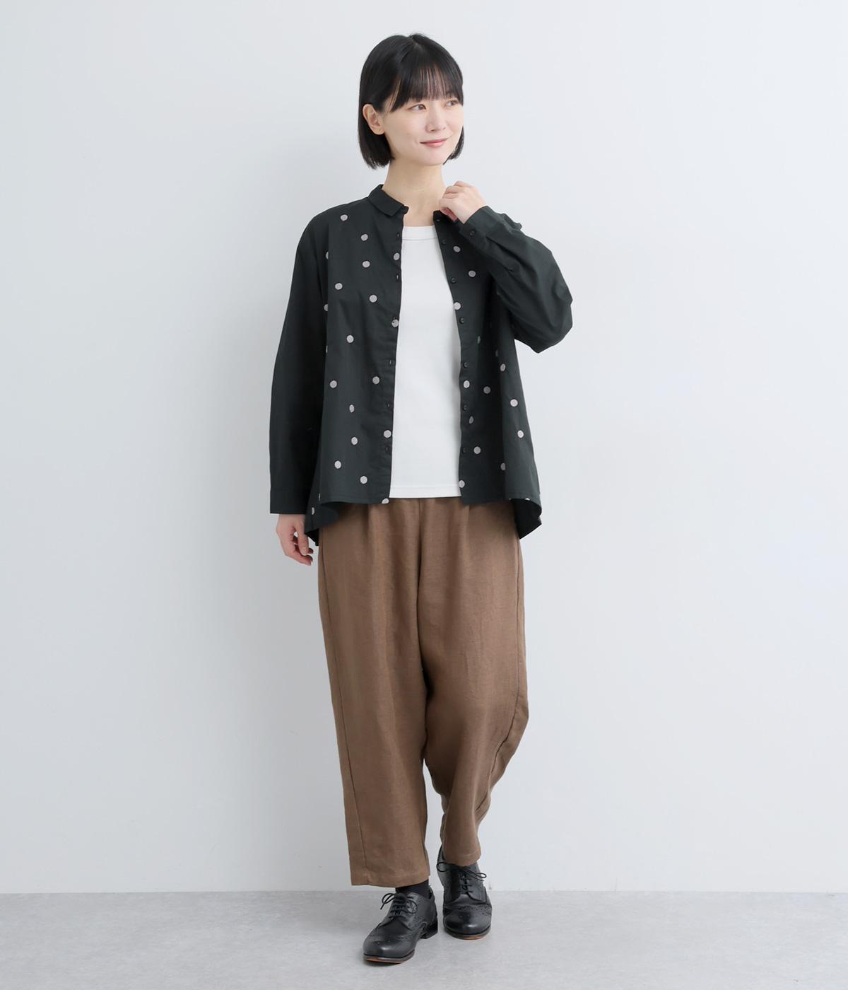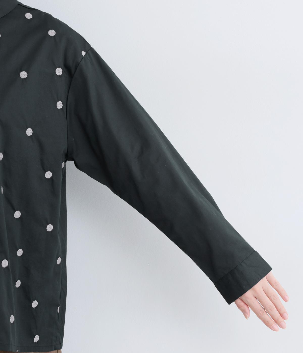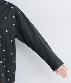 肌にまとわりつかないさらりとしたコットン生地です。やわらかな風合いに適度なハリをプラスして、きちんと感のあるルックスに。前身頃の生地にはドット刺しゅうを施しています。