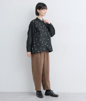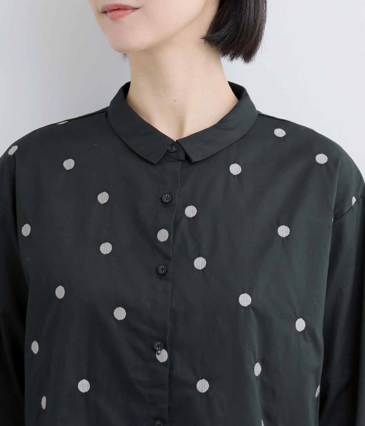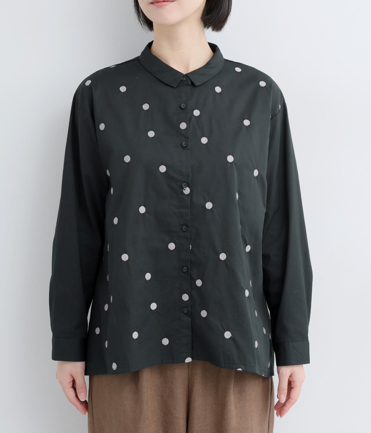 前身頃のドット刺しゅうが大人かわいいブラウス。無地の部分を多くすることで適度な甘さに仕上げています。後ろヨーク下に細かなギャザーをあしらって後ろ姿も華やかに。緩やかにラウンドした裾ラインもポイントです。