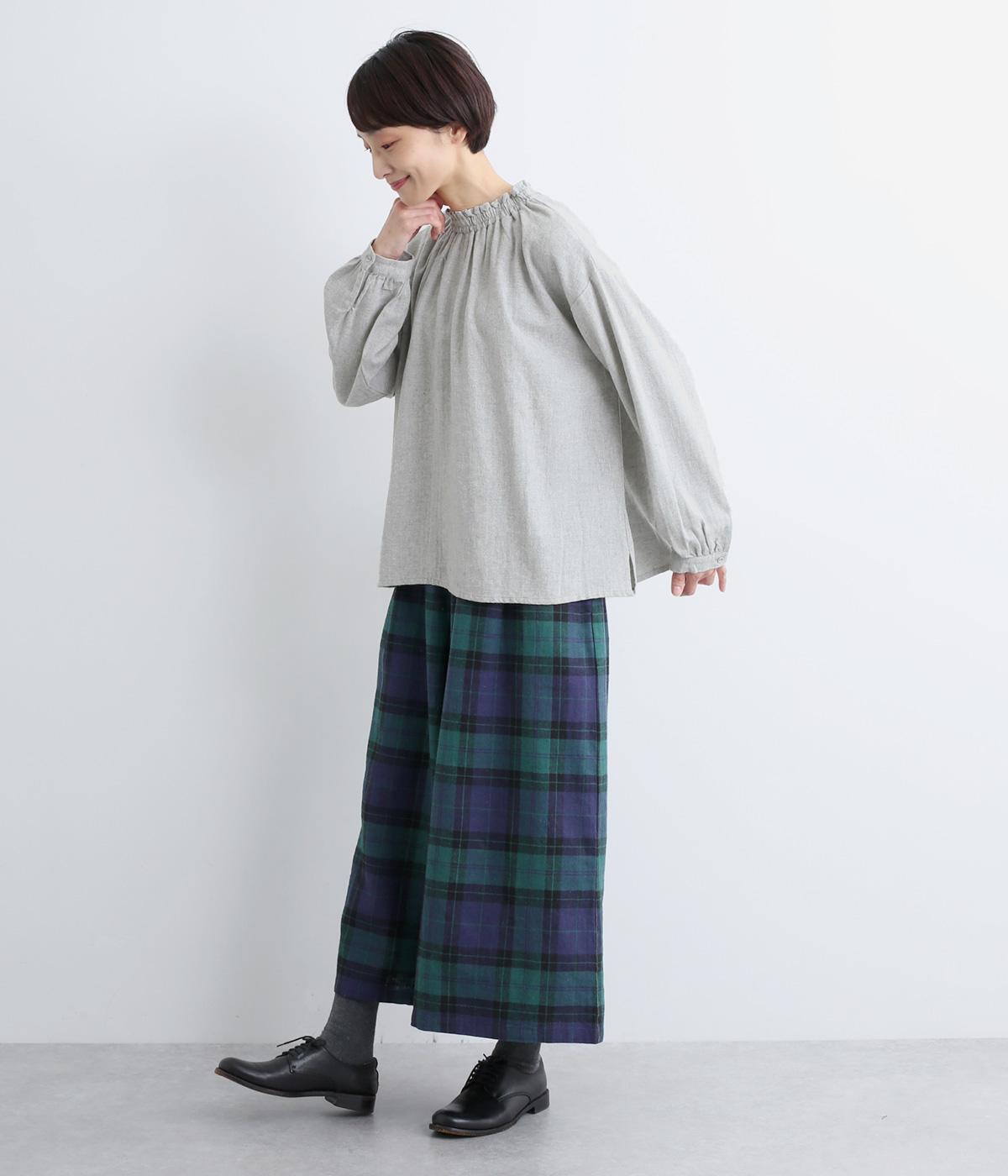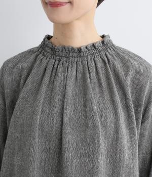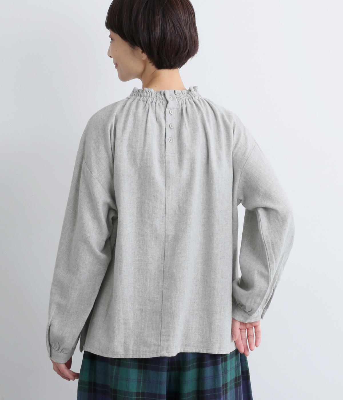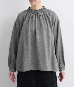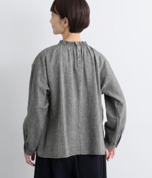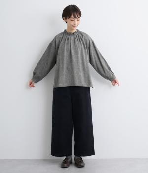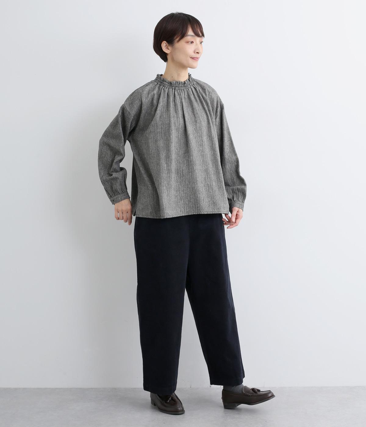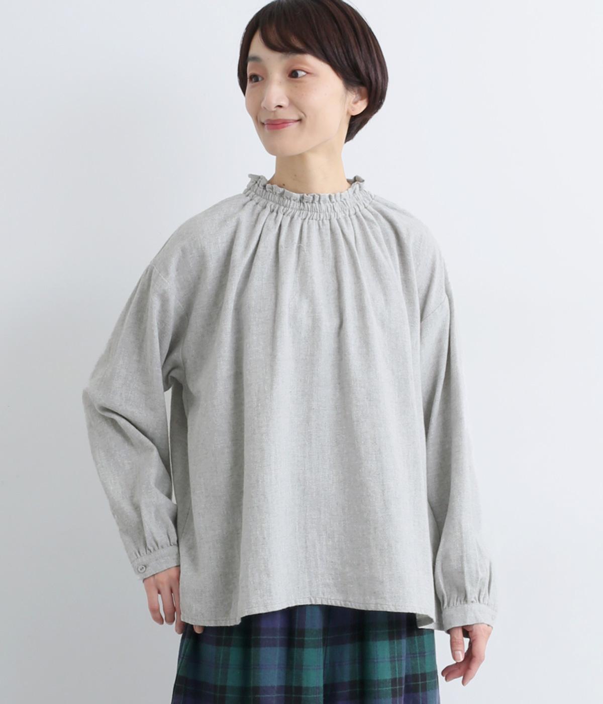 ほっこりとしたあたたかみのある生地とフリル襟でやさしい印象に仕立てたブラウス。襟ぐりはゴム仕様で被りやすく、袖もギャザーを寄せてふわりとさせています。すっきりカットした裾まわりはスリット入りでボトム合わせも◎。