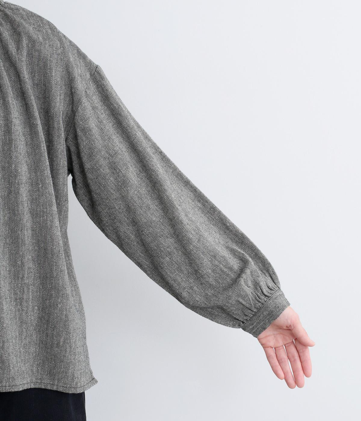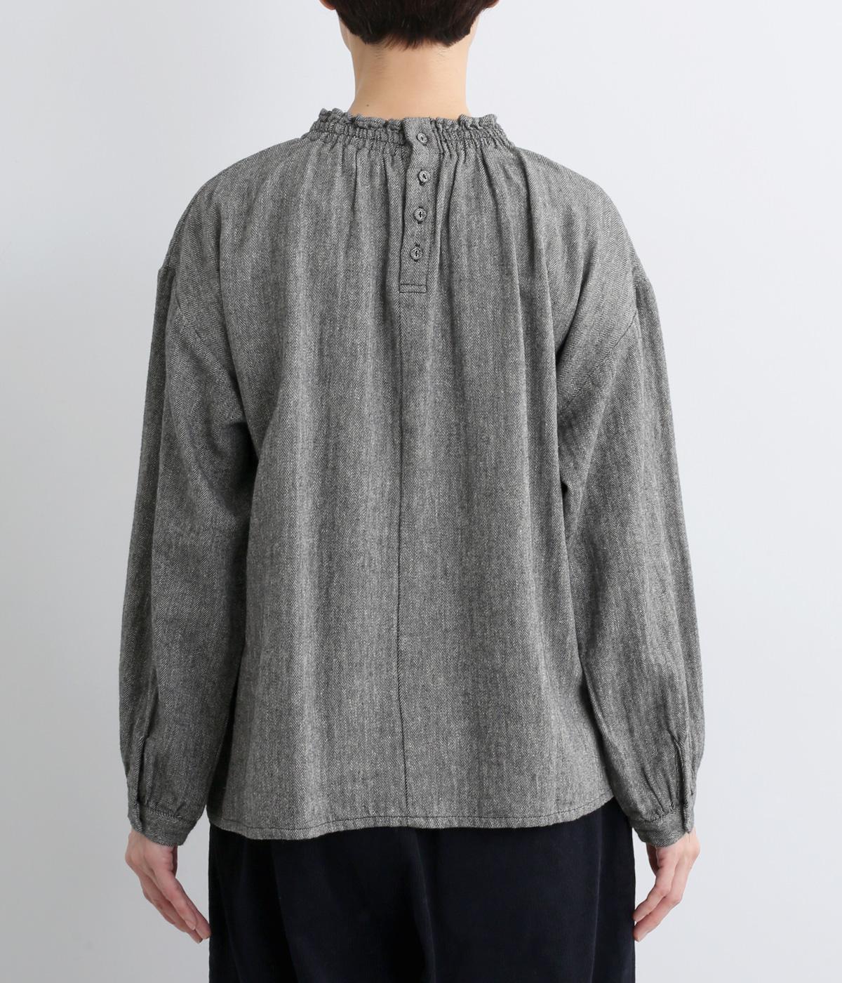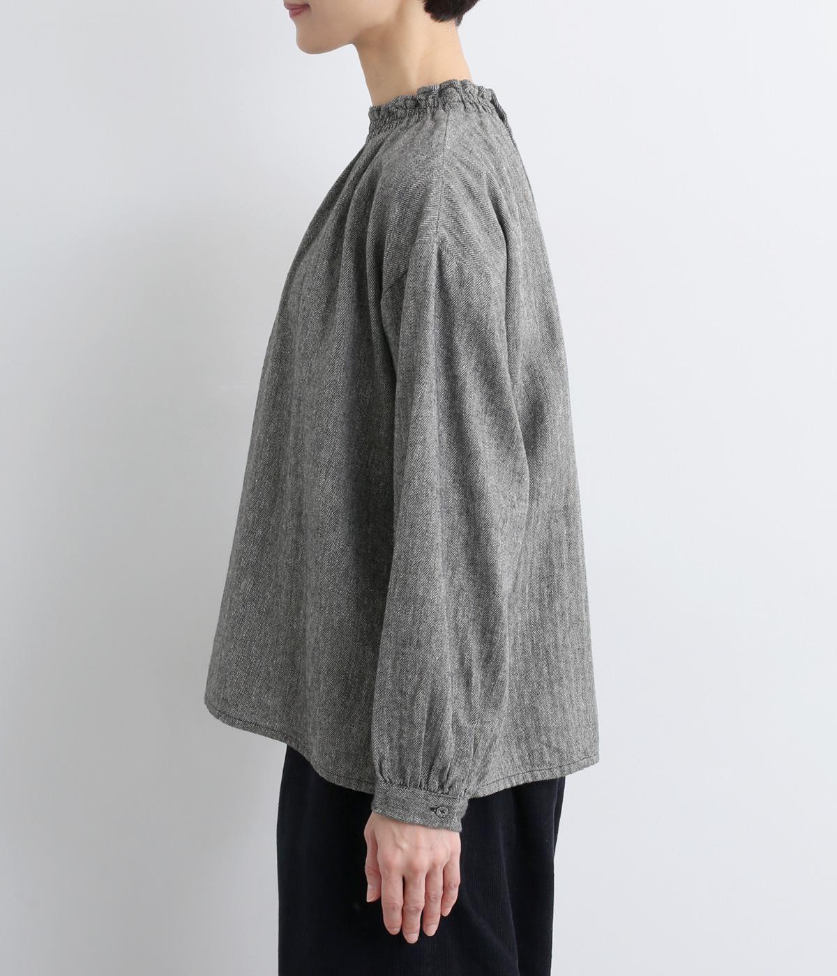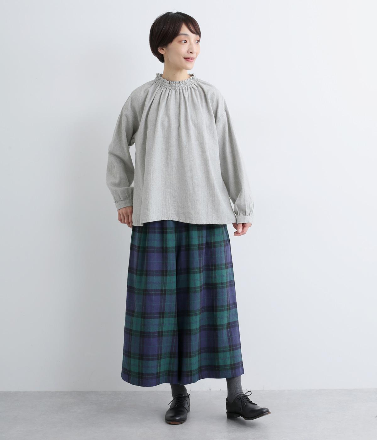ほっこりとしたあたたかみのある生地とフリル襟でやさしい印象に仕立てたブラウス。襟ぐりはゴム仕様で被りやすく、袖もギャザーを寄せてふわりとさせています。すっきりカットした裾まわりはスリット入りでボトム合わせも◎。