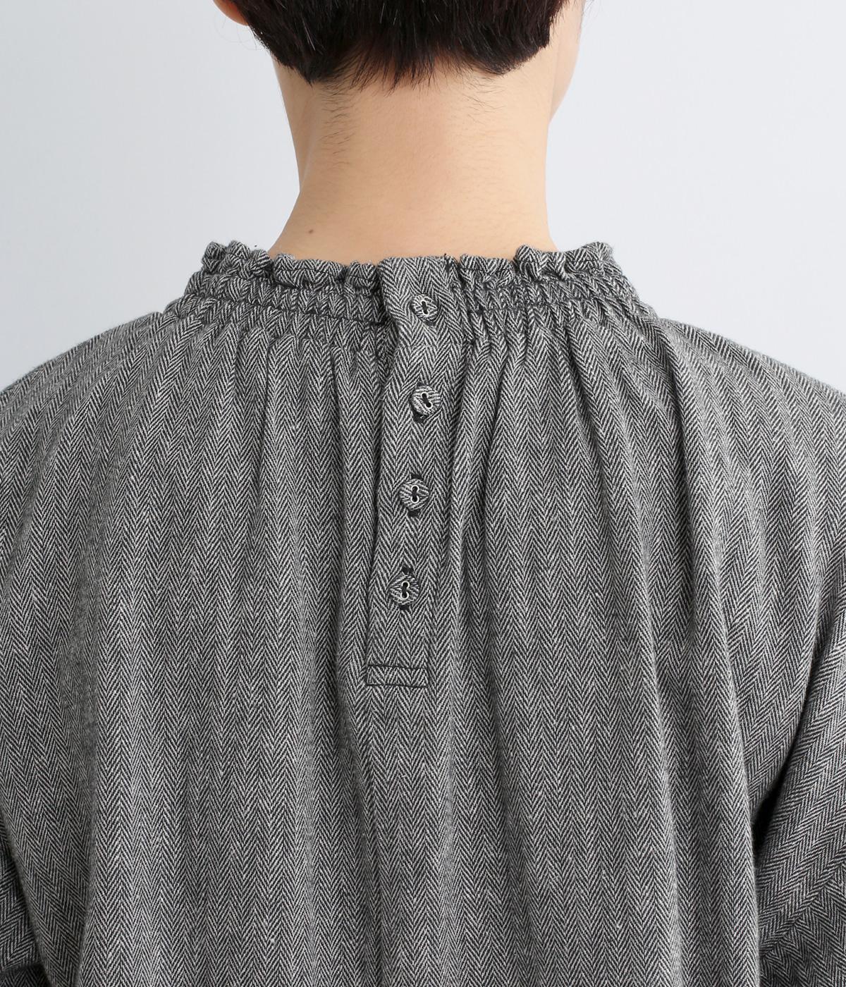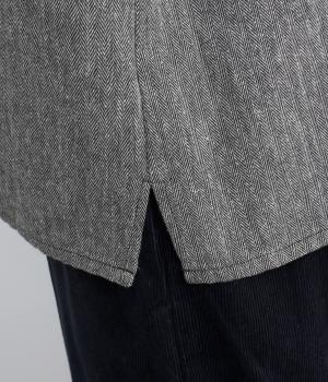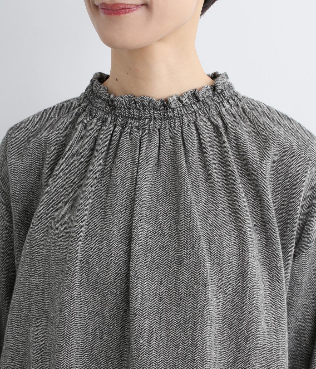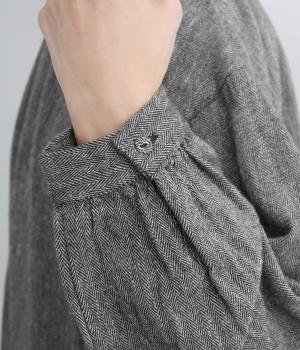 コットンにリネンをまぜ、ほのかに起毛をかけてあたたかみと優しい風合いをつけたヘリンボーン生地を使用。適度にふくらみのある中厚手生地で着こなしやすい生地感です。