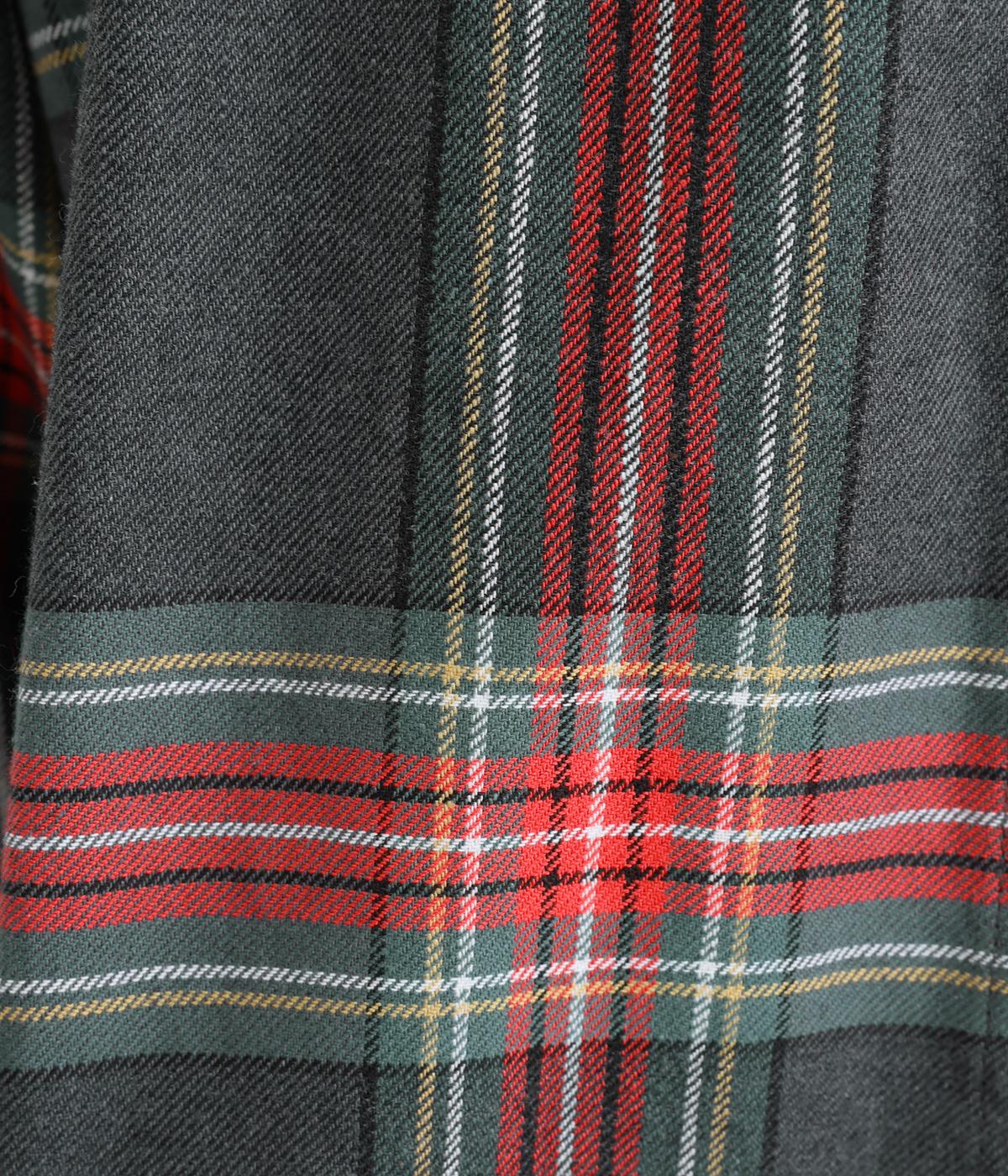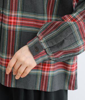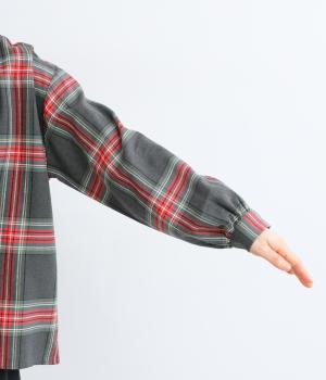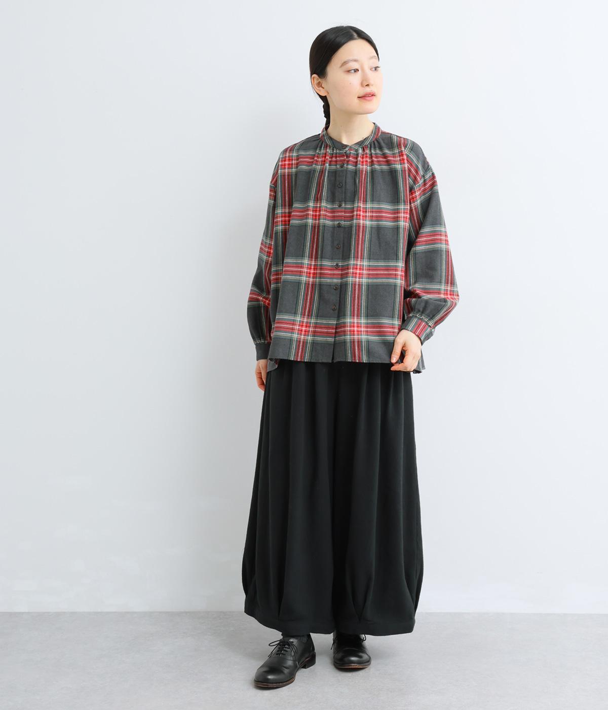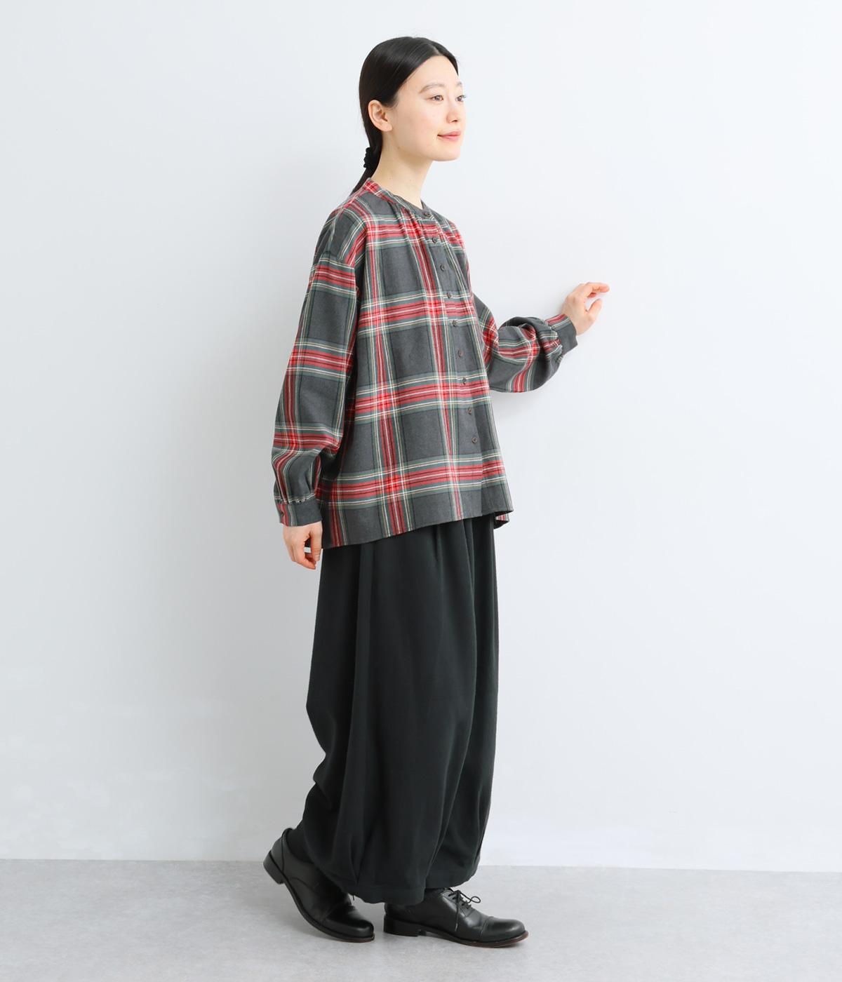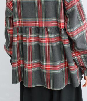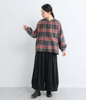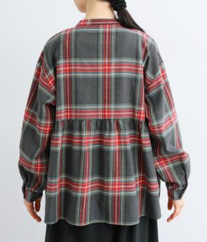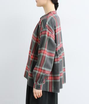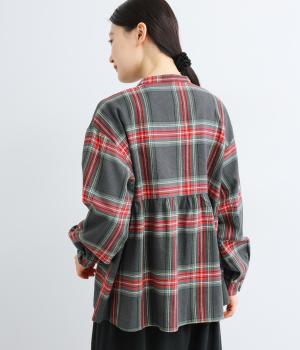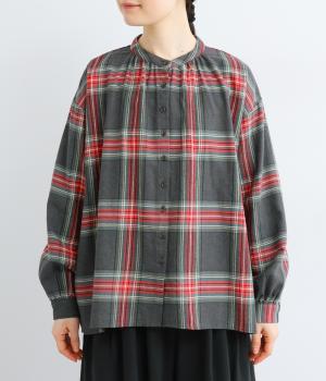 大きめのチェック柄が映えるコットンリネンブラウス。首元の控えめなギャザーとバンドカラーで上品に。背面下部のギャザーがふんわりとしたシルエットを生み、後ろ姿を女性らしい印象に仕上げます。
