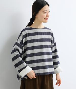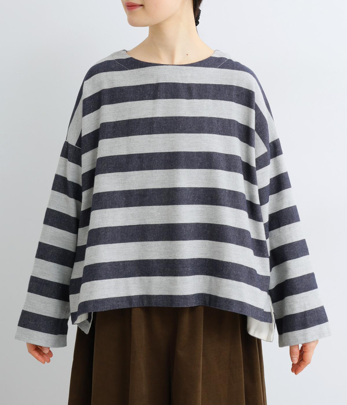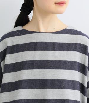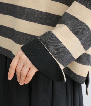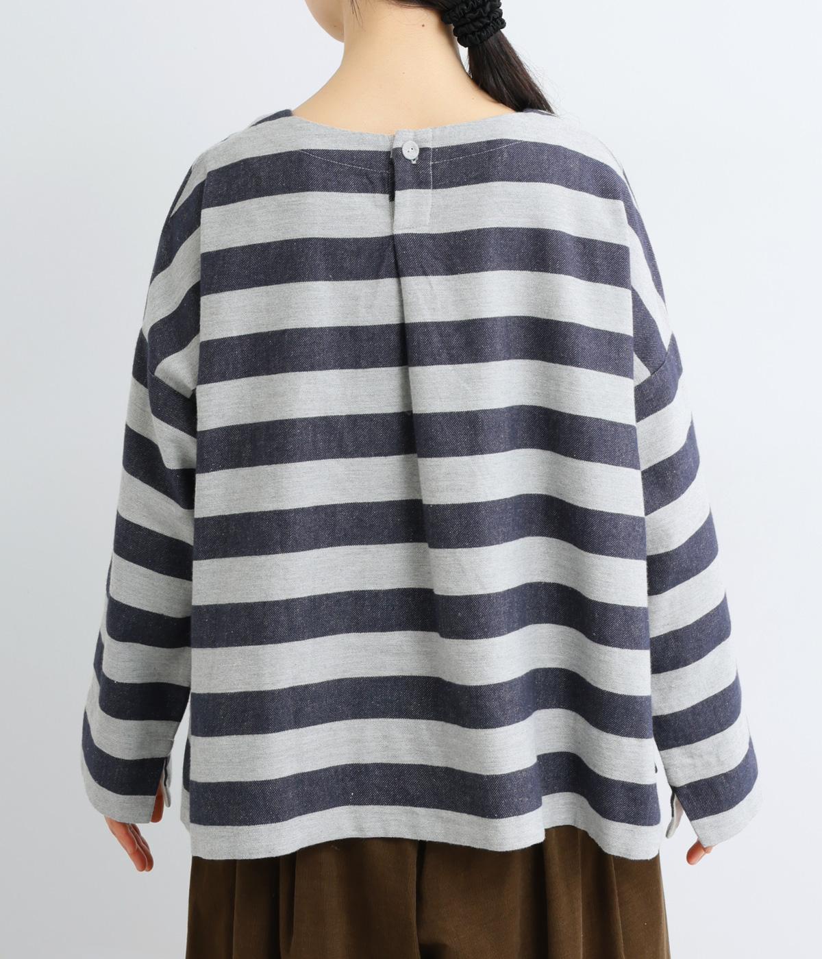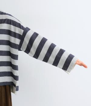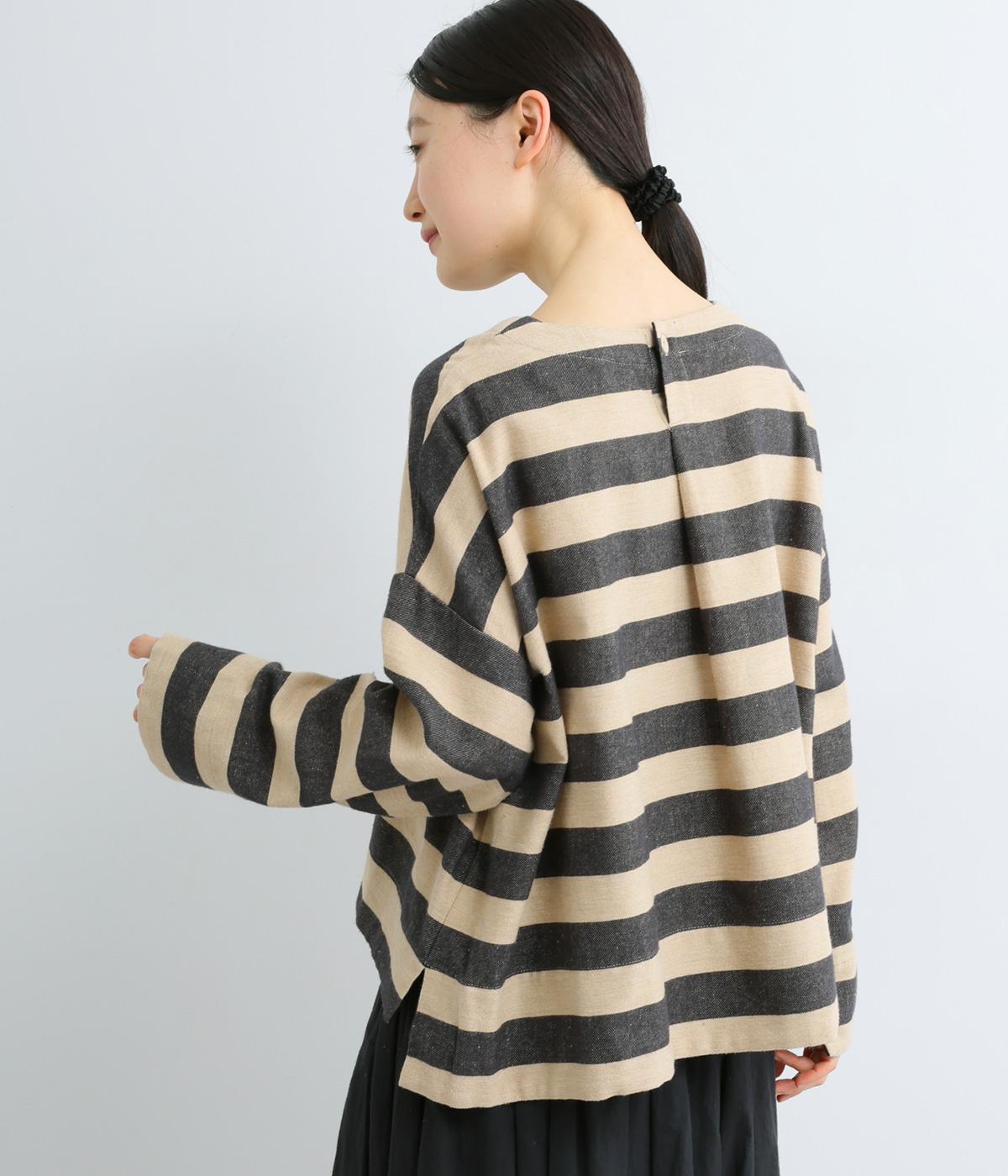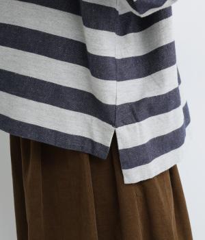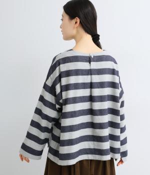 太めボーダーが映えるコットンリネンブラウス。ゆったり身頃に前後差のある着丈とサイドスリットで抜け感を演出。袖や首元は広めで締め付け感がなく、リラックスして着用できます。後ろボタン下のひだが上品なアクセントに。