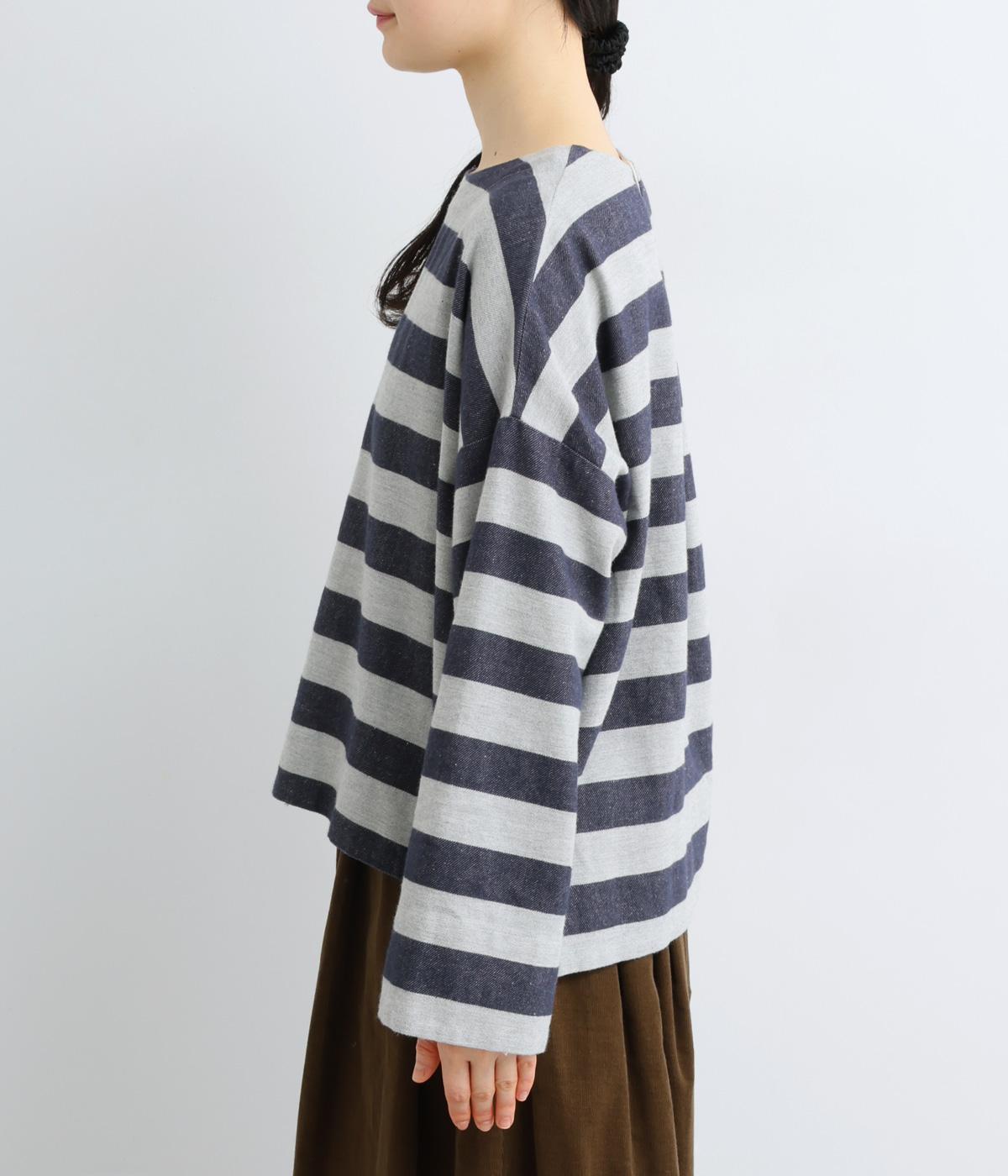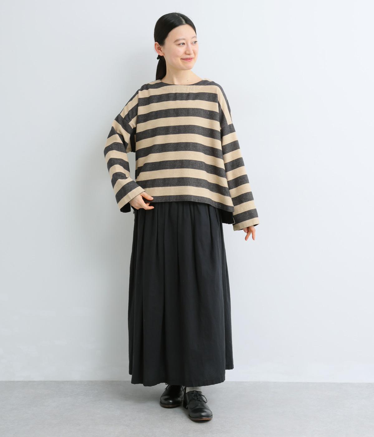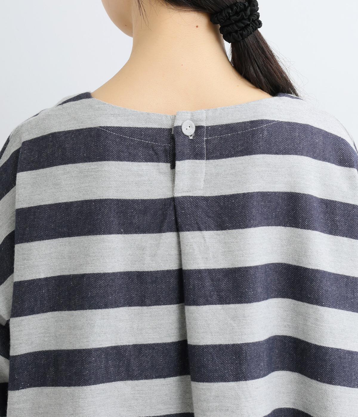 太めボーダーが映えるコットンリネンブラウス。ゆったり身頃に前後差のある着丈とサイドスリットで抜け感を演出。袖や首元は広めで締め付け感がなく、リラックスして着用できます。後ろボタン下のひだが上品なアクセントに。