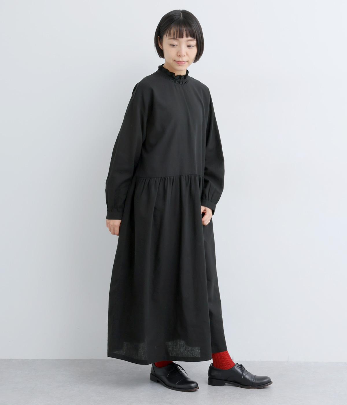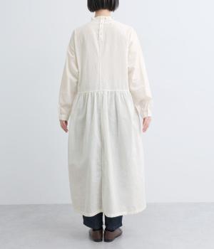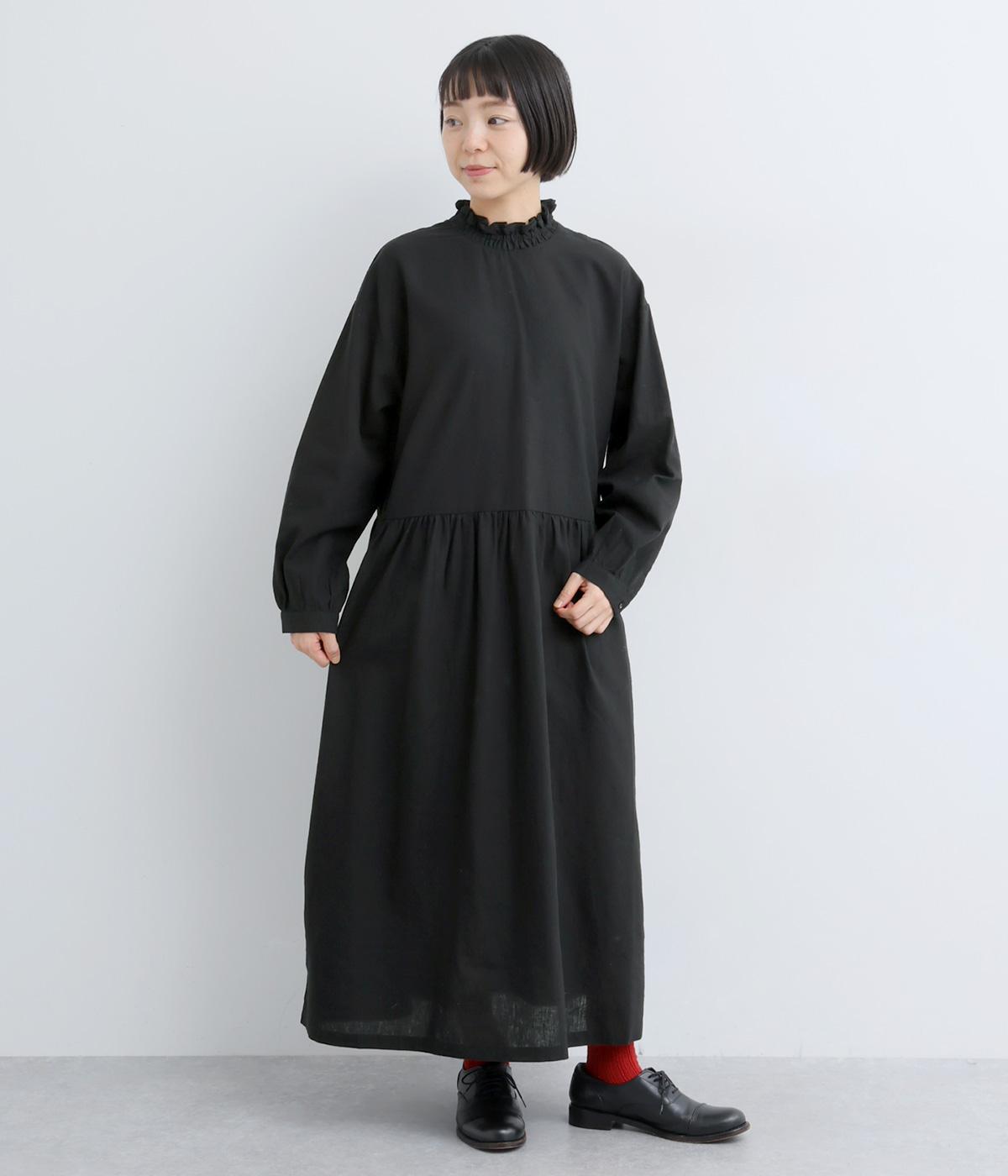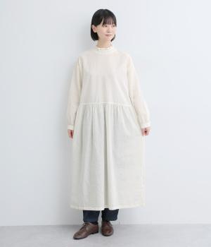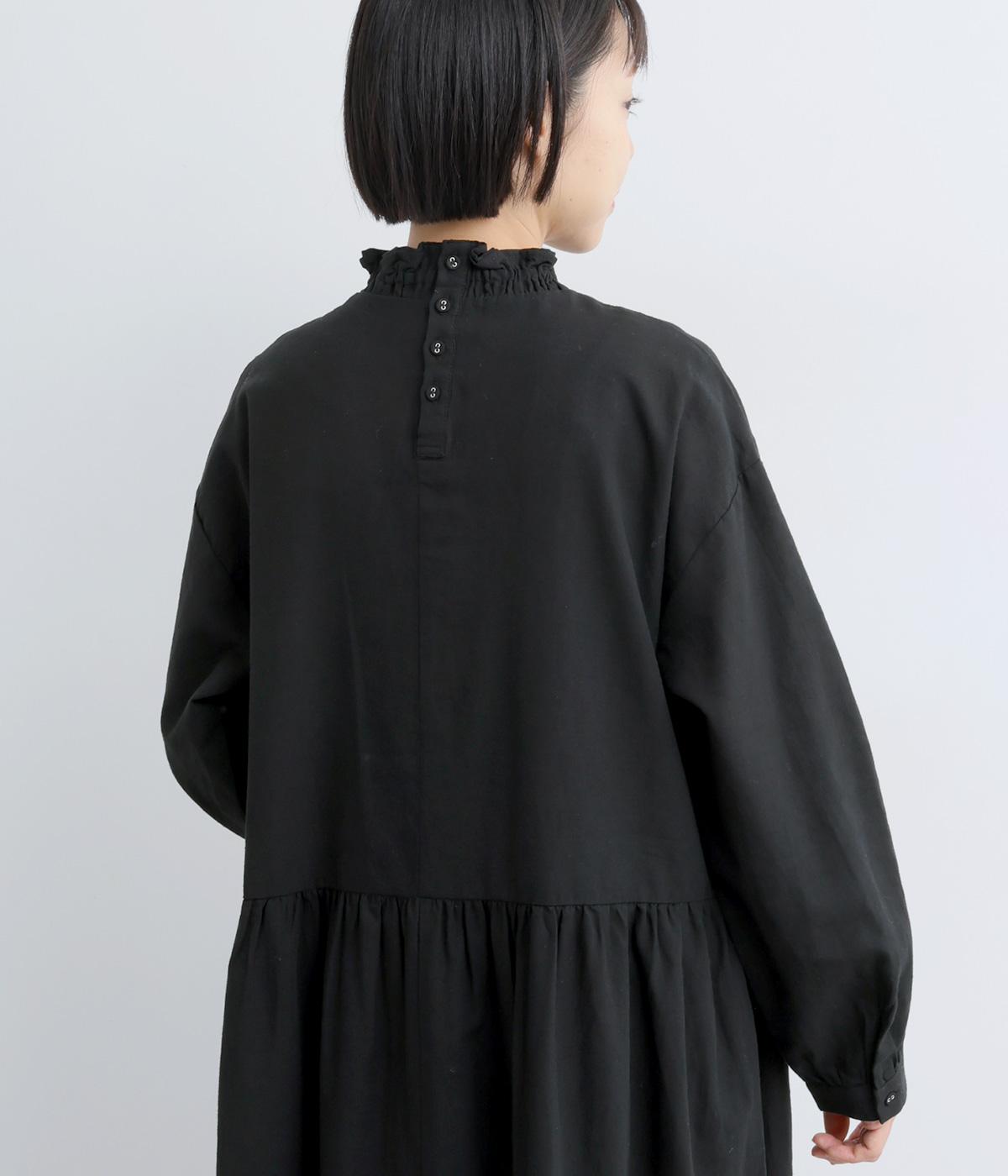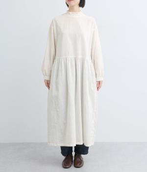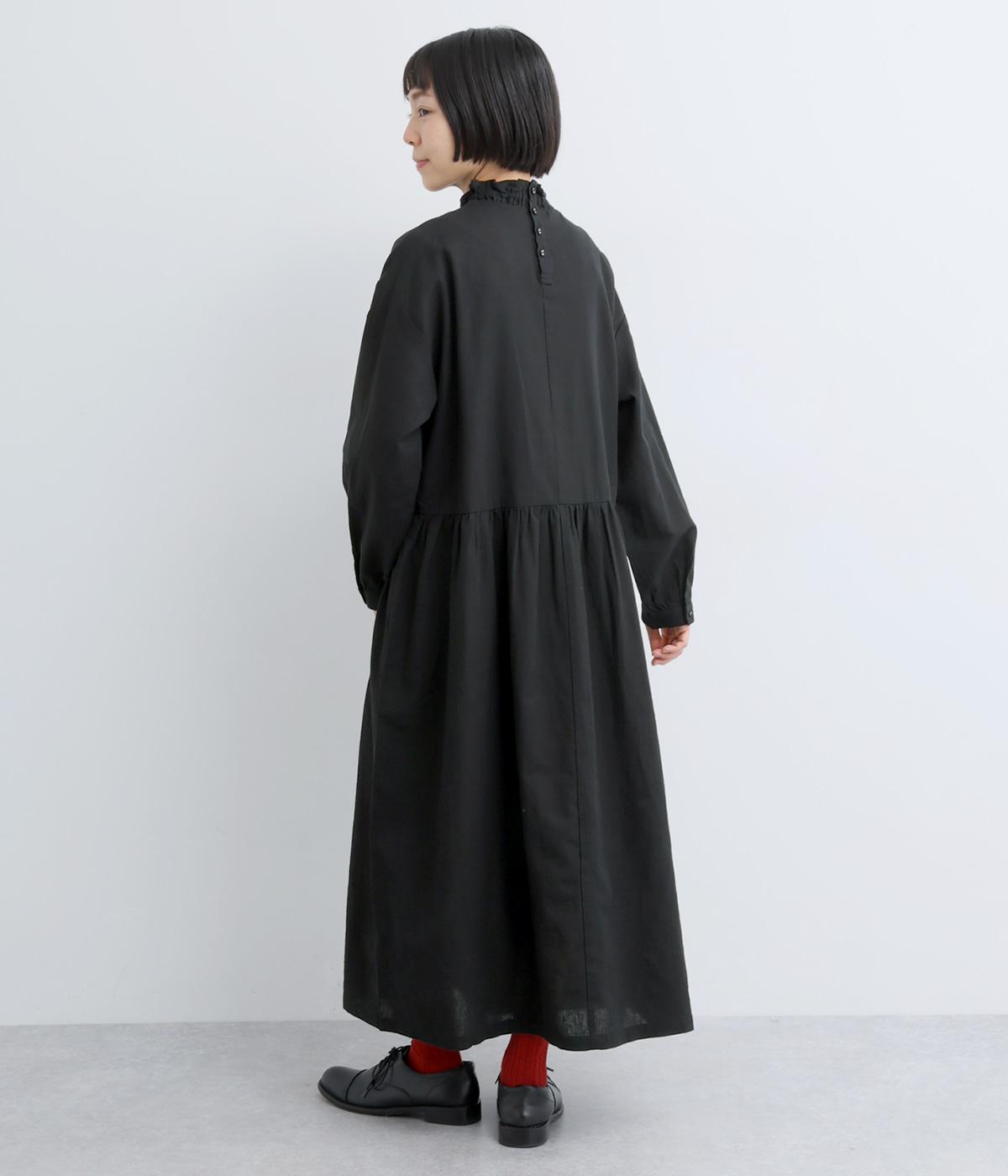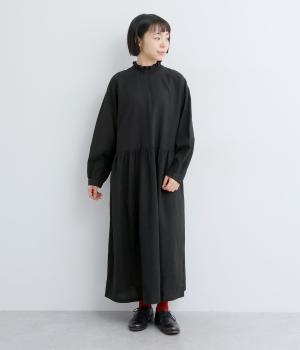 低めに立ち上げたネックにゴムシャーリングを入れ、愛らしいフリル襟に仕上げました。ウエスト位置の切り替えとギャザーでスカート部分にボリュームを出しフェミニンな印象に。着脱をアシストする後ろネックのボタン開き仕様もポイントです。