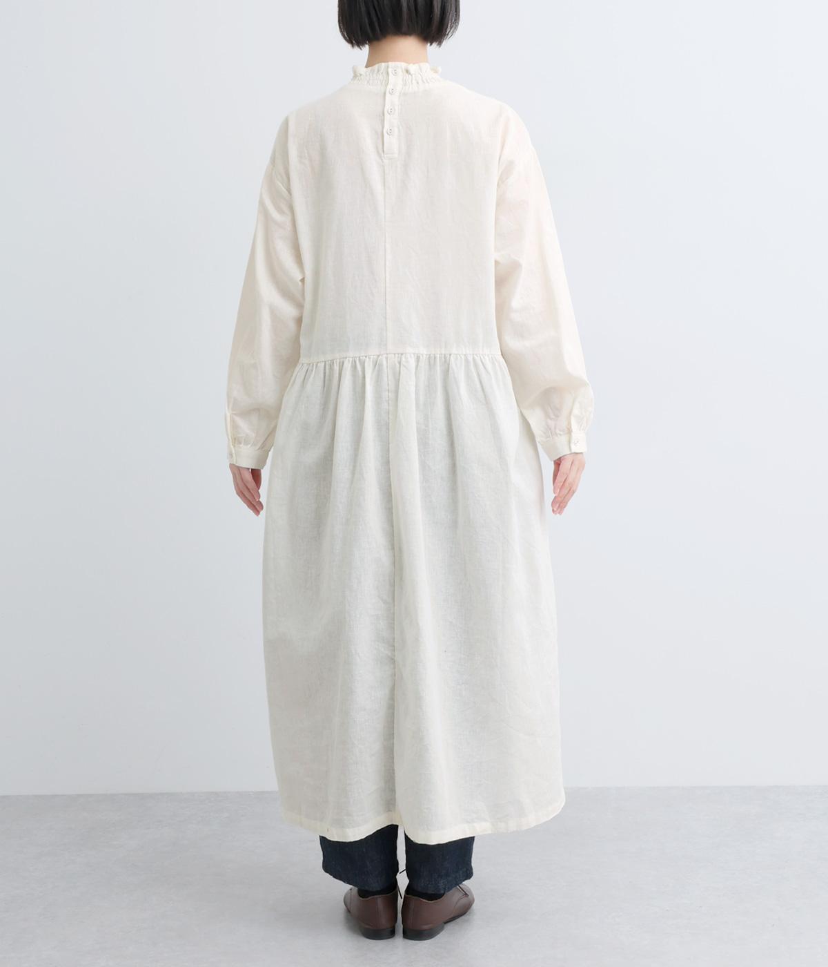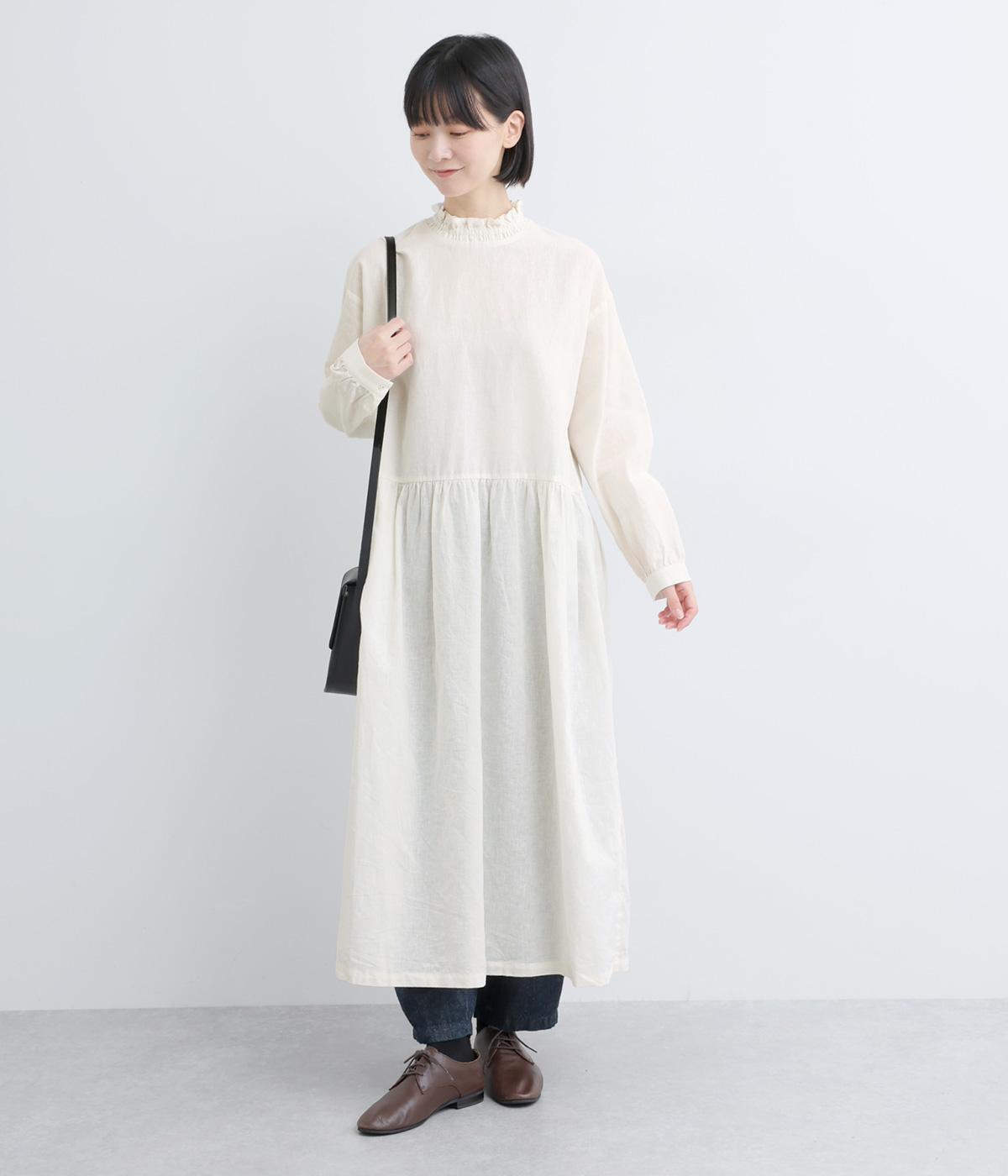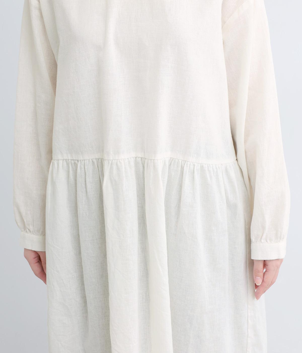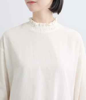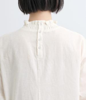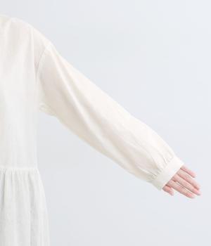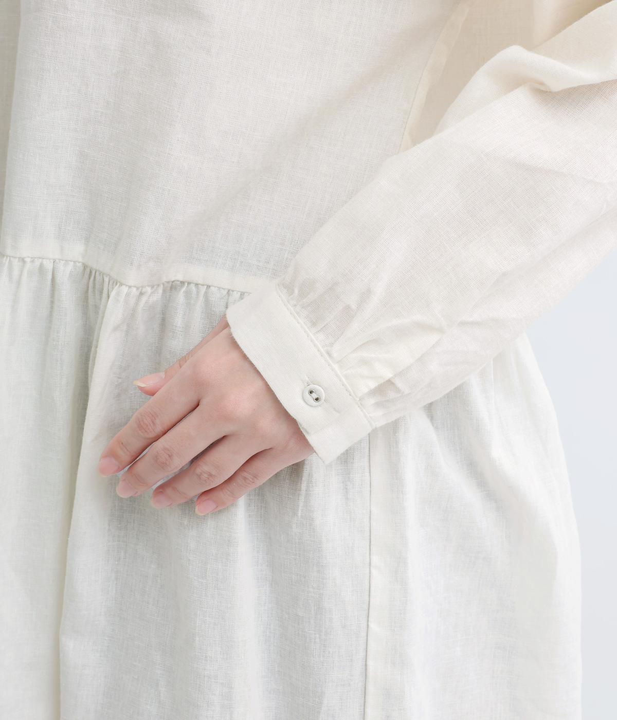リネンならではのシャリ感とハリのある綿麻生地です。やや薄手で軽やかな生地感なので、パンツとのレイヤードスタイルにもぴったり。上からニットやアウターも着やすくロングシーズンたのしめます。