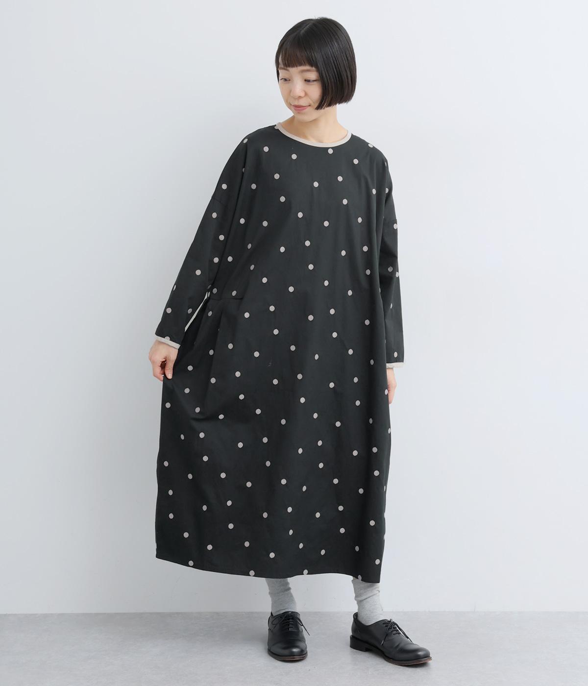 ドット刺しゅうをちりばめた大人かわいいワンピース。全体にゆとりを持たせつつ裾の広がりをおさえたコクーンシルエットで、子どもっぽさを軽減し上品に仕上げました。襟ぐりと袖口の配色パイピングがアクセントに。後ろの涙開き仕様が着脱をアシストしてくれます。