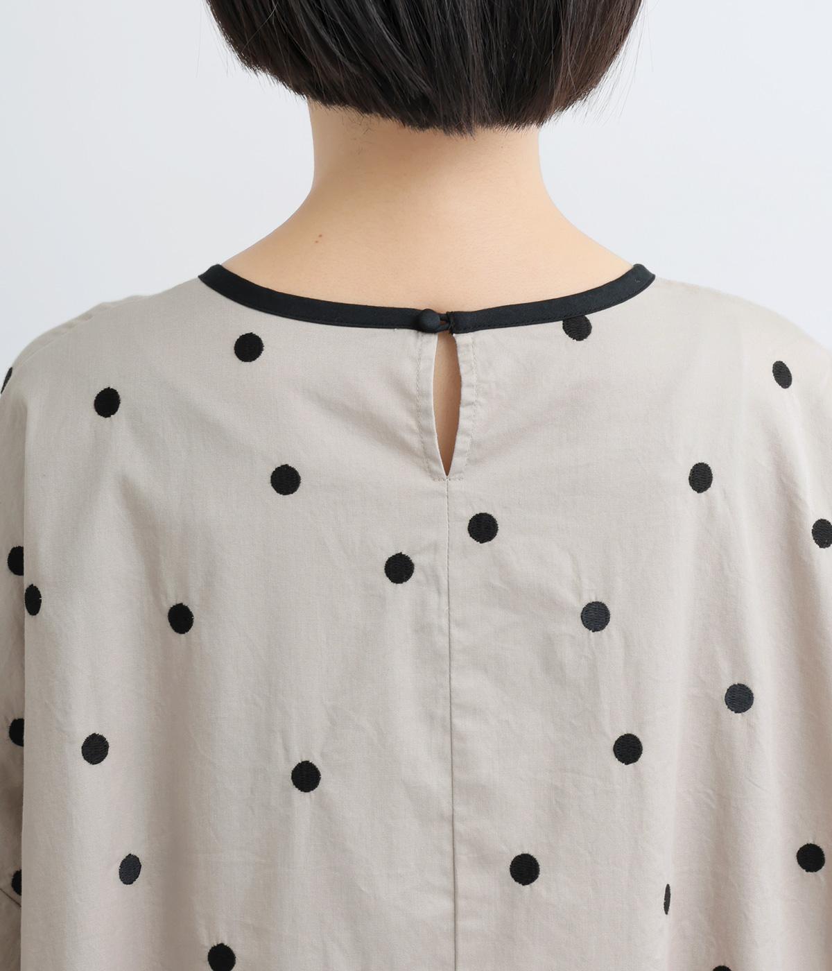 肌にまとわりつかないさらりとしたコットン生地です。やわらかな風合いに適度なハリをプラスして、きちんと感のあるルックスに。ドット刺しゅうを施して華やかに仕上げました。