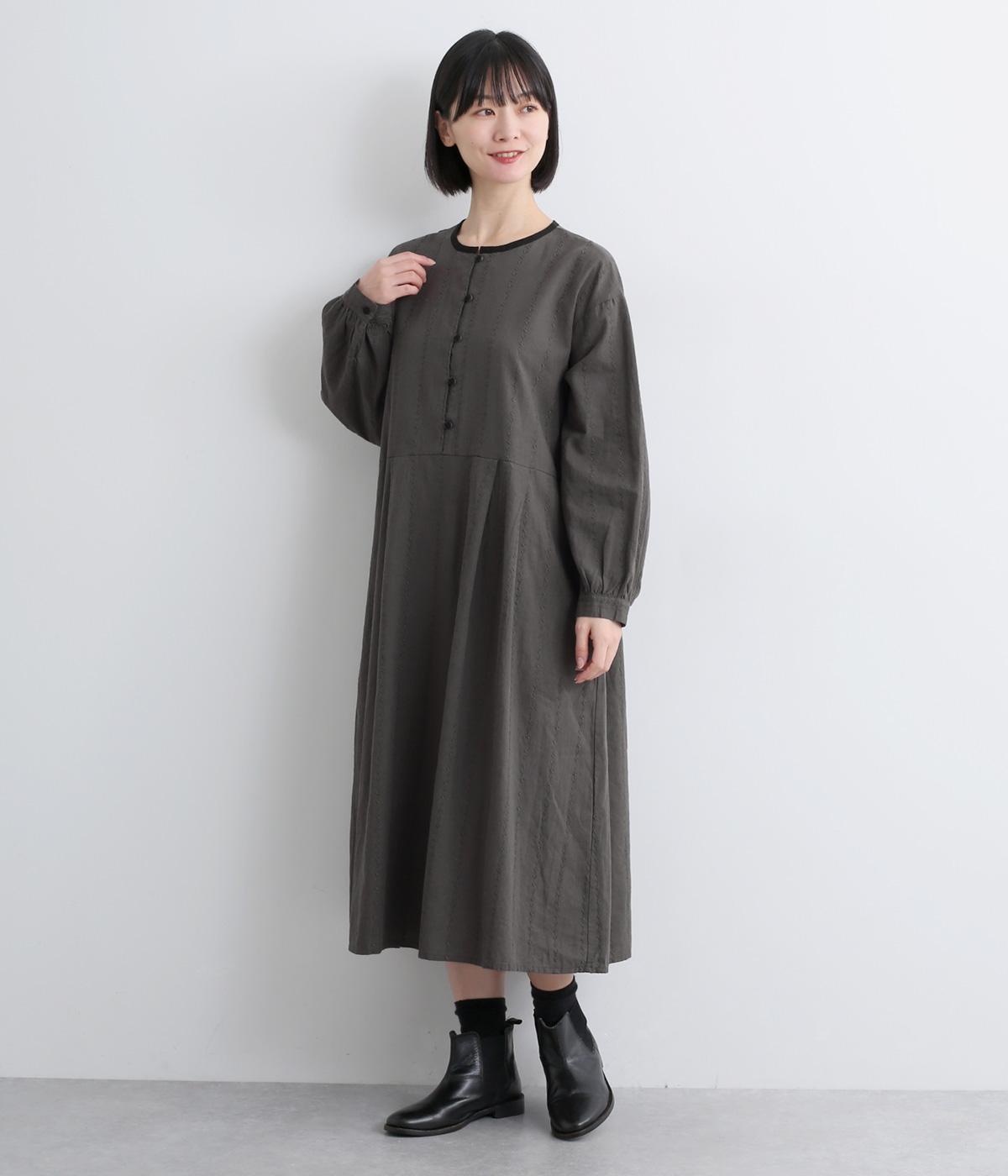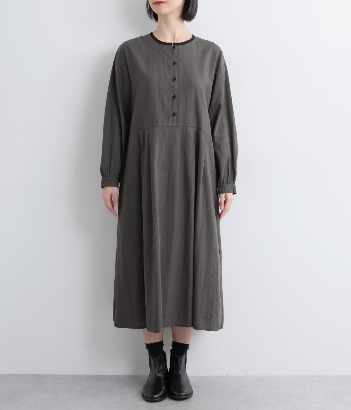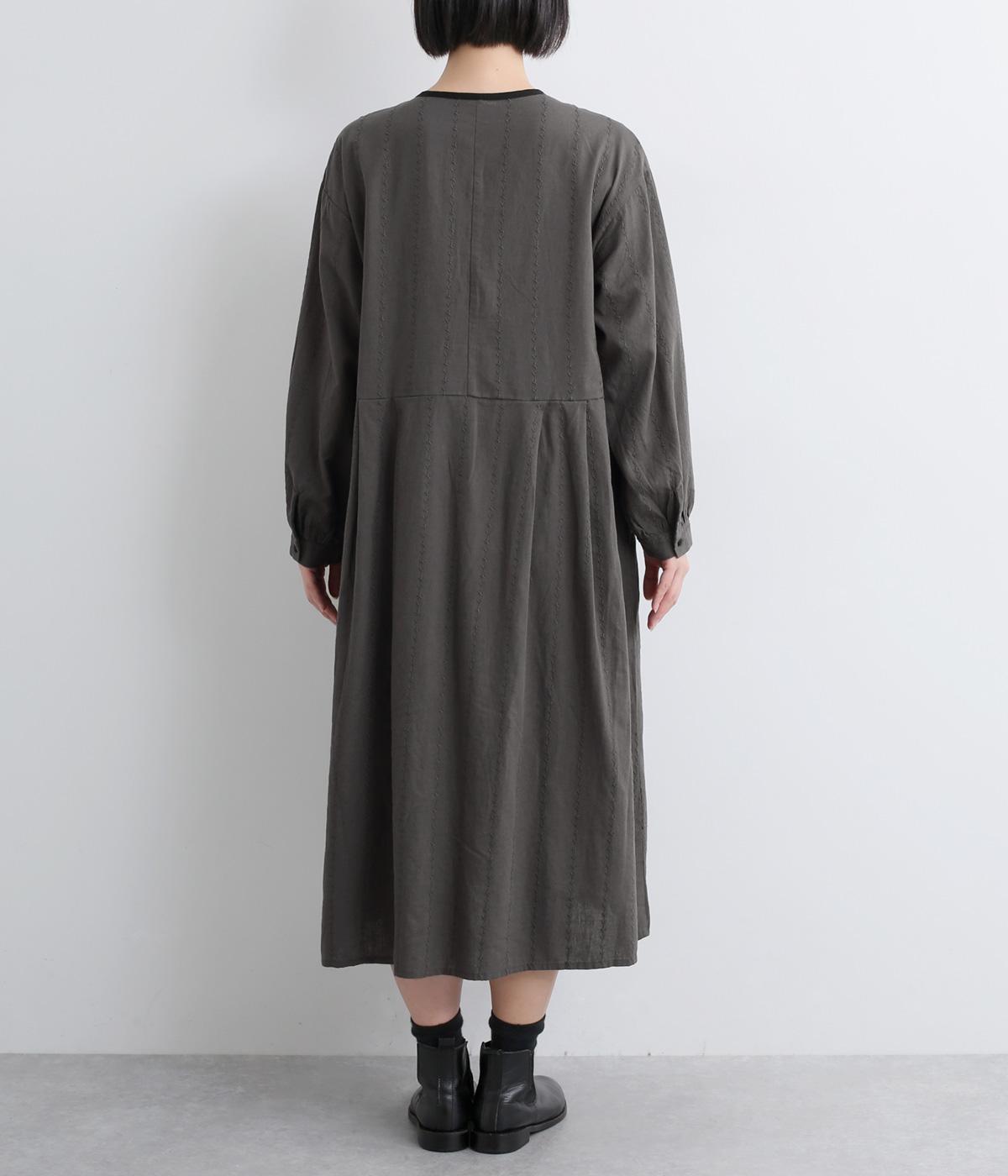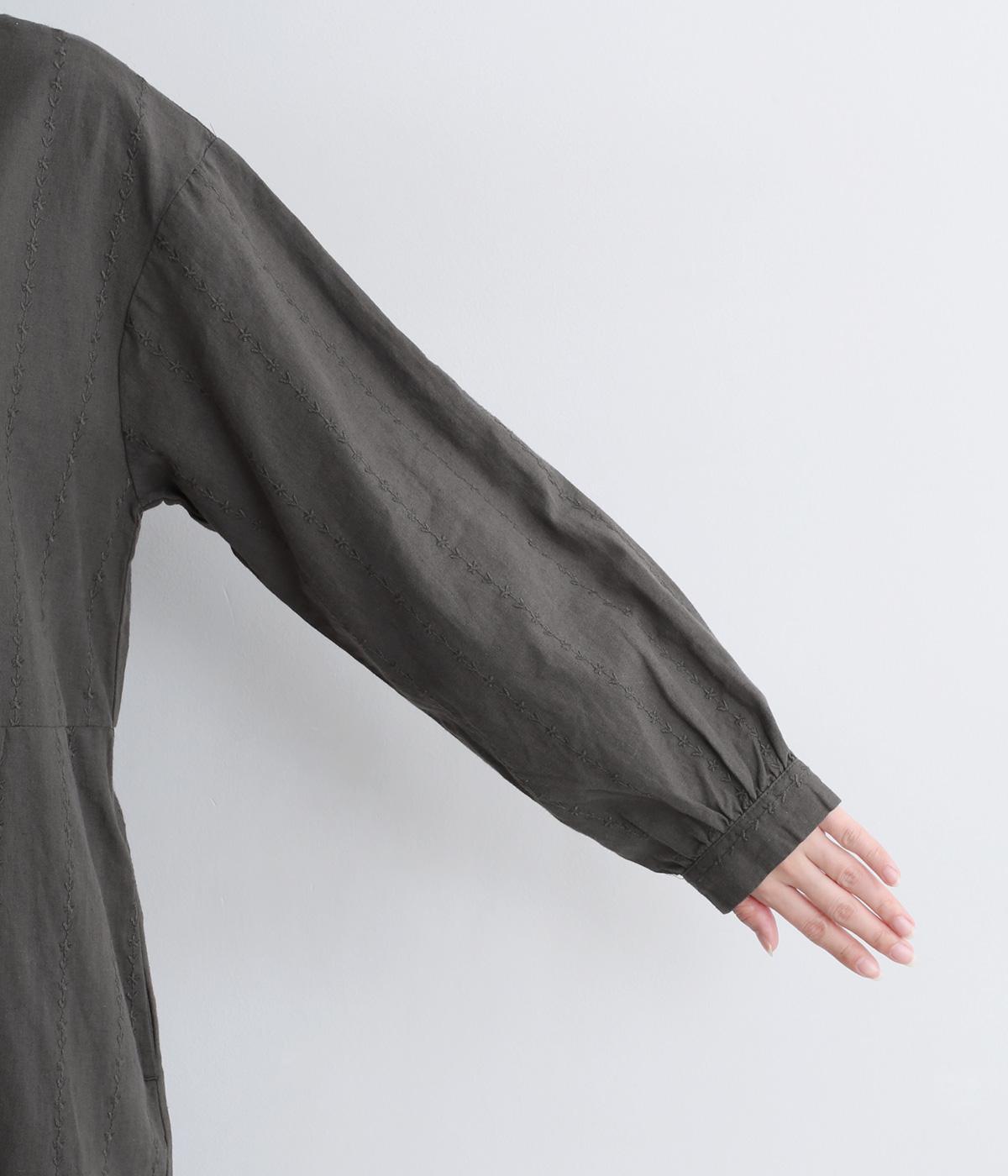 刺しゅうラインを贅沢に全面にほどこしつつ、同色糸でまとまりよく仕立てたワンピース。切り替えタックやふわりとした袖が大人ガーリーな雰囲気。襟ぐりやボタンの配色をきかせてさり気なくメリハリをつけています。