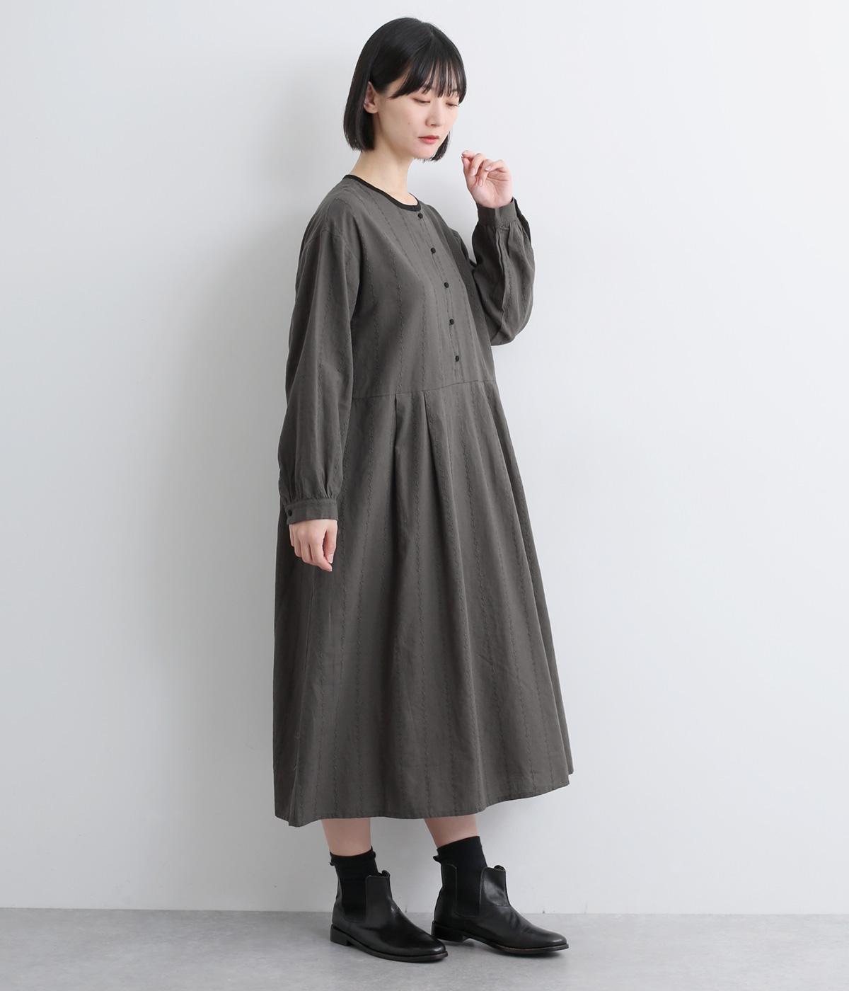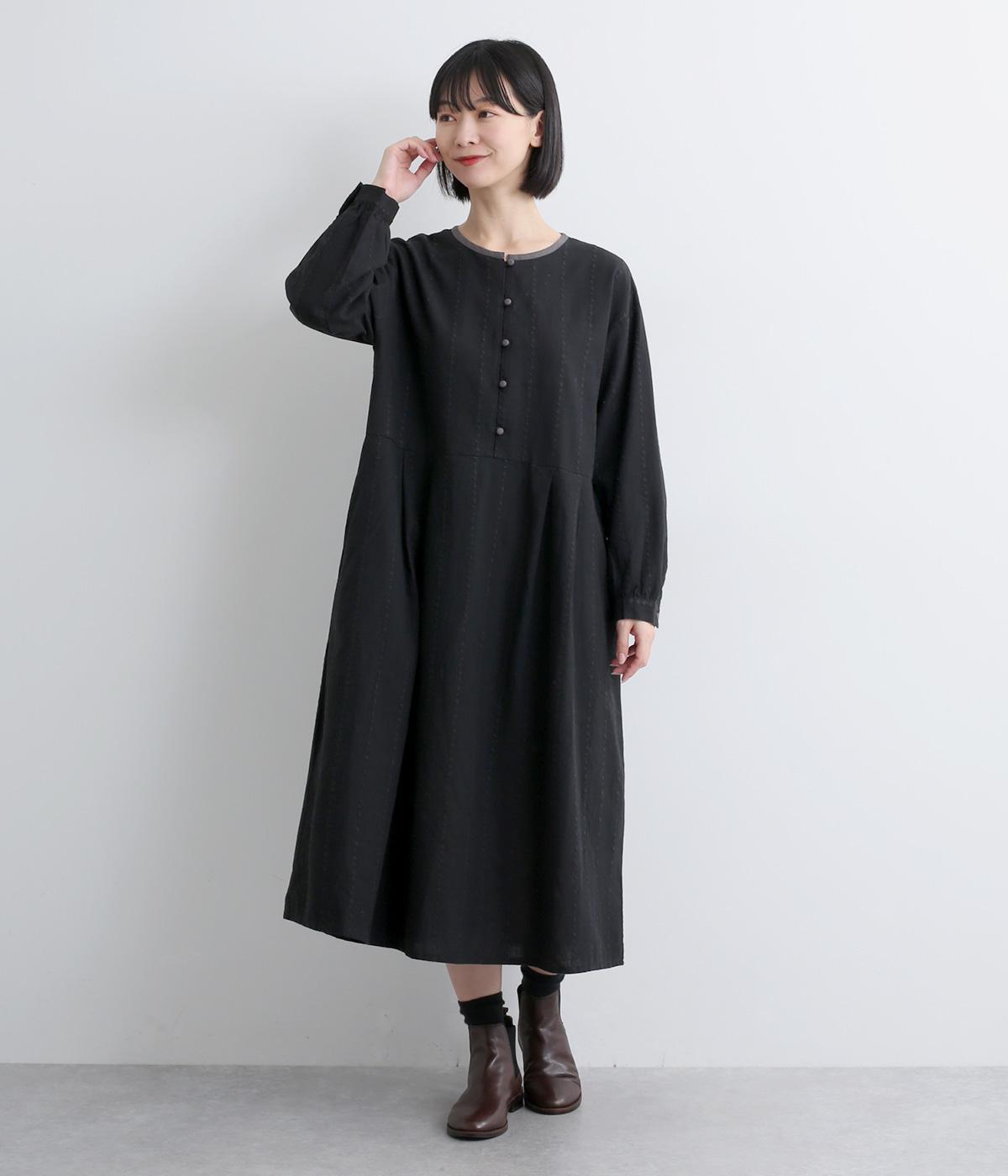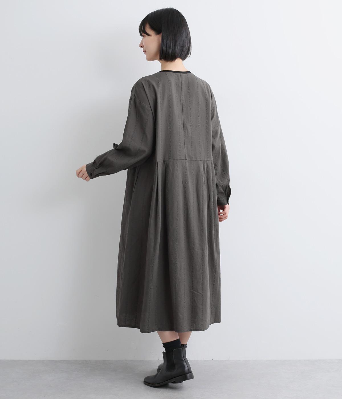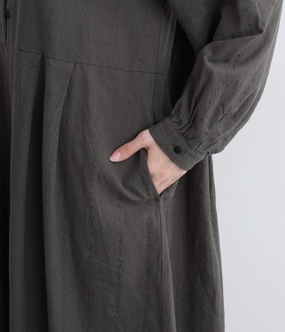 刺しゅうラインを贅沢に全面にほどこしつつ、同色糸でまとまりよく仕立てたワンピース。切り替えタックやふわりとした袖が大人ガーリーな雰囲気。襟ぐりやボタンの配色をきかせてさり気なくメリハリをつけています。