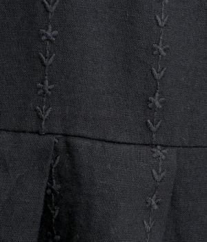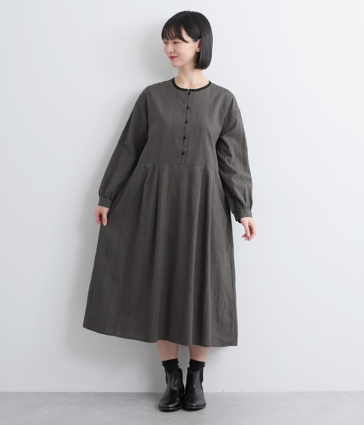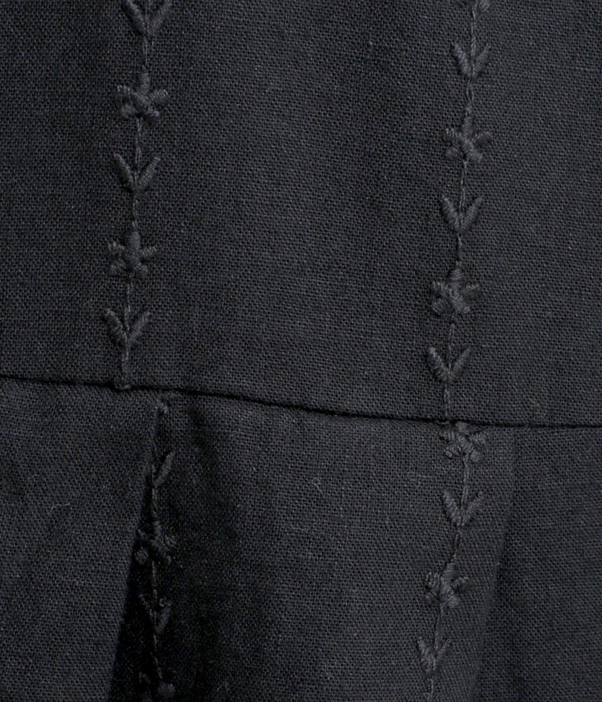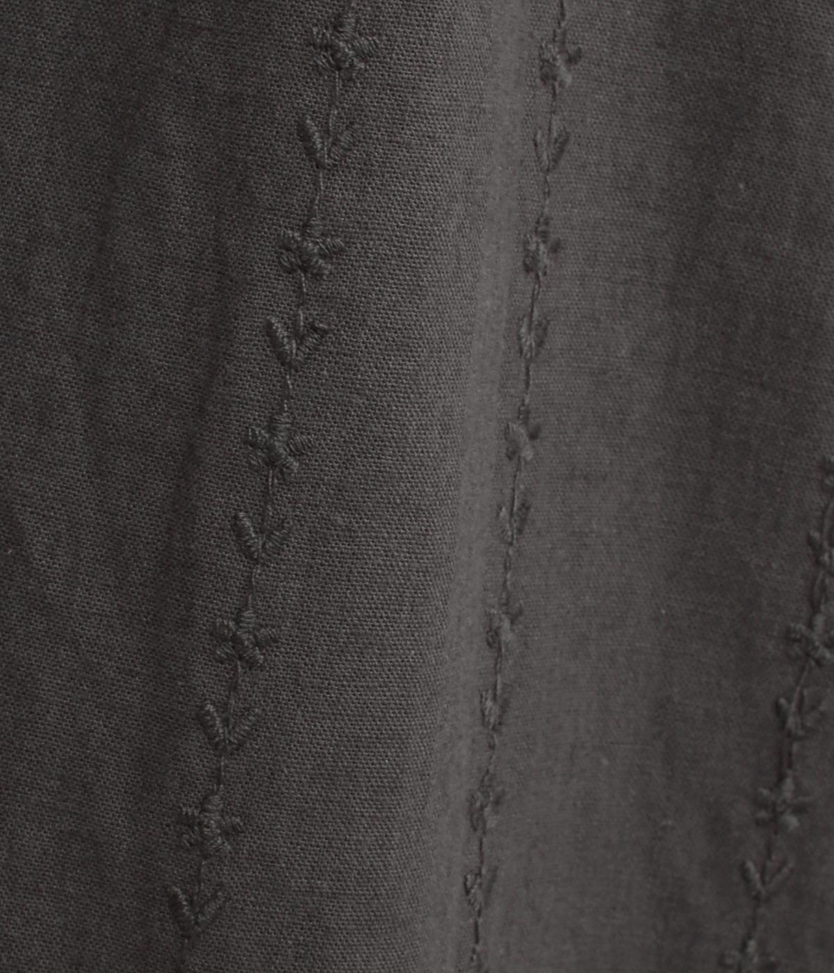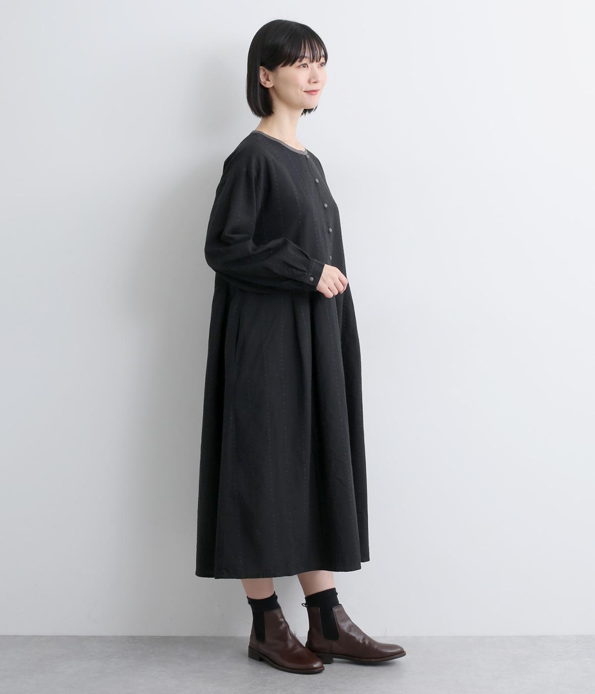 刺しゅうラインを贅沢に全面にほどこしつつ、同色糸でまとまりよく仕立てたワンピース。切り替えタックやふわりとした袖が大人ガーリーな雰囲気。襟ぐりやボタンの配色をきかせてさり気なくメリハリをつけています。