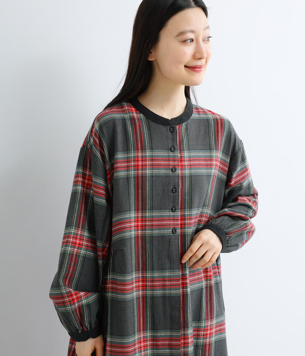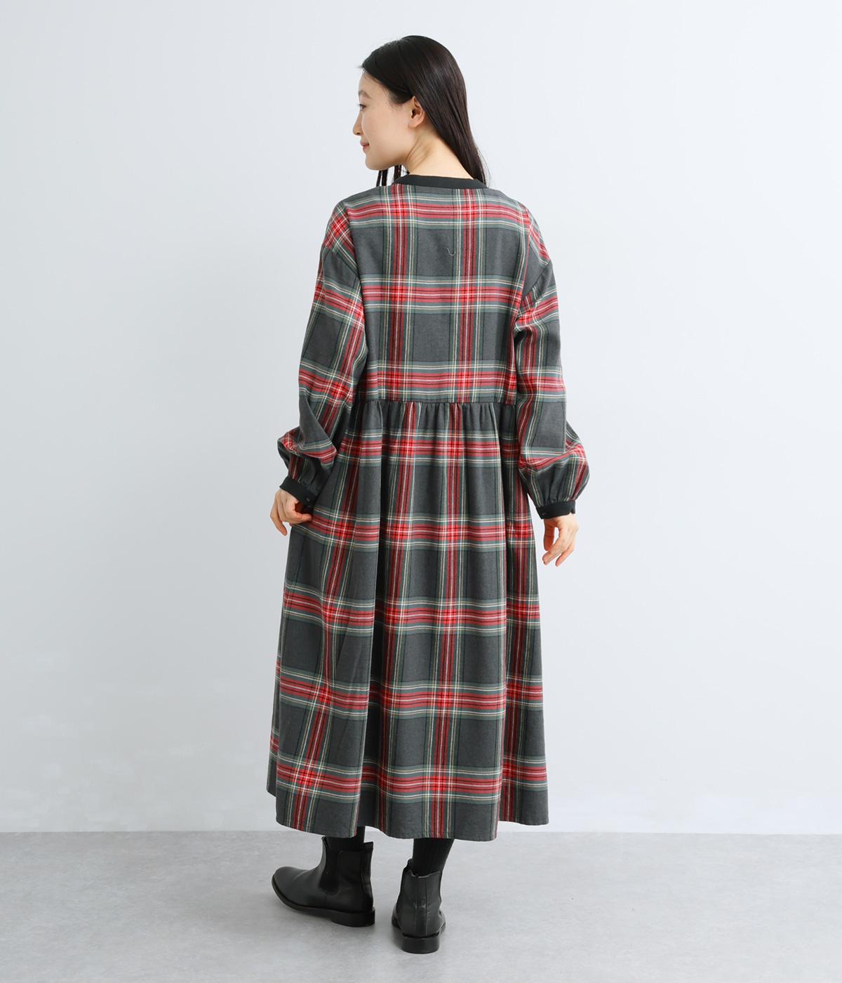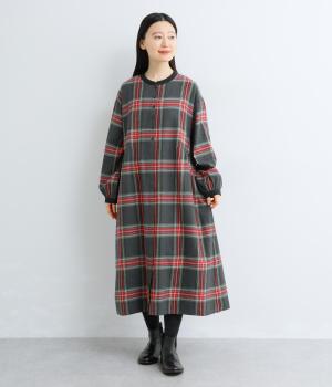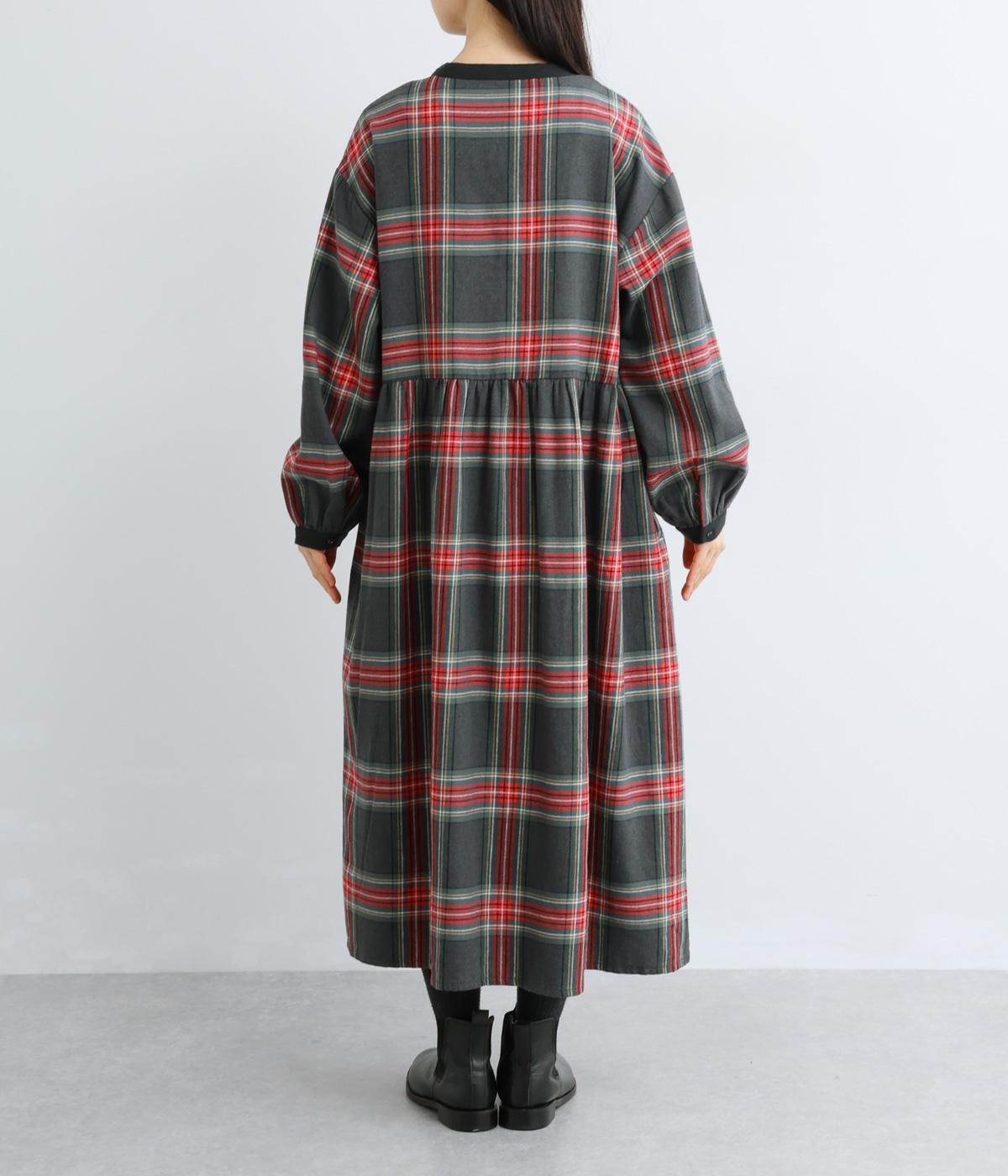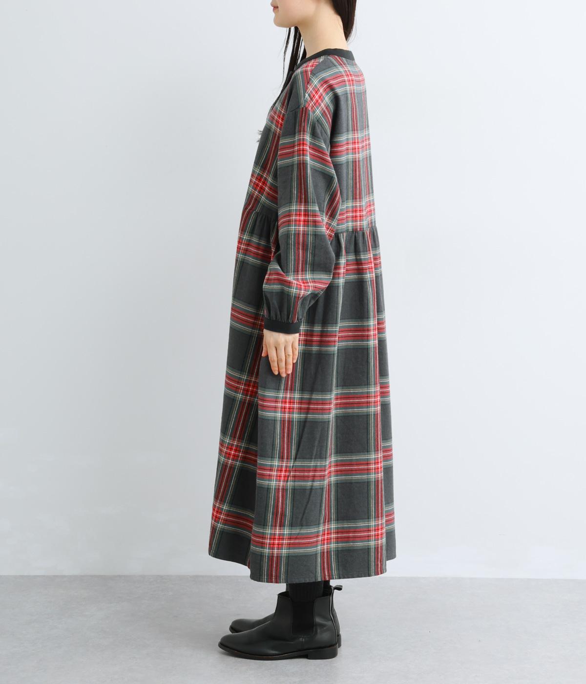 全身のギンガムチェックに、配色襟が上品さを添えるワンピースです。丸首で顔まわりはすっきり。前身頃は下半分が隠しボタンなので羽織りとしても活躍。前面サイドから背面へ続くギャザーが柔らかな表情を生みます。