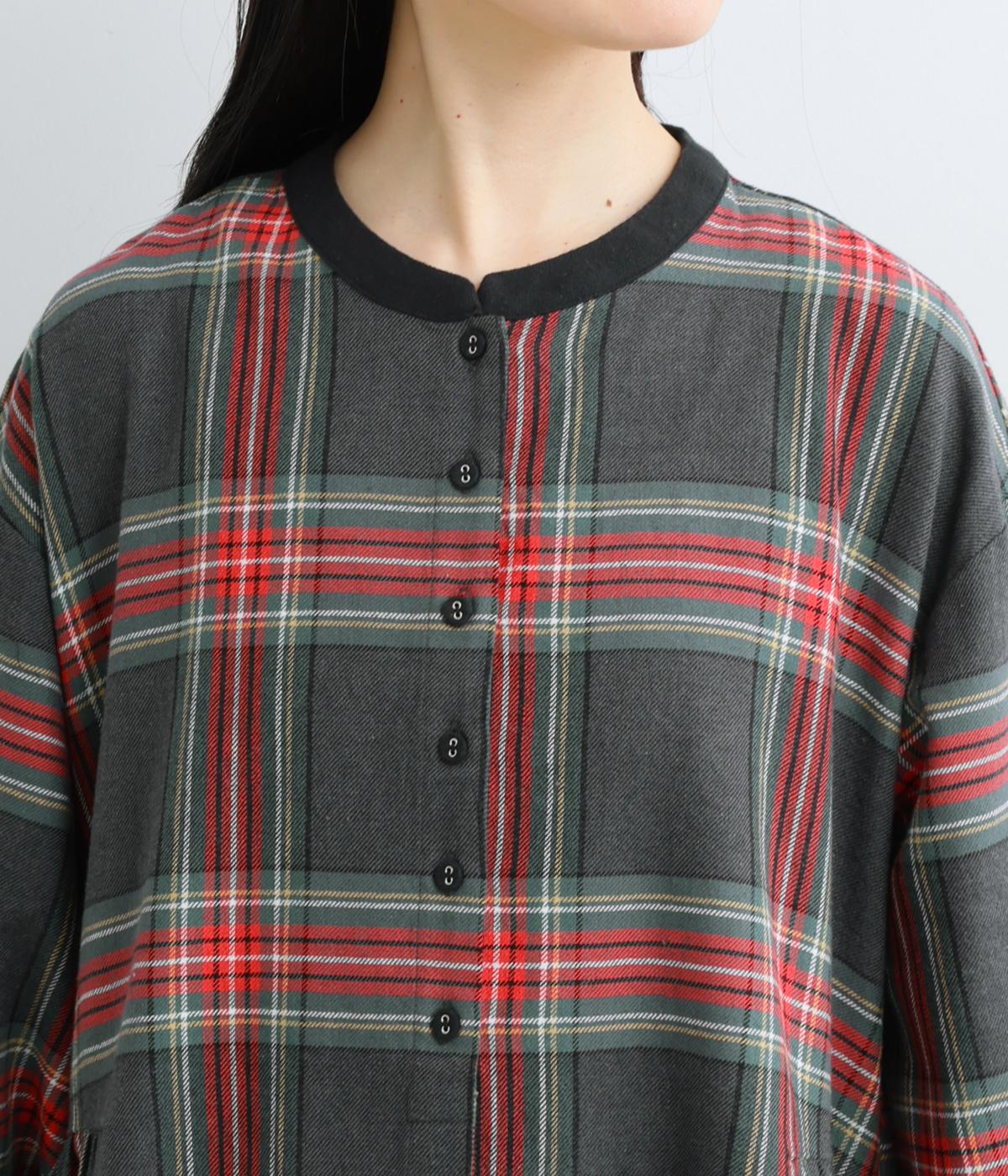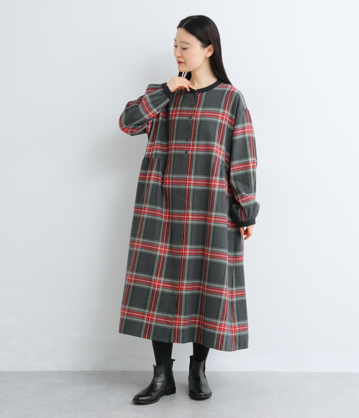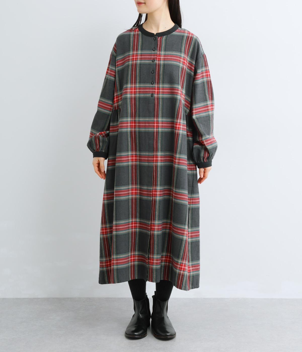 全身のギンガムチェックに、配色襟が上品さを添えるワンピースです。丸首で顔まわりはすっきり。前身頃は下半分が隠しボタンなので羽織りとしても活躍。前面サイドから背面へ続くギャザーが柔らかな表情を生みます。