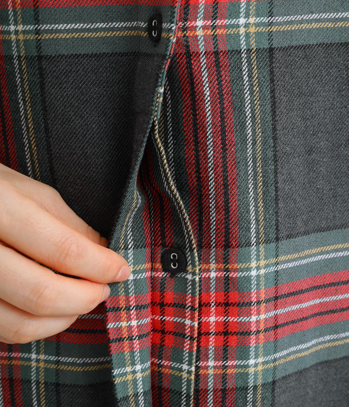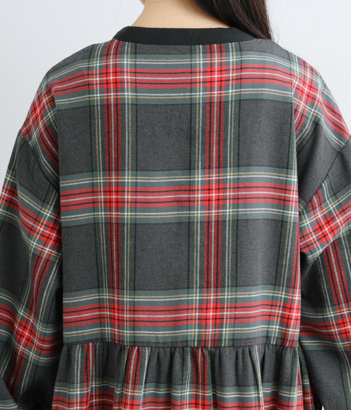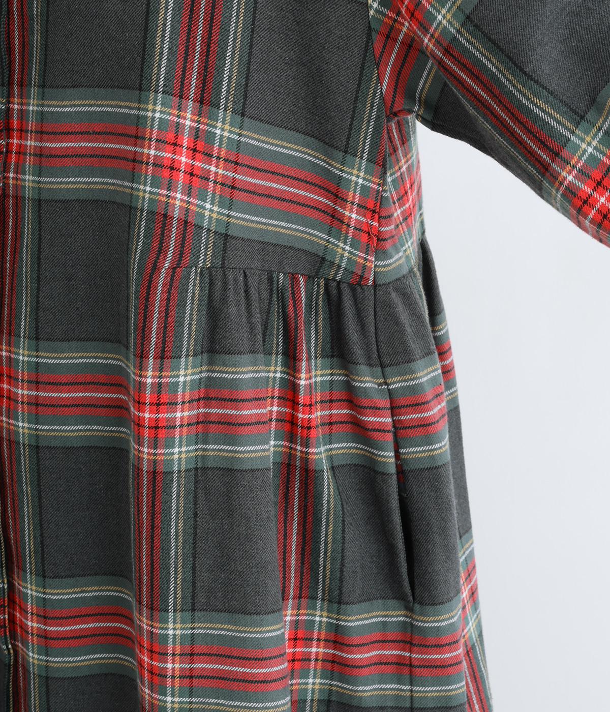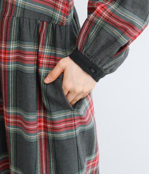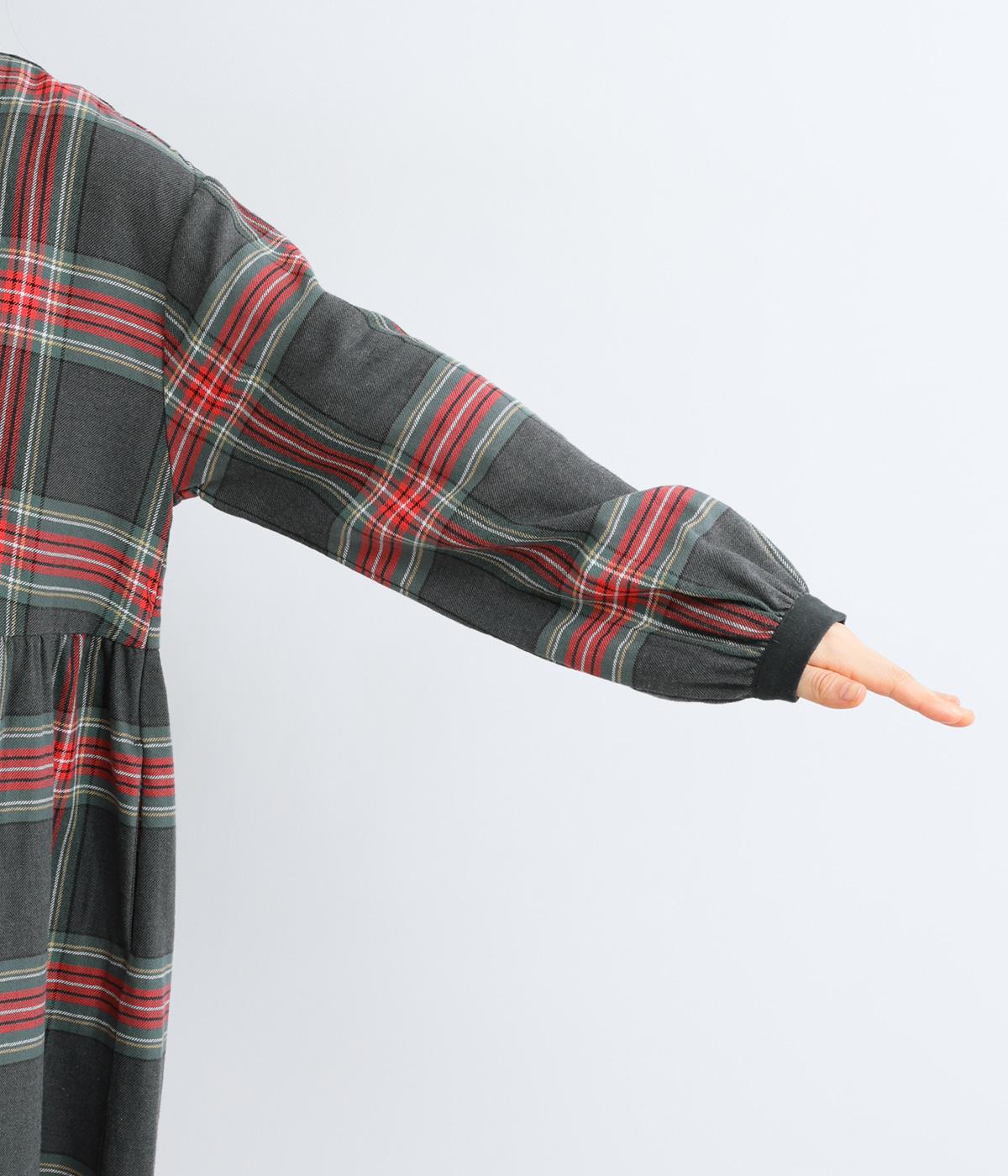 全身のギンガムチェックに、配色襟が上品さを添えるワンピースです。丸首で顔まわりはすっきり。前身頃は下半分が隠しボタンなので羽織りとしても活躍。前面サイドから背面へ続くギャザーが柔らかな表情を生みます。