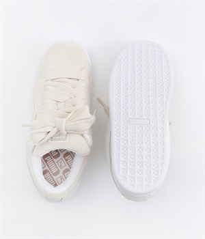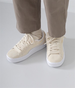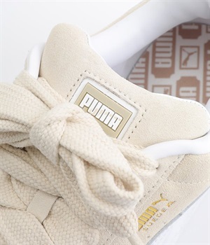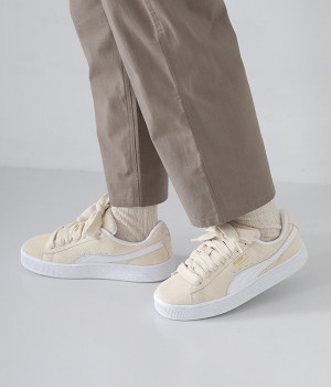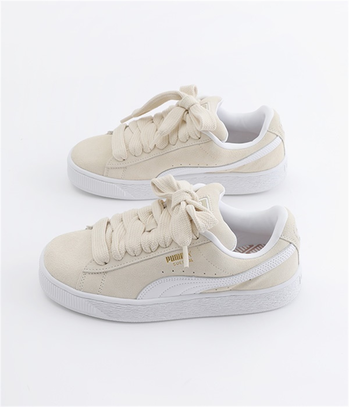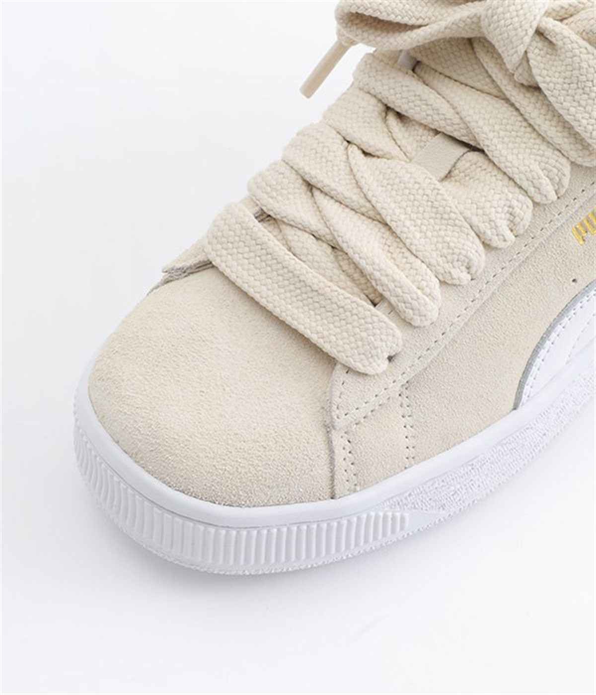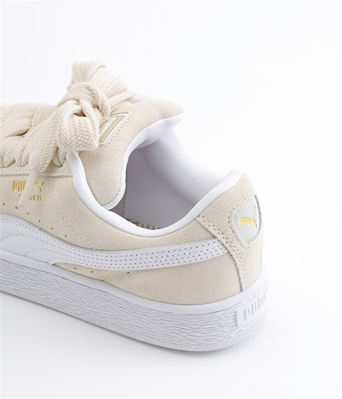 1968年にバスケットボール用シューズとして誕生したスウェードシリーズより、幅広のシューレースを採用したXLスニーカーが登場。ぬくもりを感じるスウェードをアッパーに使用した、どこかやさしい顔つきが魅力です。全体のフォルムも少しぽってりとしていて、足元にさりげなくボリュームを出してくれるデザイン。内部には適度に弾力が備わり、足を包むようにカバーする構造です。アイコニックなプーマキャットやロゴもちりばめて、ブランドの存在感を常に味わえる一足に仕上げました。