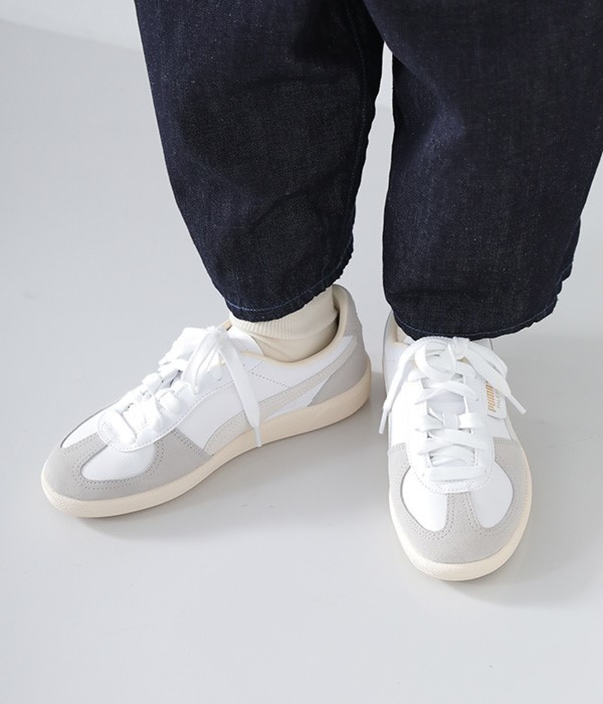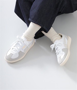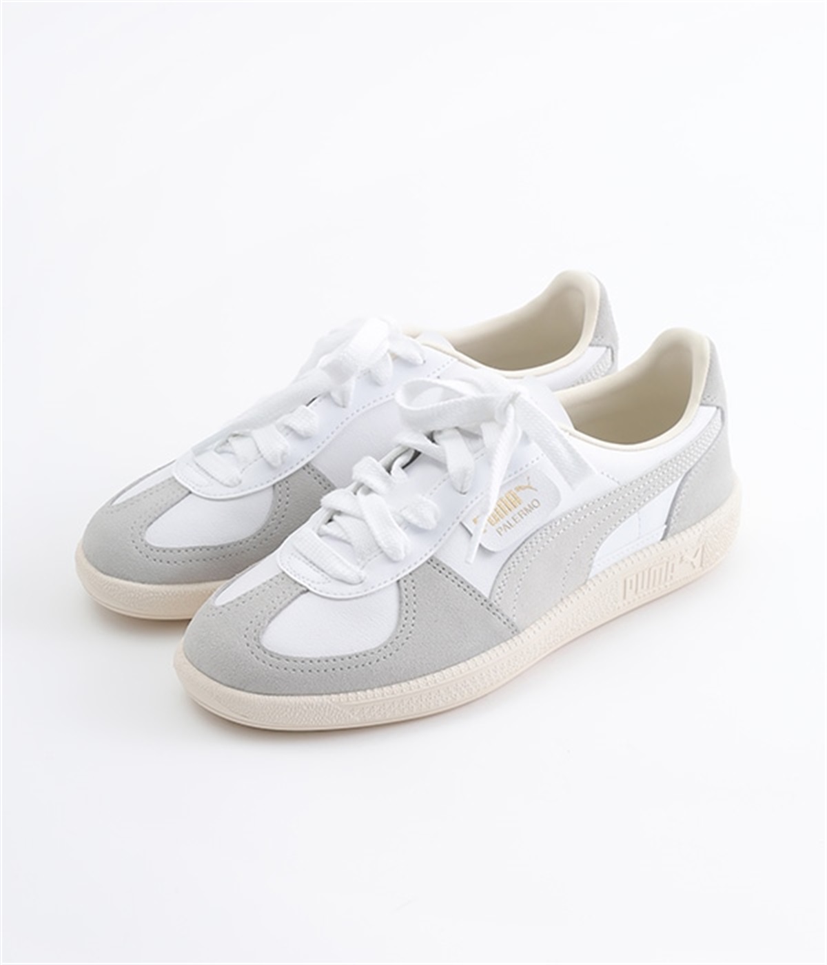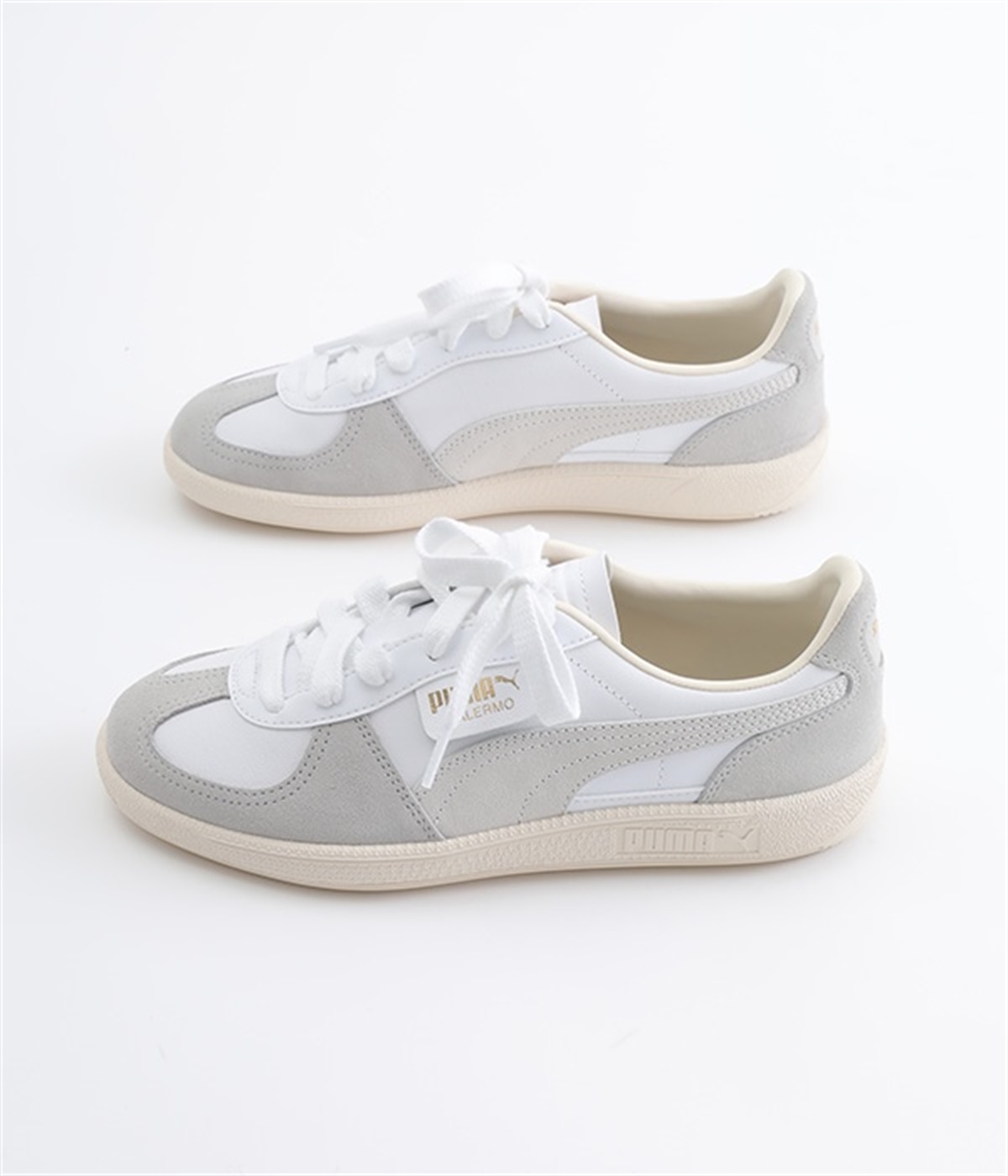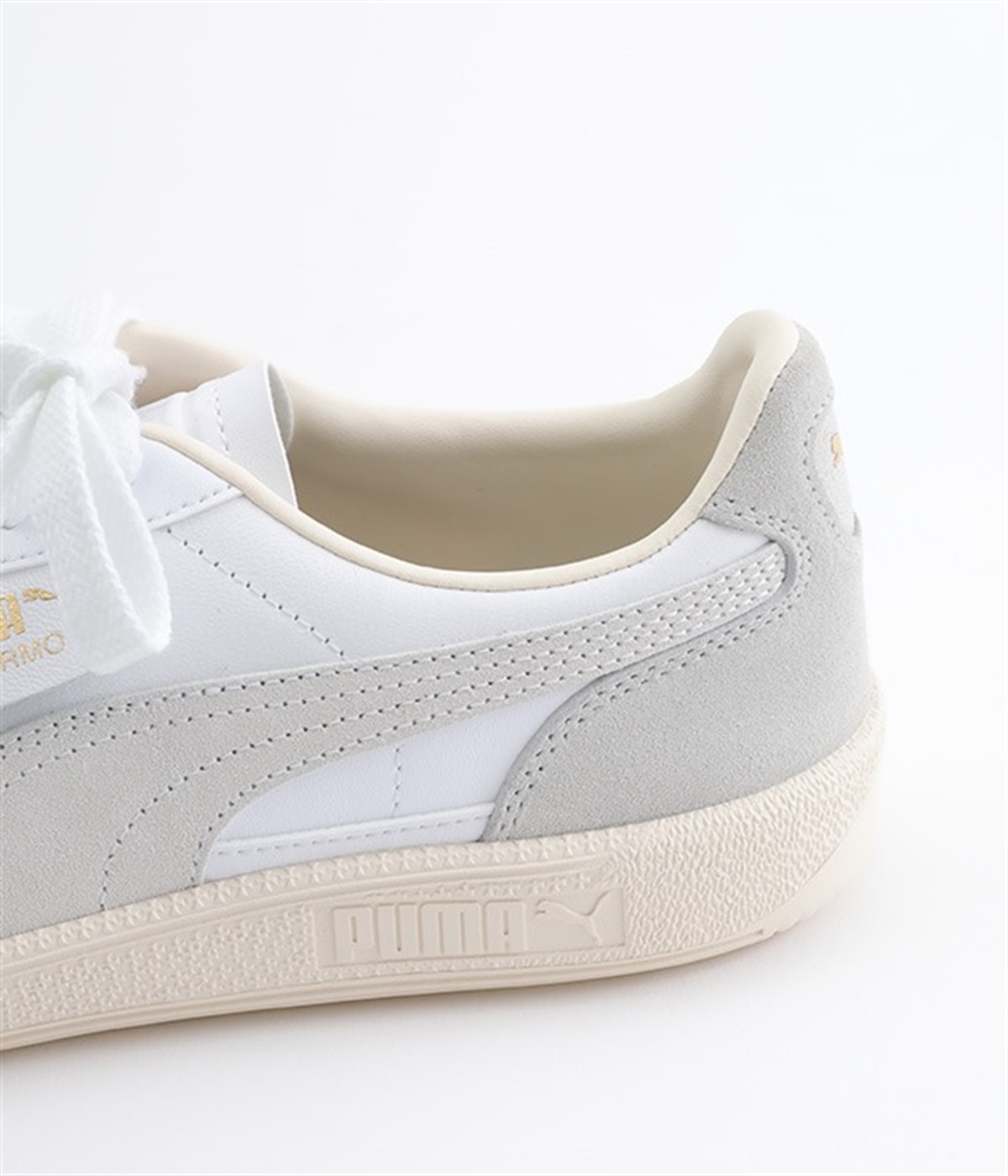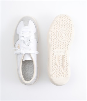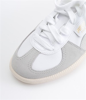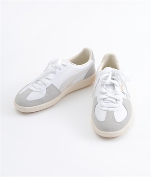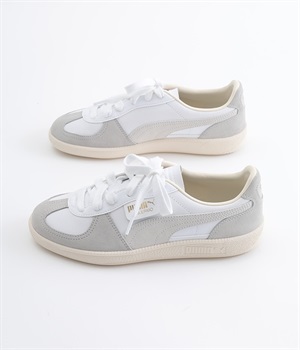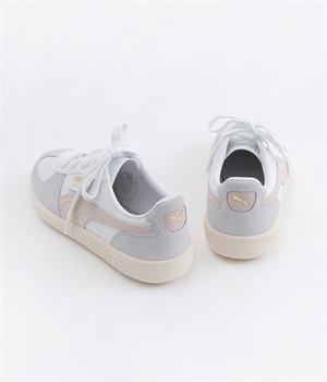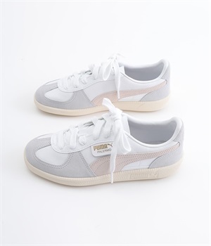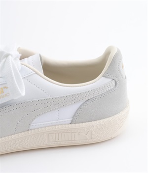 80年代初頭に登場し、瞬く間にサッカーを見に行く観客の定番シューズとなったアーカイブモデル「パレルモ」です。ペールトーン配色のスウェードパーツをアッパーに添えた、やさしい雰囲気がただようデザインが印象的。かかとやシューレース脇など、ところどころにPUMAをアピールする要素をちりばめた全方位にスキのないつくり込みが光ります。直接肌にあたる部分にはやわらかな弾力を持たせて足当たりをサポート。フルレングスのパンツやロング丈のボリュームスカートとも好相性のローカットタイプです。
