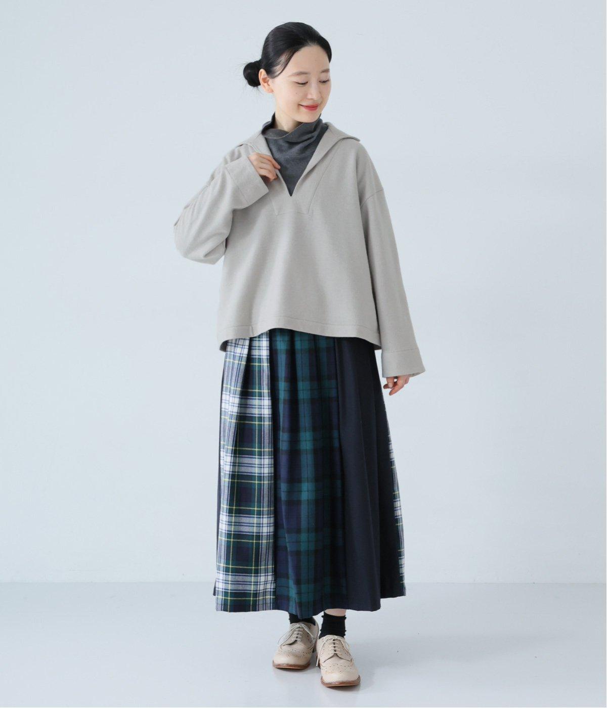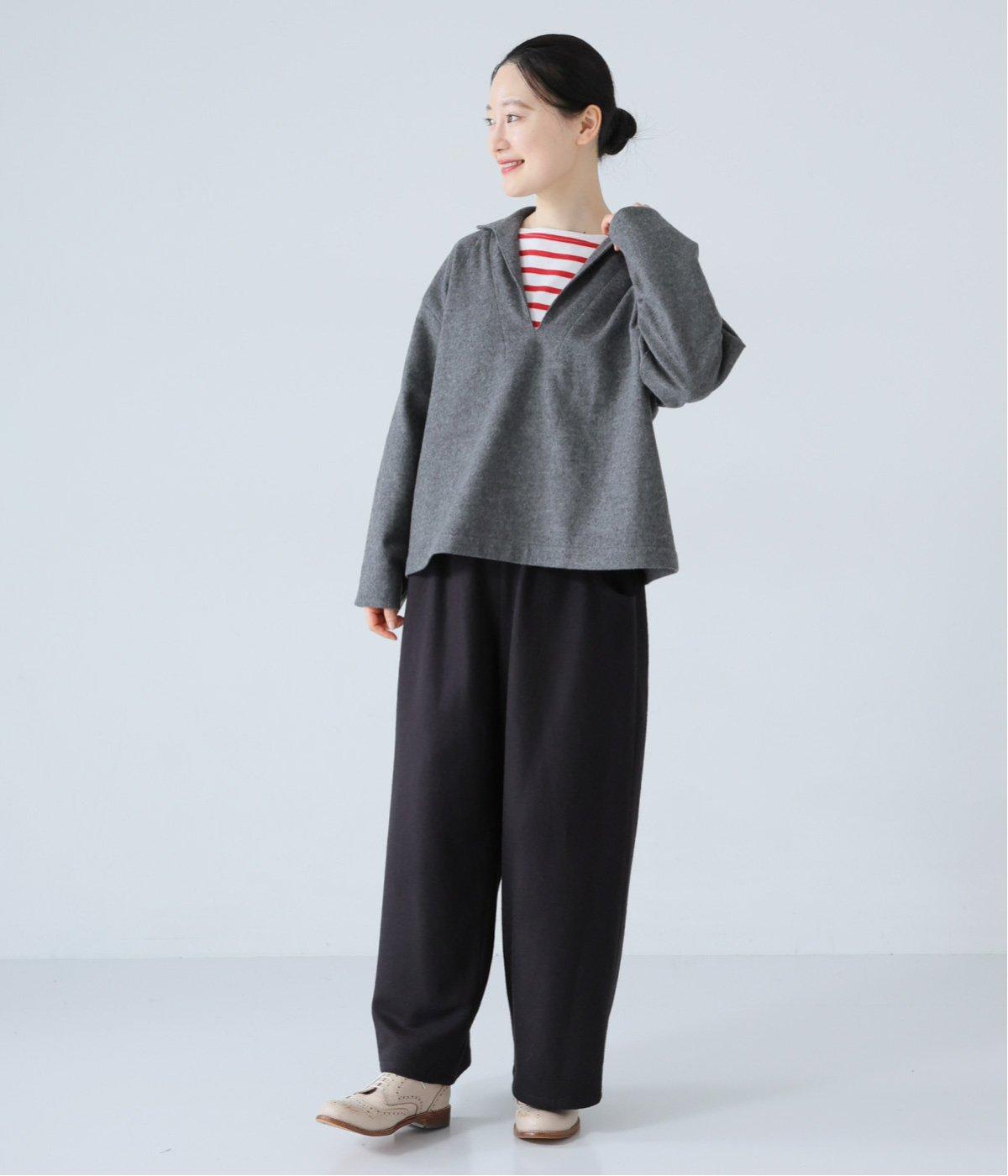 子どもっぽさをおさえた小さめのセーラーカラーがポイント。深めのVネックが顔まわりをすっきりと印象づけます。身幅にゆとりを持たせつつ、やや短めの着丈設定で好バランスに。合わせるインナー次第で違った表情をたのしめます。