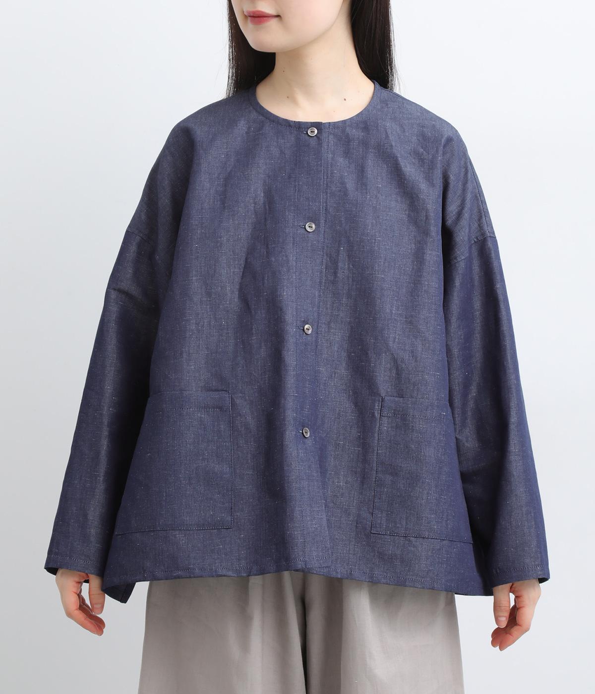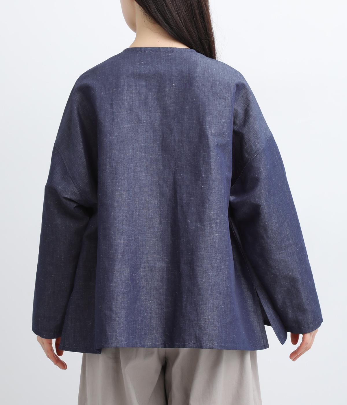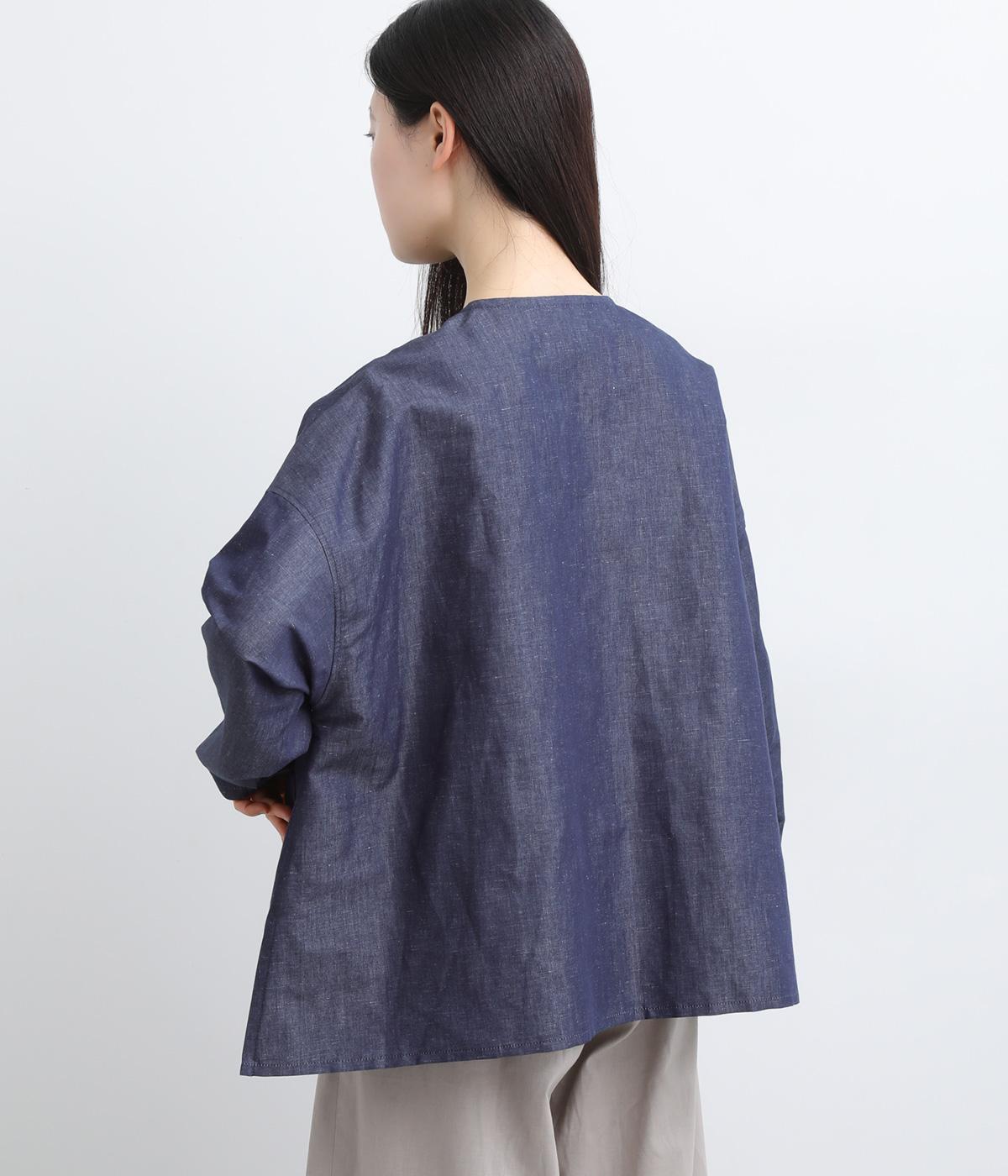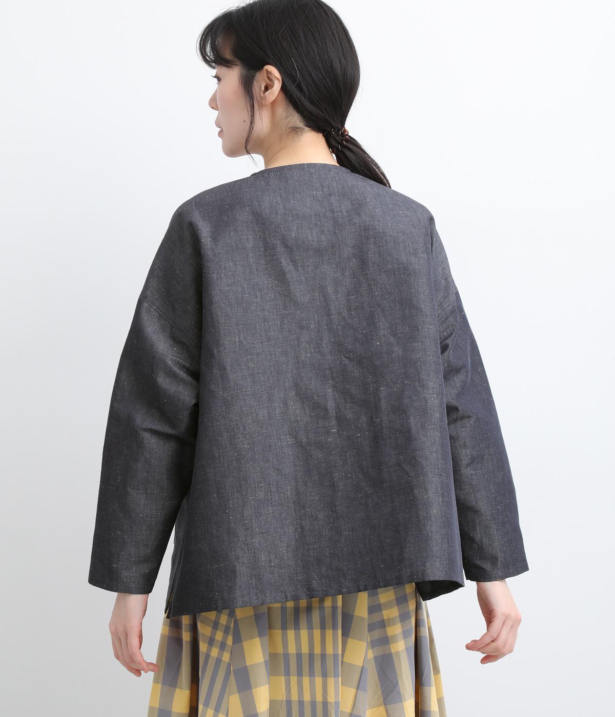 ゆったりとしたシルエットで、ジャケットのように羽織れるブラウスです。すっきりとしたノーカラーで、さまざまなインナーと合わせやすいのも魅力。フロントはシンプルに整えつつ、スクエアポケットでアクセントを添えました。やや深めのサイドスリット入りで動きやすさも◎。ロングシーズン着まわせる、便利な一着です。
