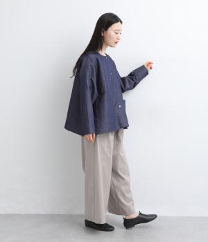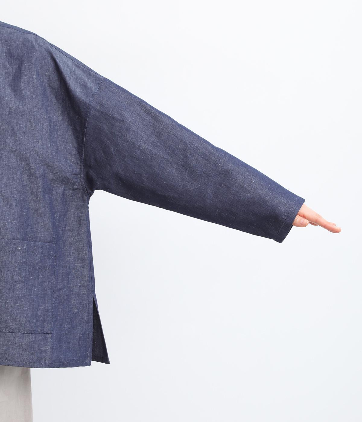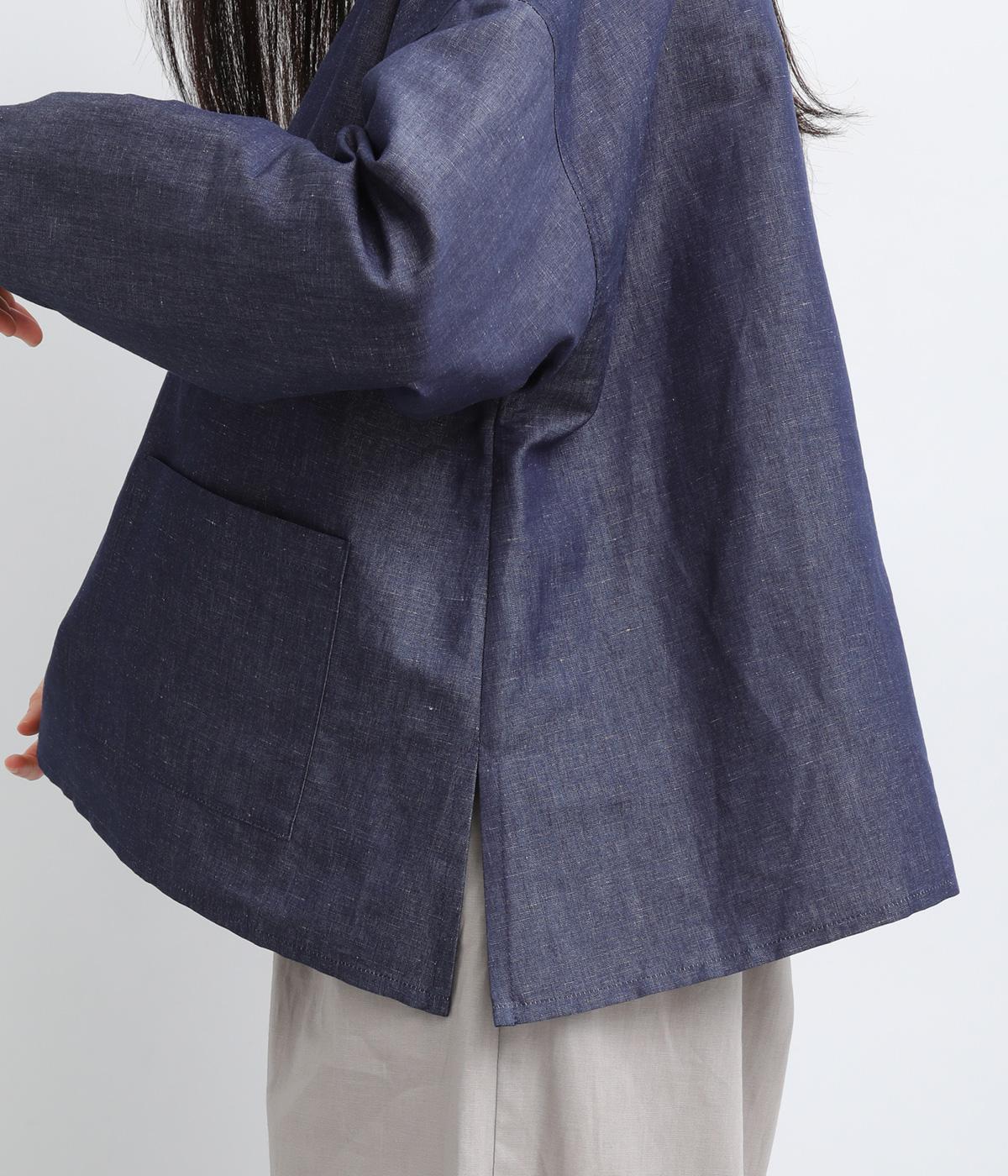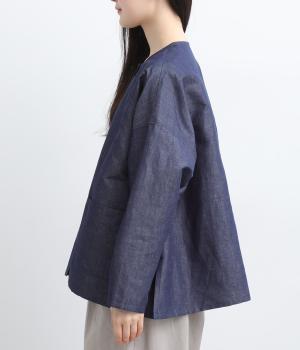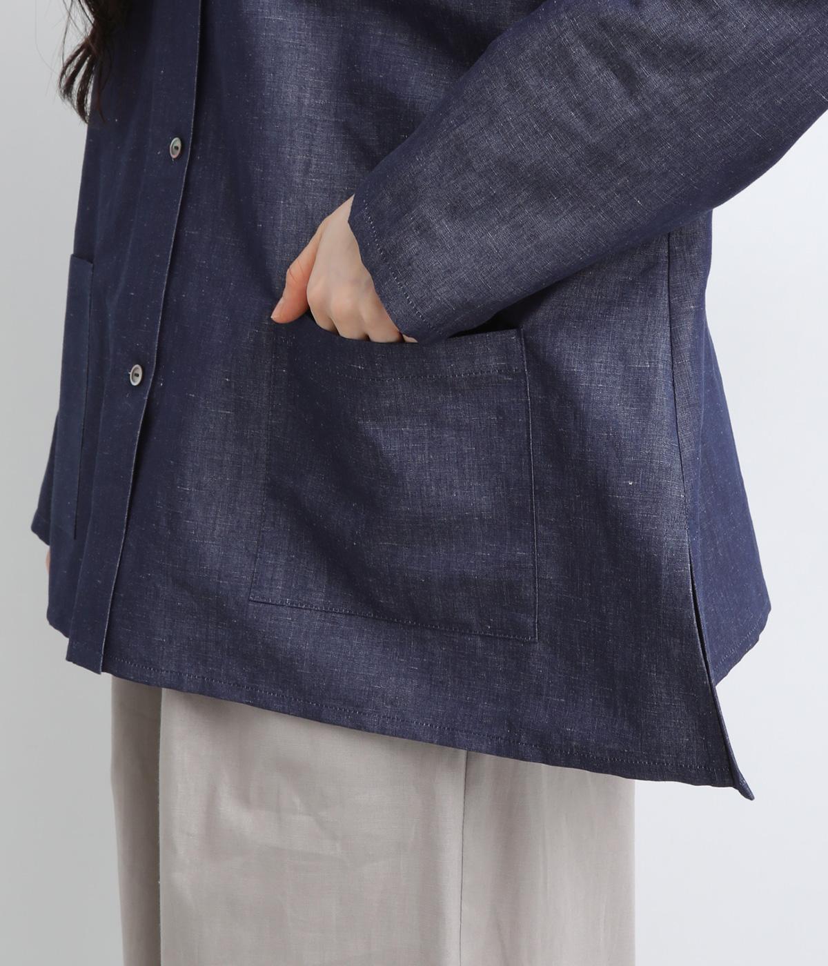 ゆったりとしたシルエットで、ジャケットのように羽織れるブラウスです。すっきりとしたノーカラーで、さまざまなインナーと合わせやすいのも魅力。フロントはシンプルに整えつつ、スクエアポケットでアクセントを添えました。やや深めのサイドスリット入りで動きやすさも◎。ロングシーズン着まわせる、便利な一着です。