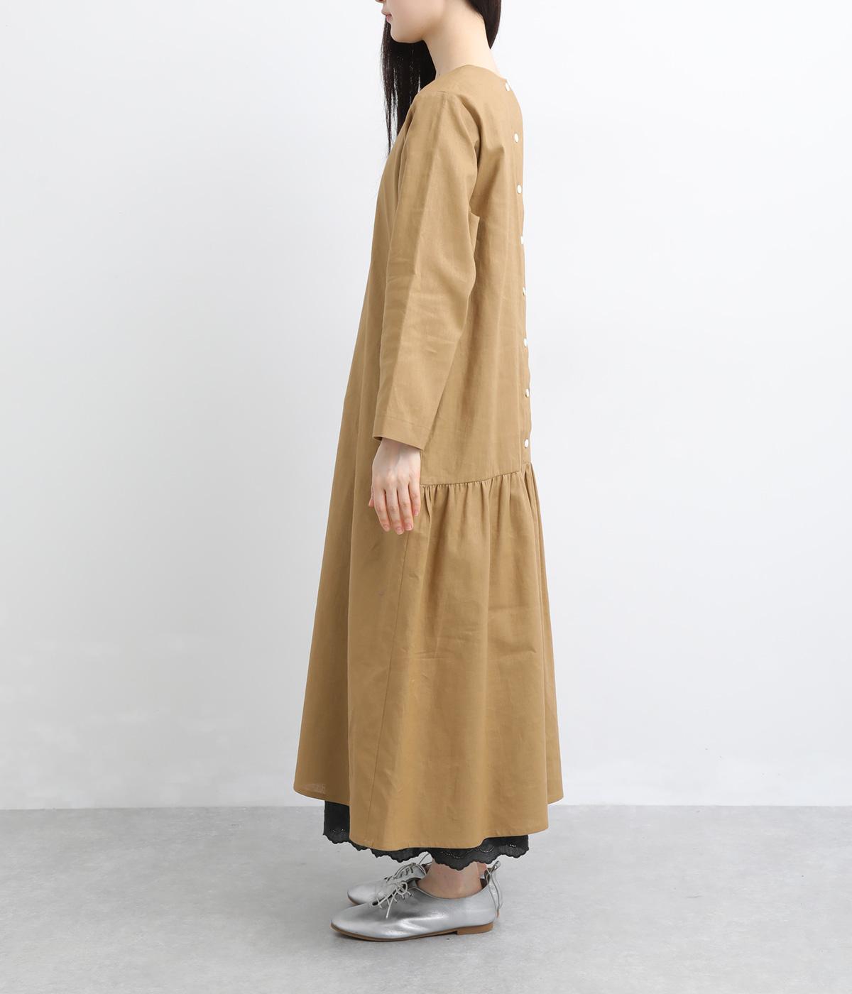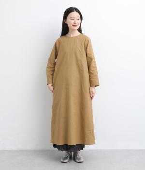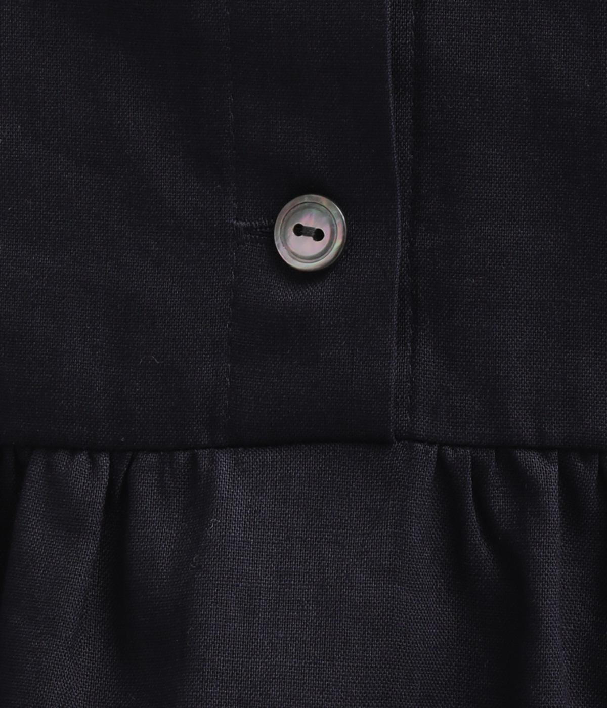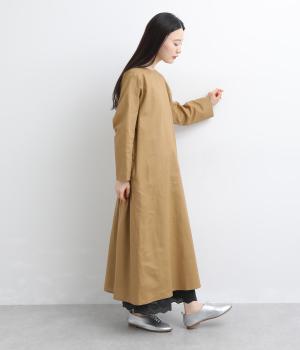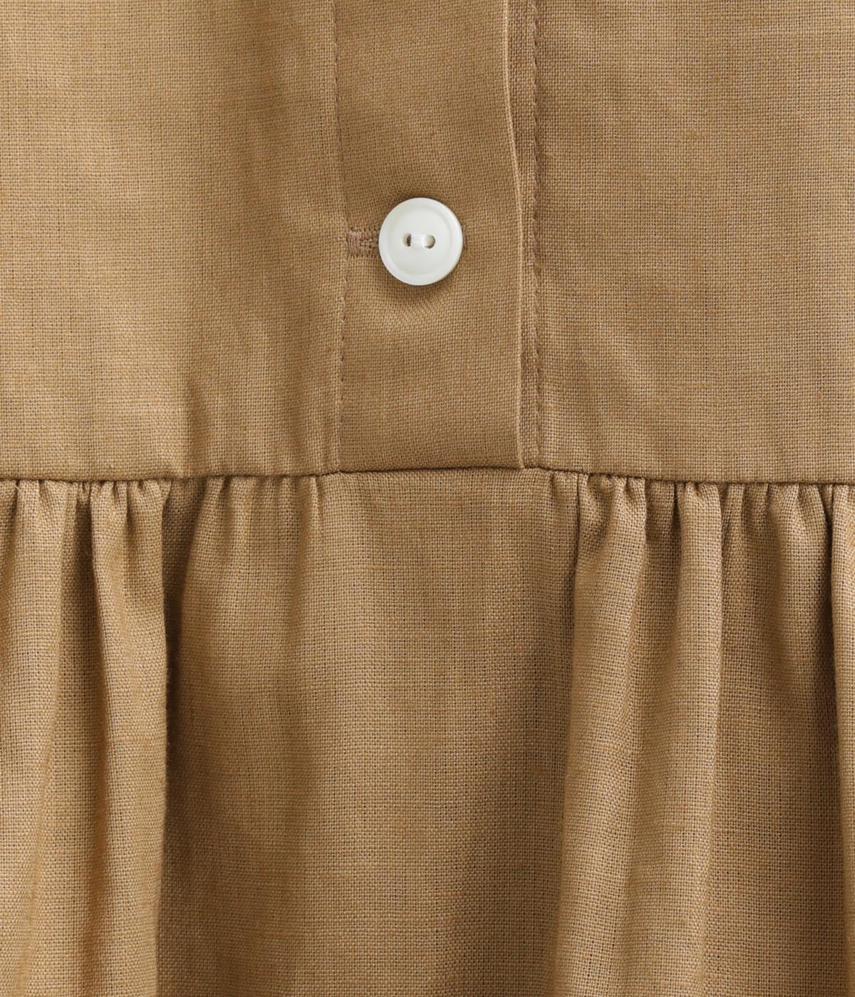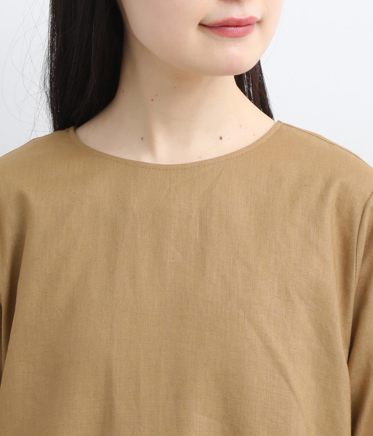 コットンリネン素材を使用し、軽やかさのなかにハリを備えた生地感です。さらりとドライな肌ざわりで、汗ばむ季節も心地よく着られるのが魅力。ネップが織りなすナチュラルな凹凸に、ほのかなツヤが上品さを添える、バランスのよい質感です。