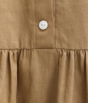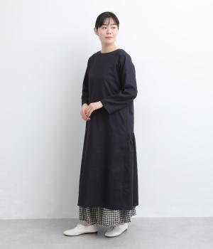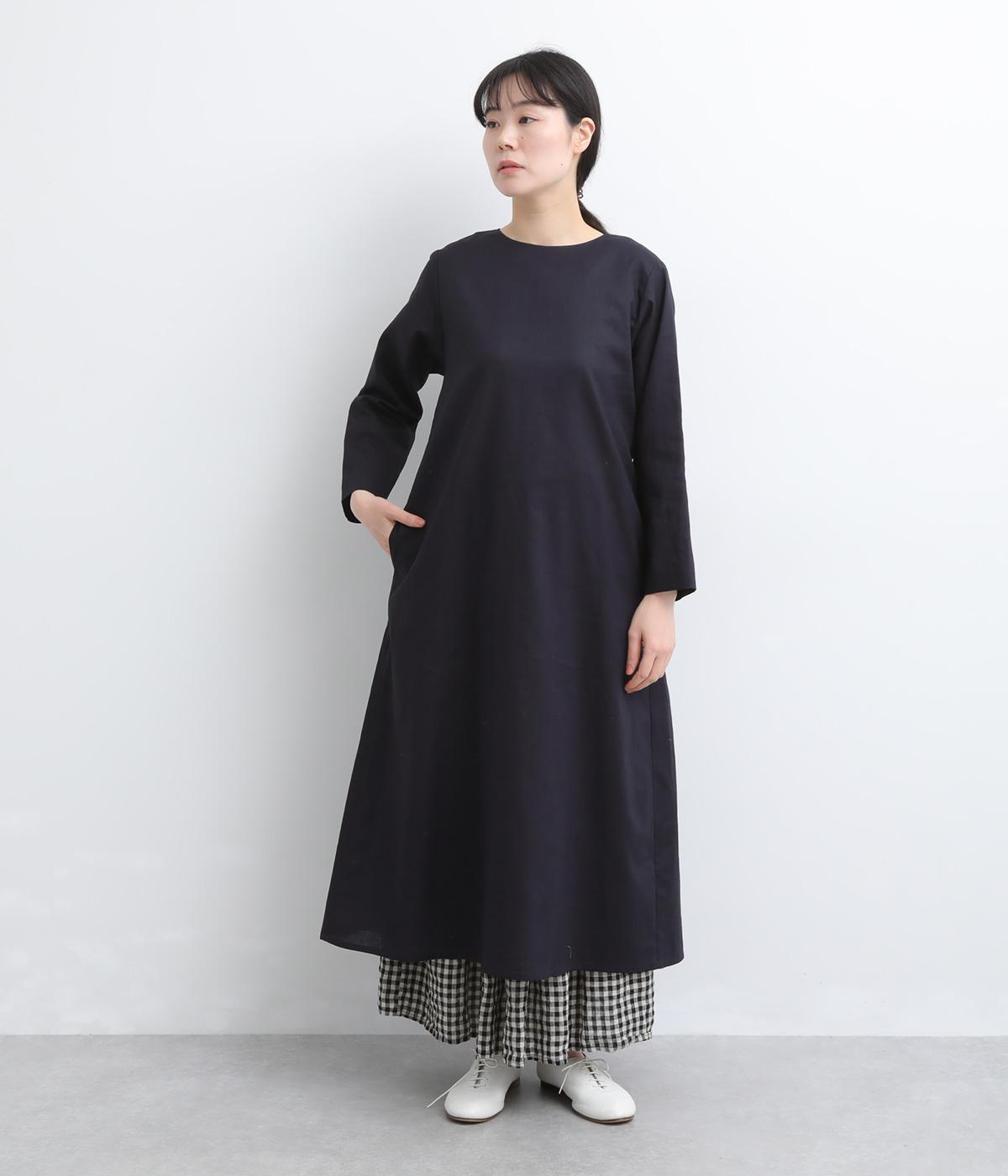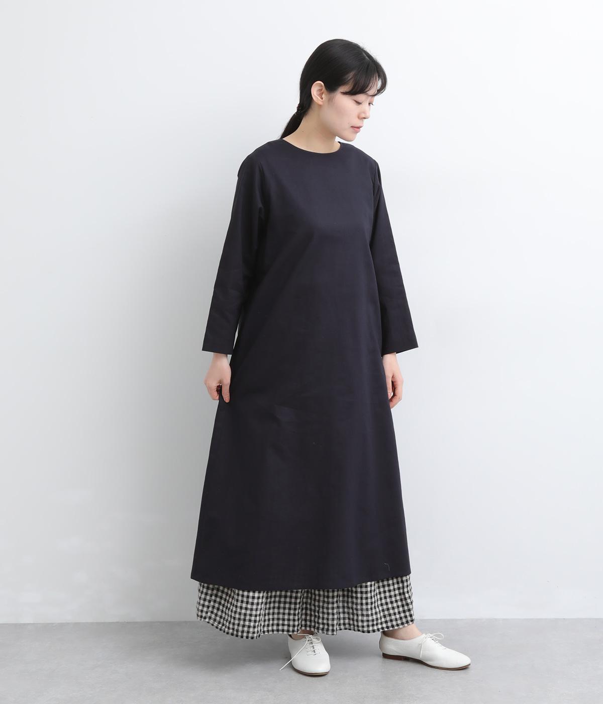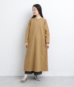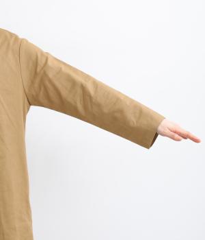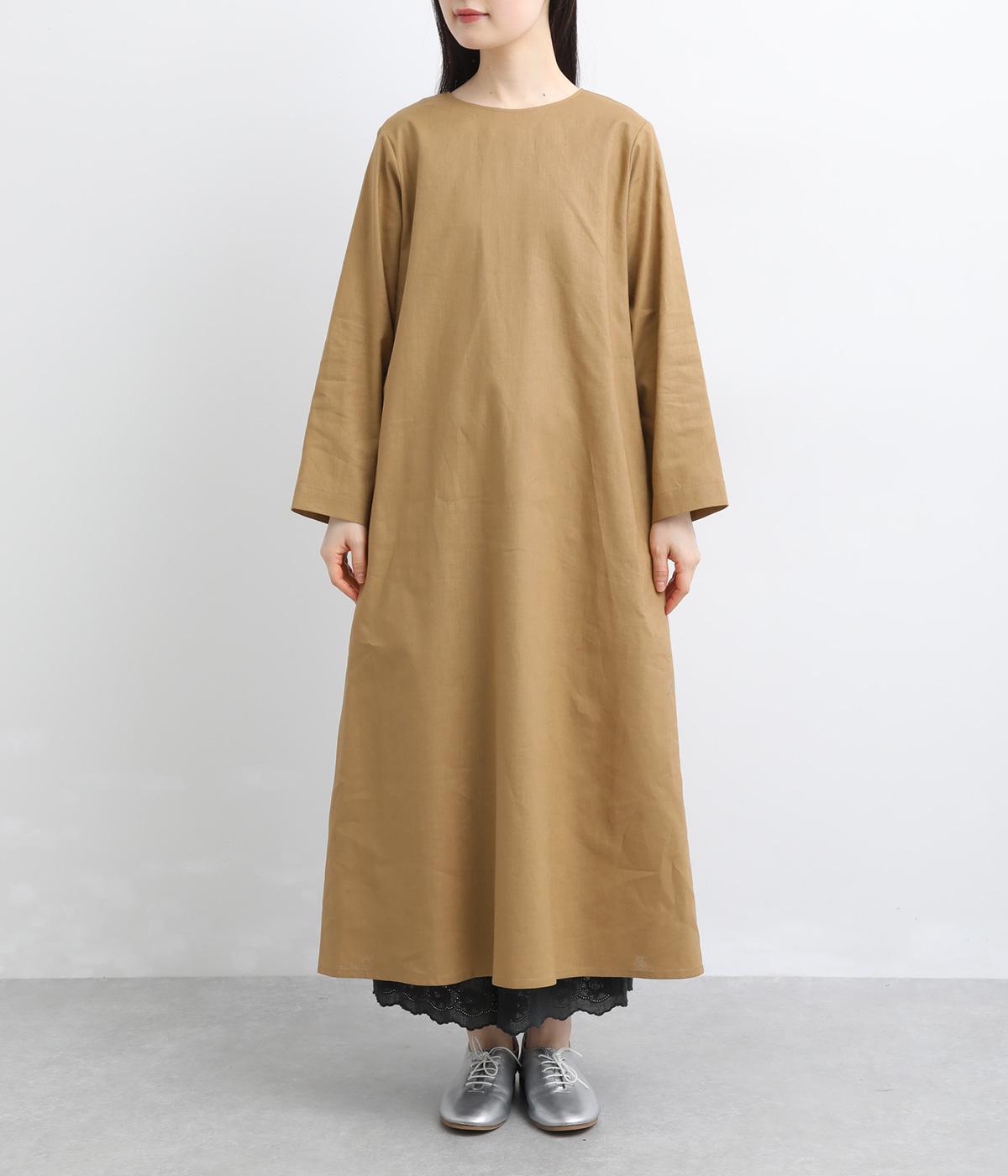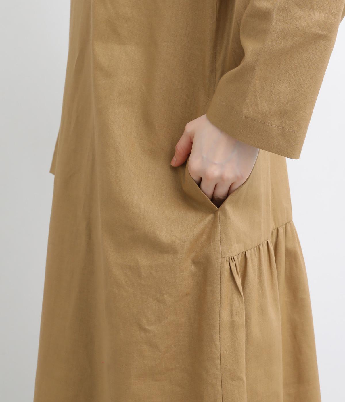 コットンリネン素材を使用し、軽やかさのなかにハリを備えた生地感です。さらりとドライな肌ざわりで、汗ばむ季節も心地よく着られるのが魅力。ネップが織りなすナチュラルな凹凸に、ほのかなツヤが上品さを添える、バランスのよい質感です。