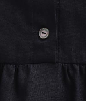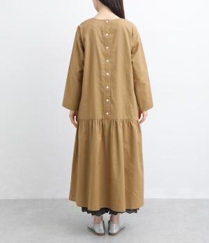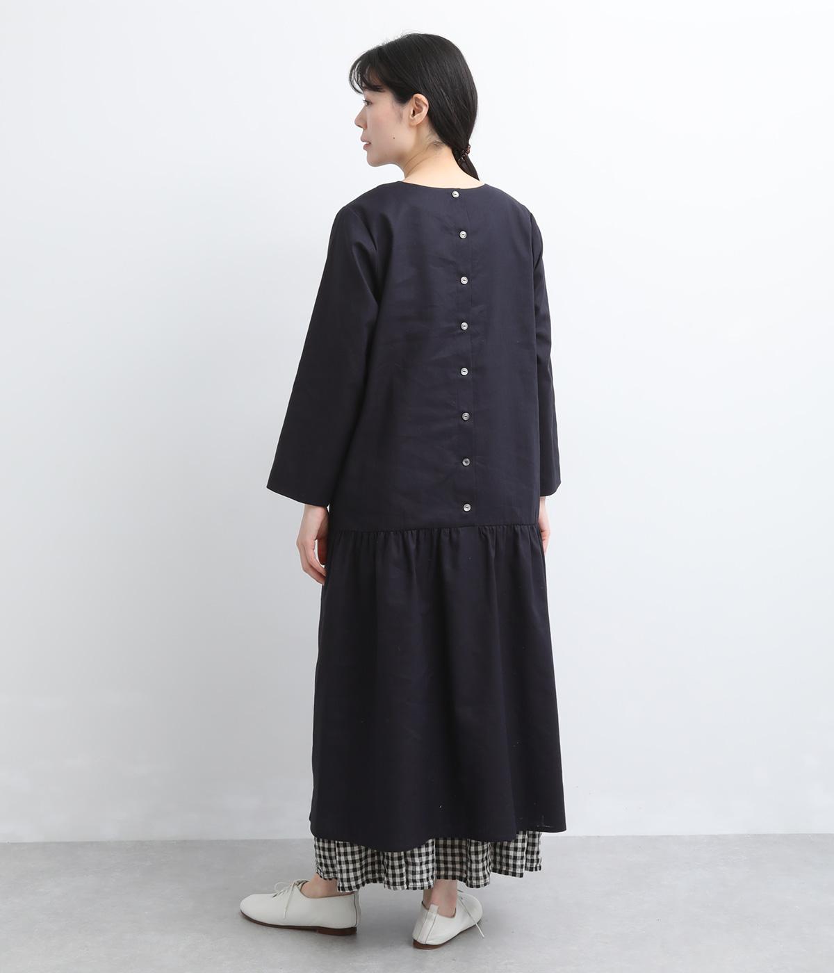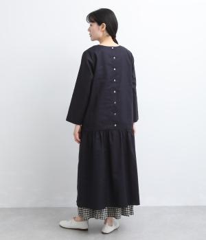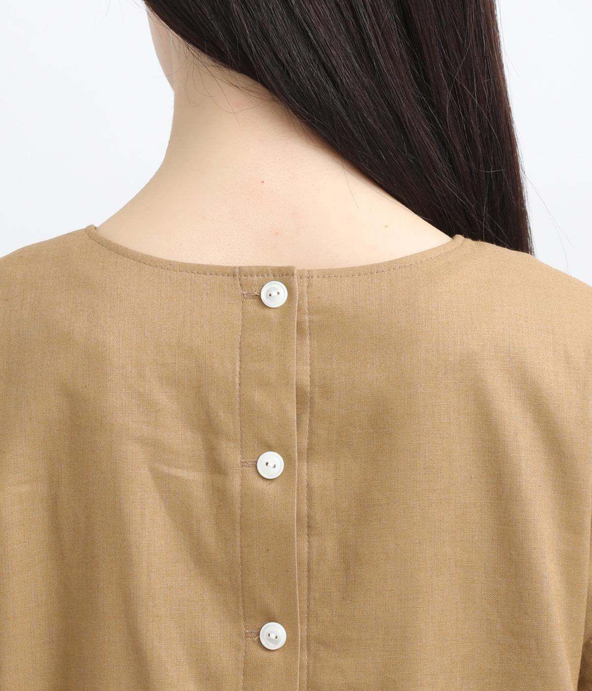 シンプルな前身頃に対し、背面に表情を持たせたデザインが特徴です。うしろにはボタンを配し、さりげないアクセントをプラス。ヒップラインから入れたギャザーがふんわりとした立体感をつくり、動きのあるシルエットに仕上げています。パンツやロングスカートとのレイヤードもおすすめです。