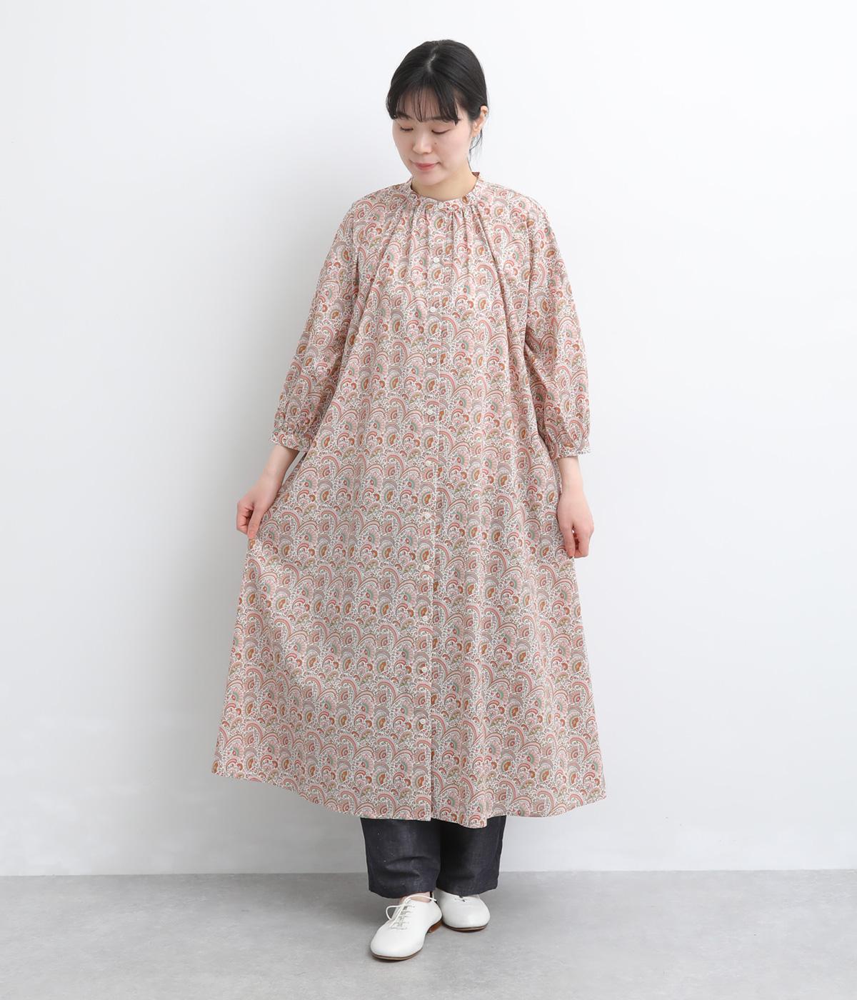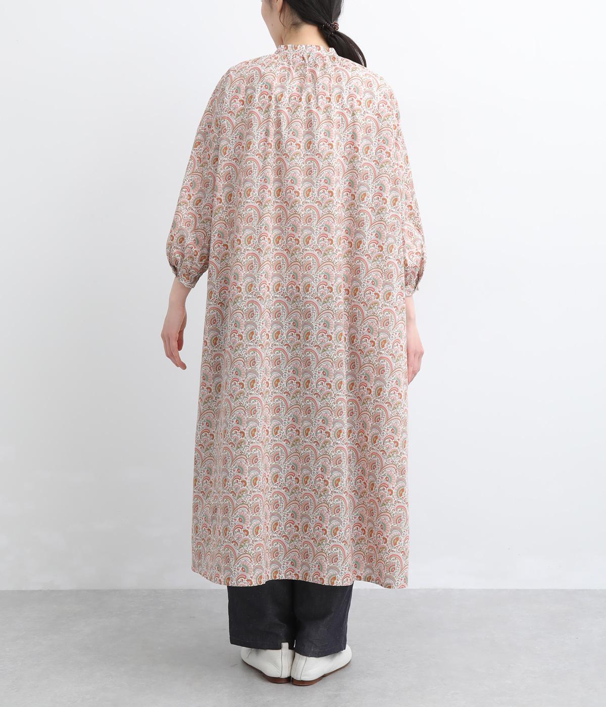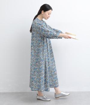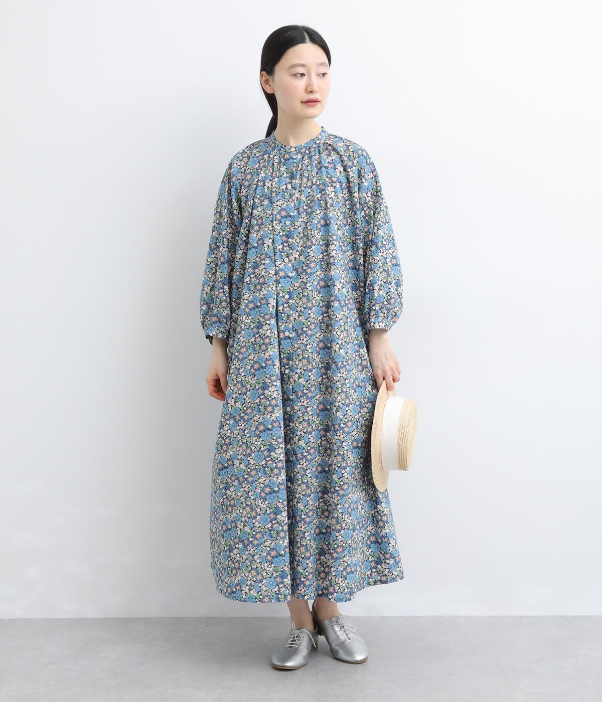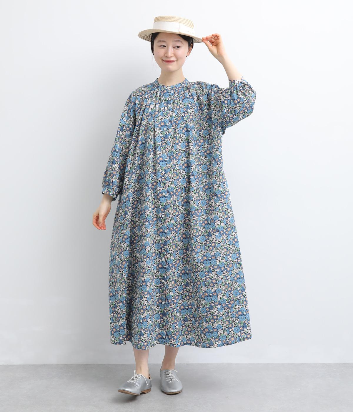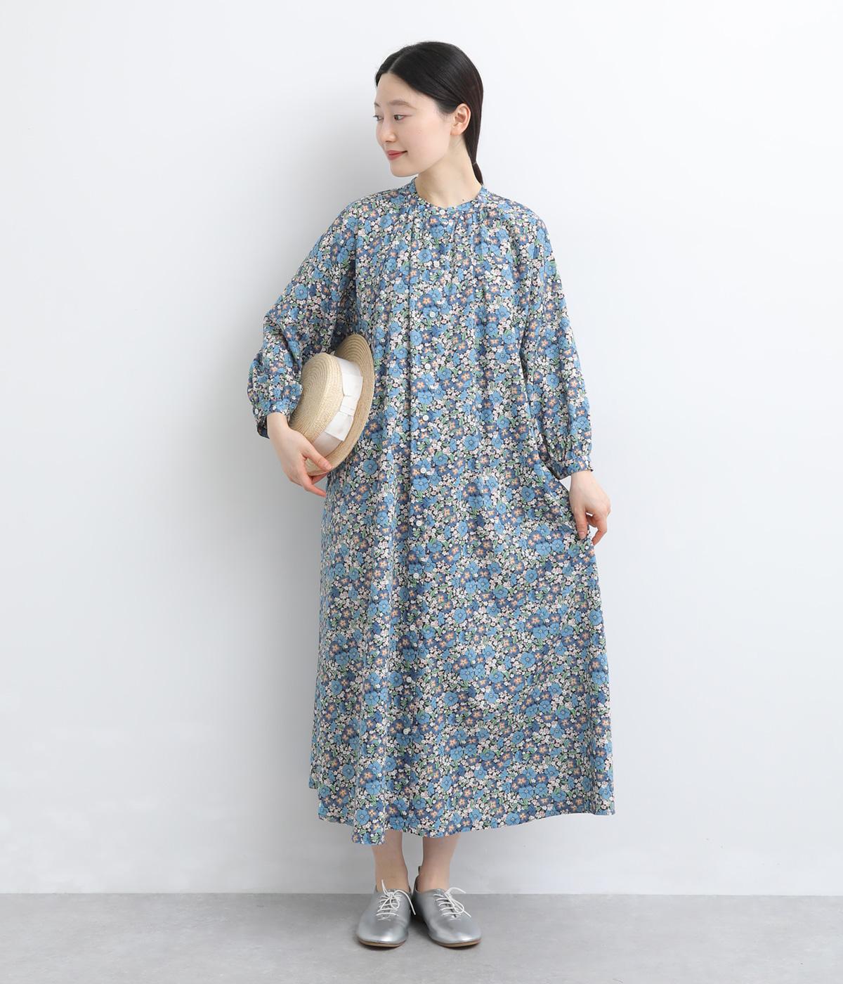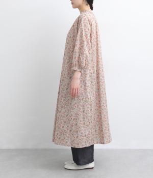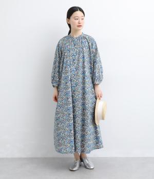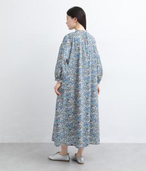 繊細なタッチで描かれたリバティプリントが、やさしく華やかな印象を添えるワンピースです。襟元と袖口に寄せたギャザーがふんわりとした立体感を生み、やわらかな丸みのあるシルエットを演出します。ゆったりとした身幅で体のラインを拾いにくいのも◎。前開き仕様で、羽織り風の着こなしもおすすめです。
