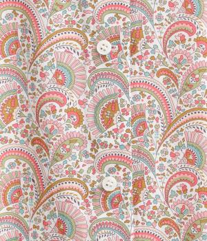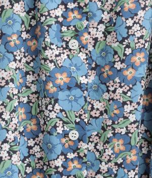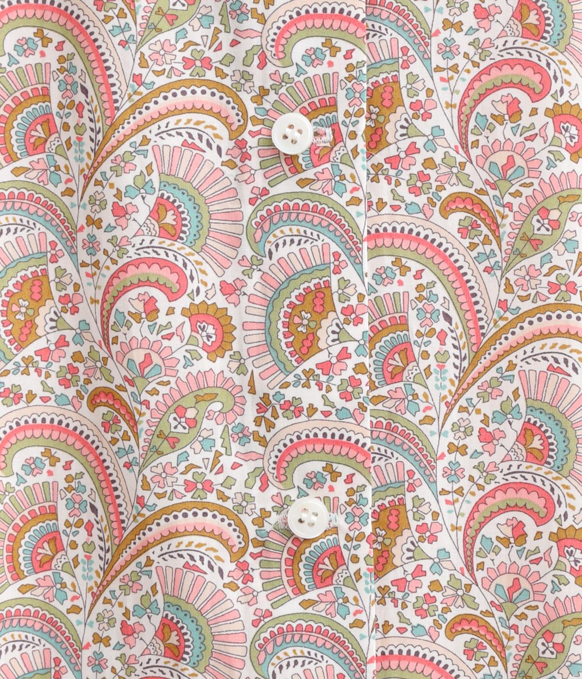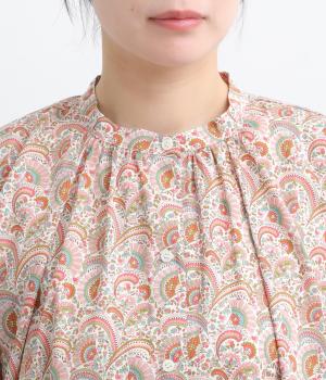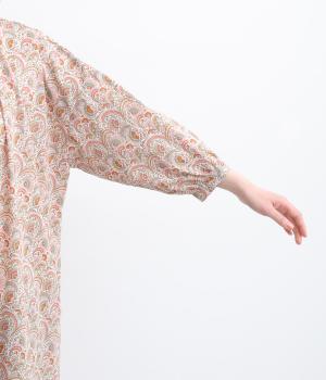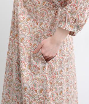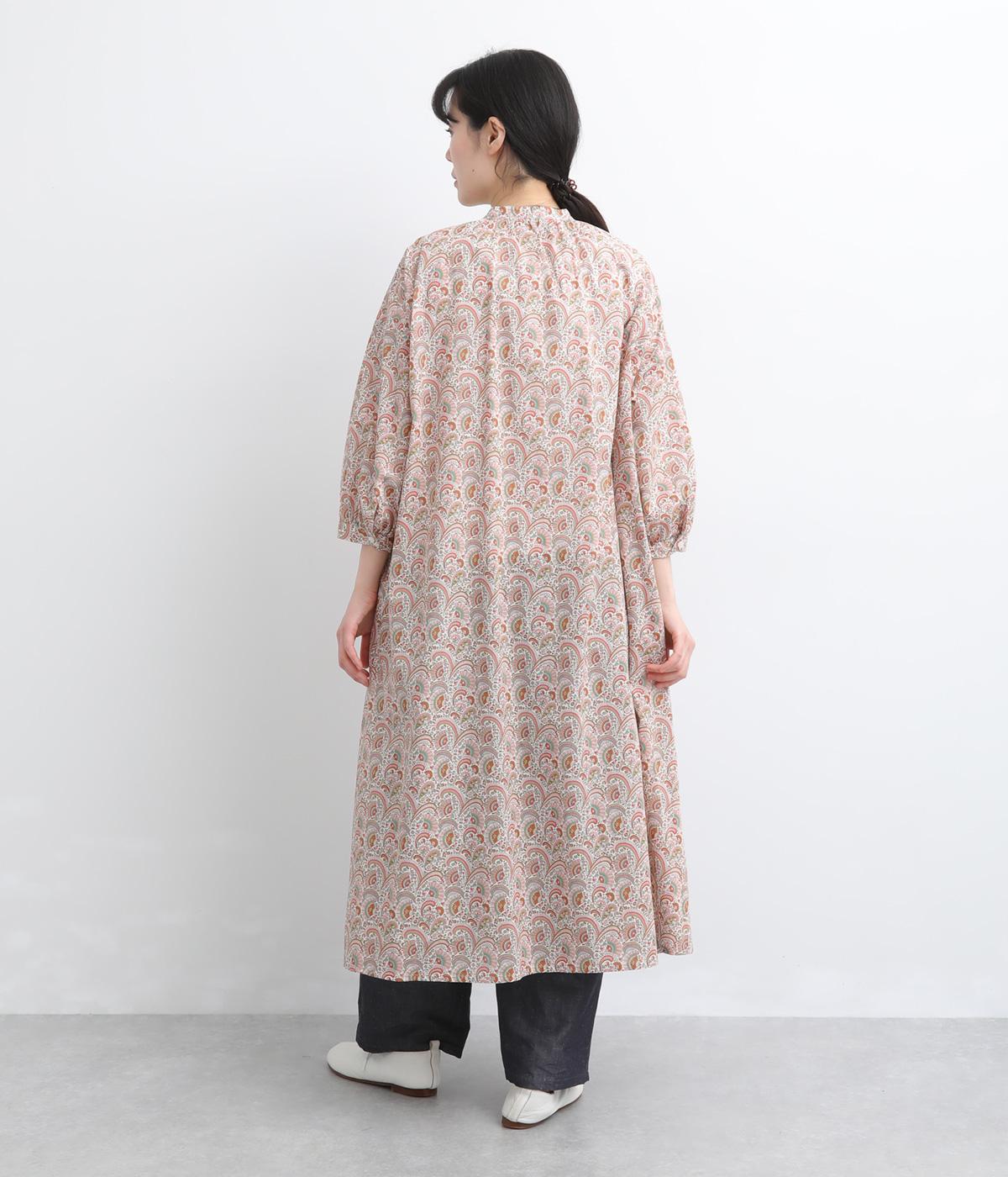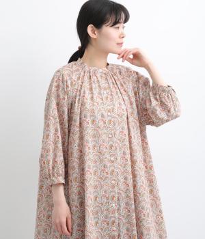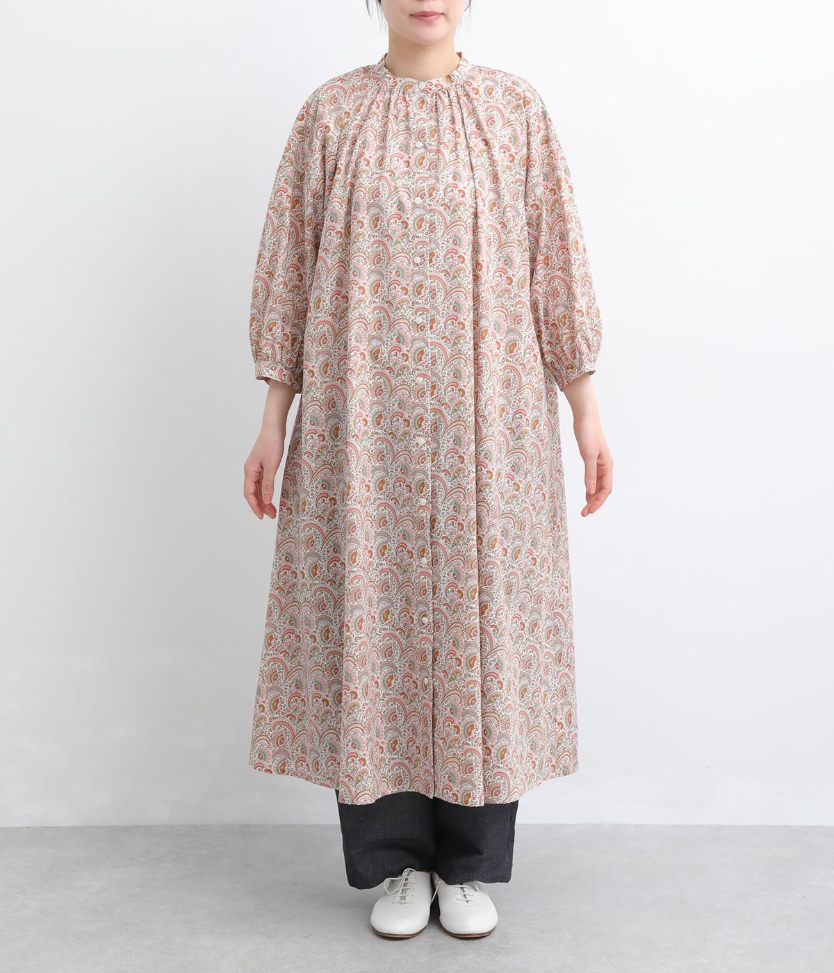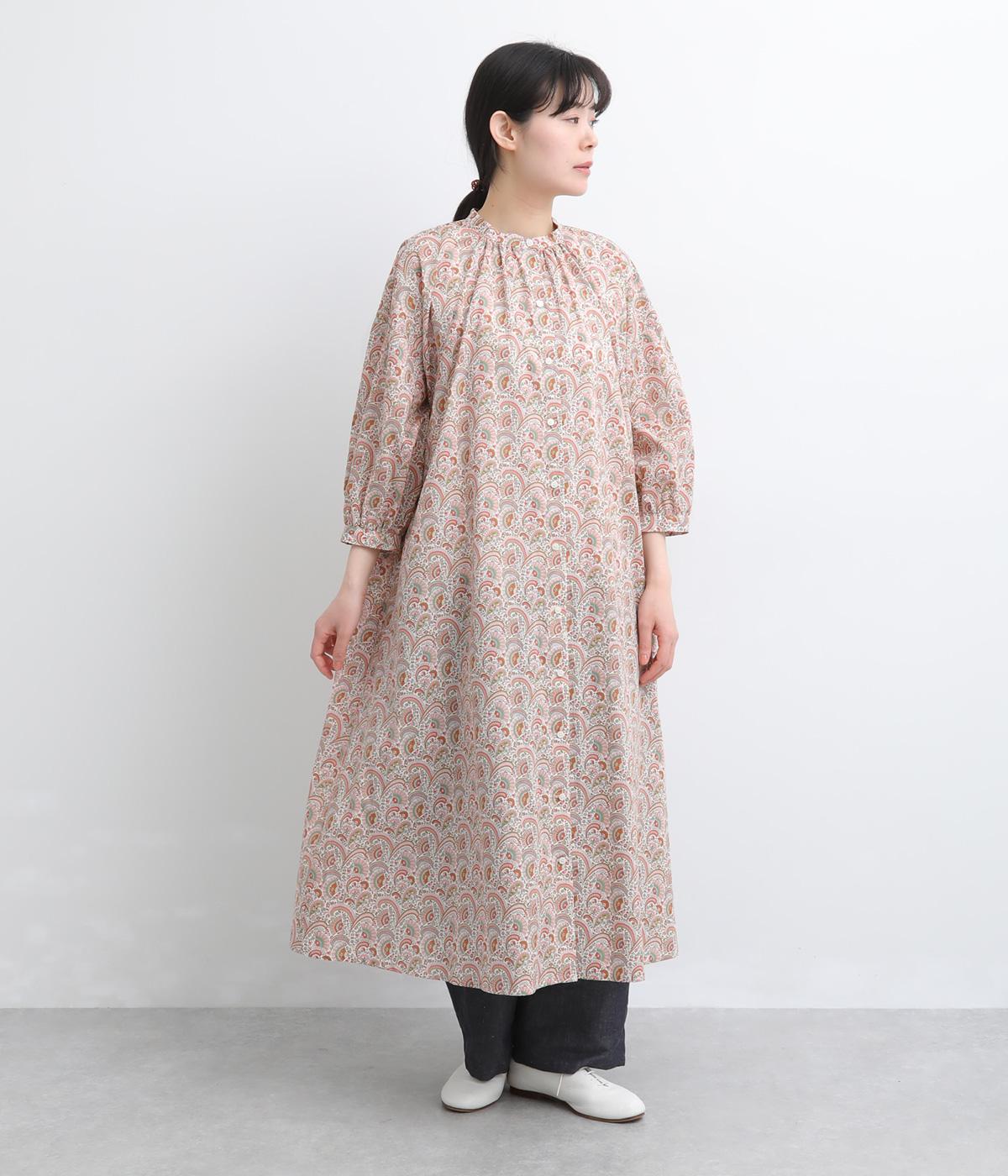 繊細なタッチで描かれたリバティプリントが、やさしく華やかな印象を添えるワンピースです。襟元と袖口に寄せたギャザーがふんわりとした立体感を生み、やわらかな丸みのあるシルエットを演出します。ゆったりとした身幅で体のラインを拾いにくいのも◎。前開き仕様で、羽織り風の着こなしもおすすめです。
