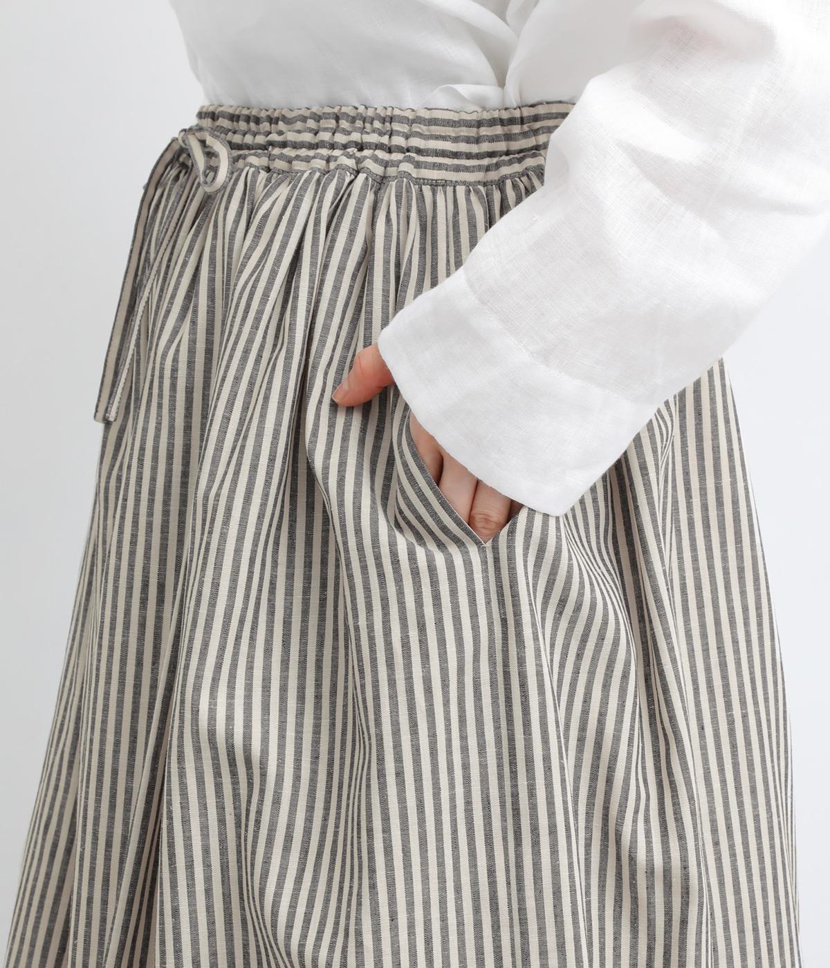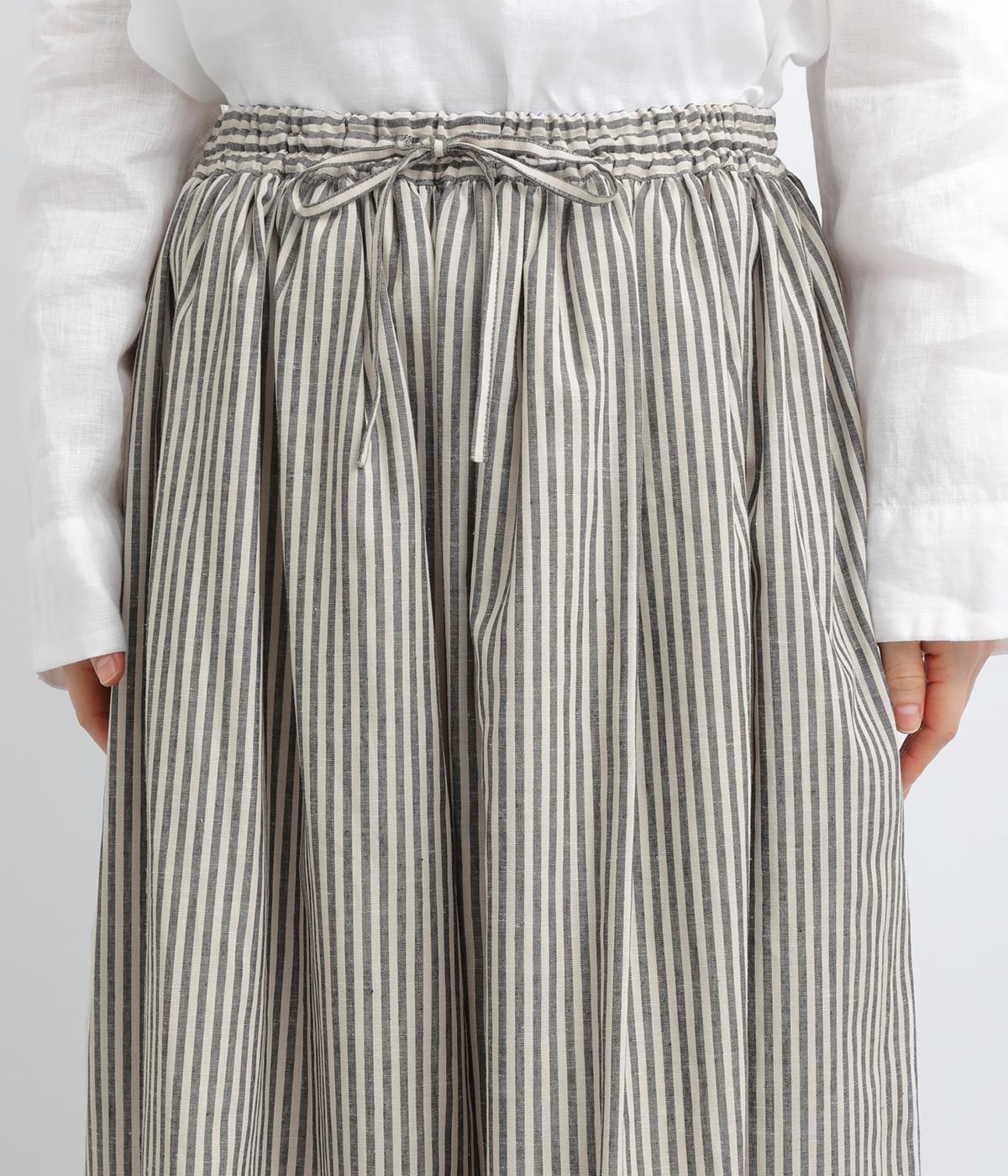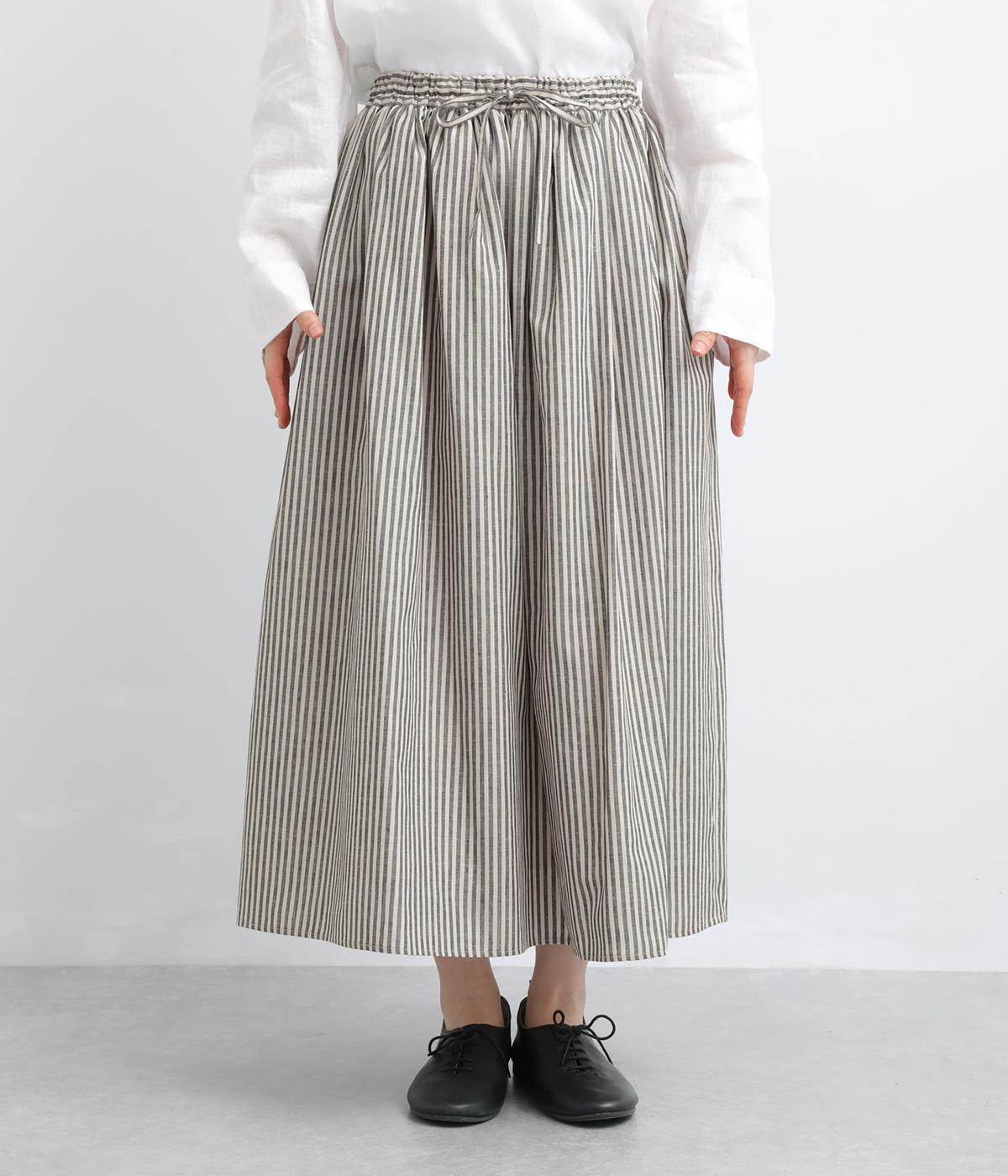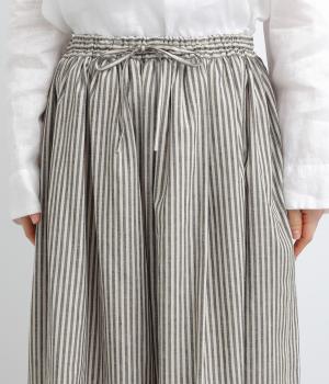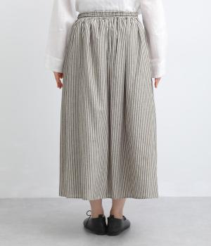 ウエストにたっぷりとギャザーを寄せた、ふんわりとしたシルエットのスカートです。かすれたようなストライプ柄が、ナチュラルな雰囲気を引き立て、軽やかな印象を添えます。ウエストはゴム仕様で快適なはき心地。裏地つきなのもうれしいポイントです。