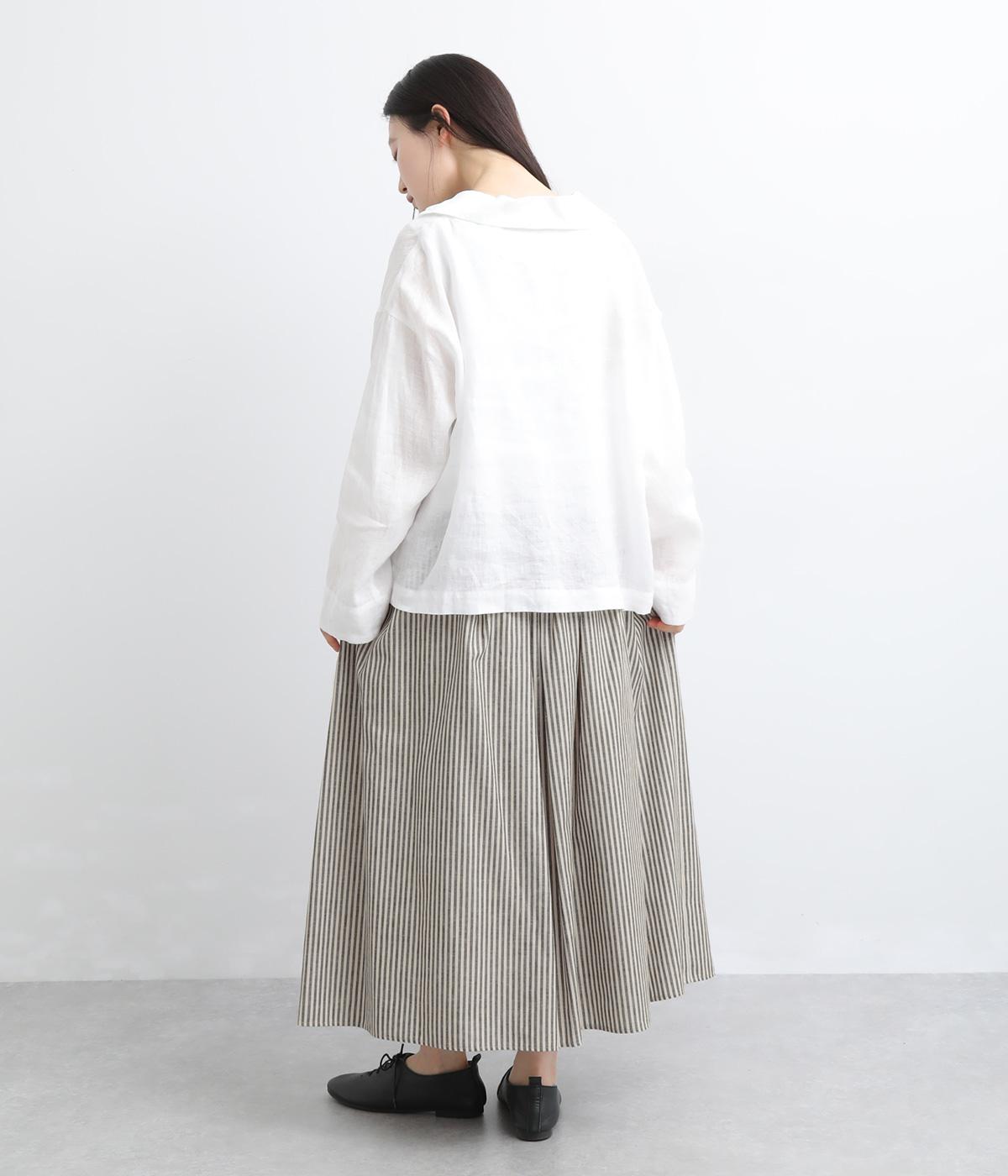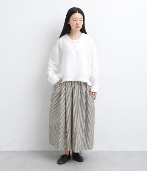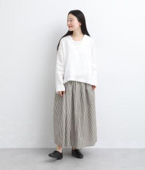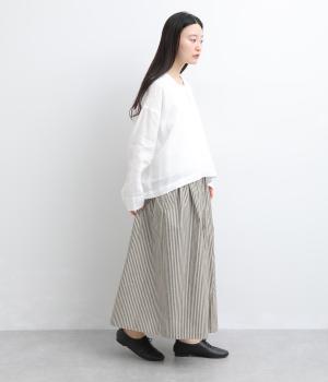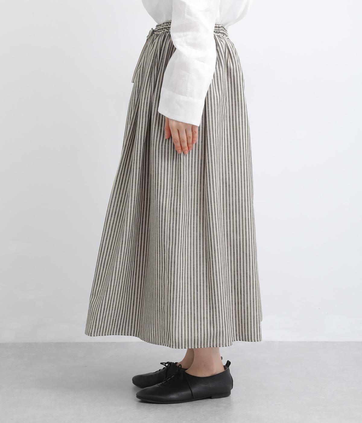 ウエストにたっぷりとギャザーを寄せた、ふんわりとしたシルエットのスカートです。かすれたようなストライプ柄が、ナチュラルな雰囲気を引き立て、軽やかな印象を添えます。ウエストはゴム仕様で快適なはき心地。裏地つきなのもうれしいポイントです。