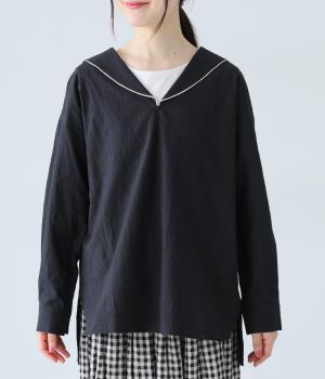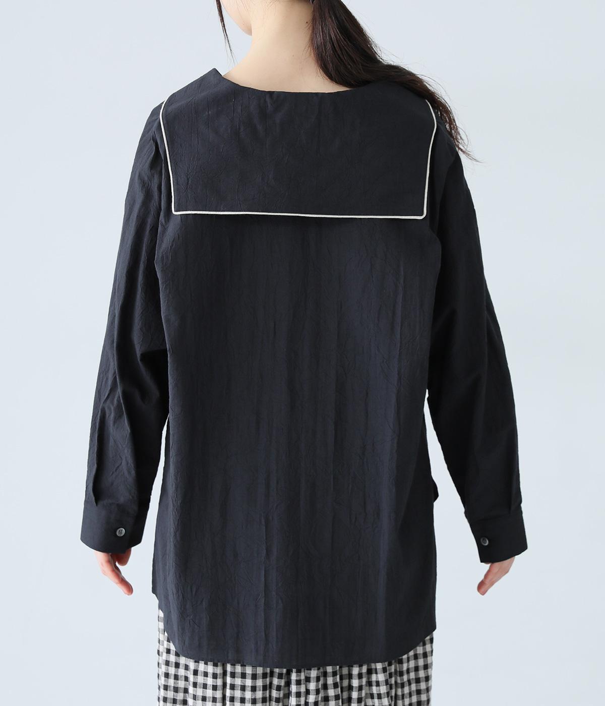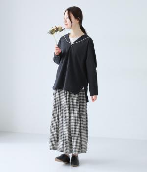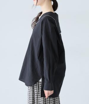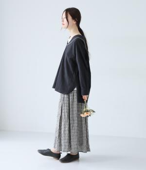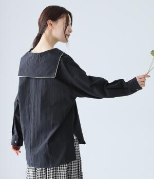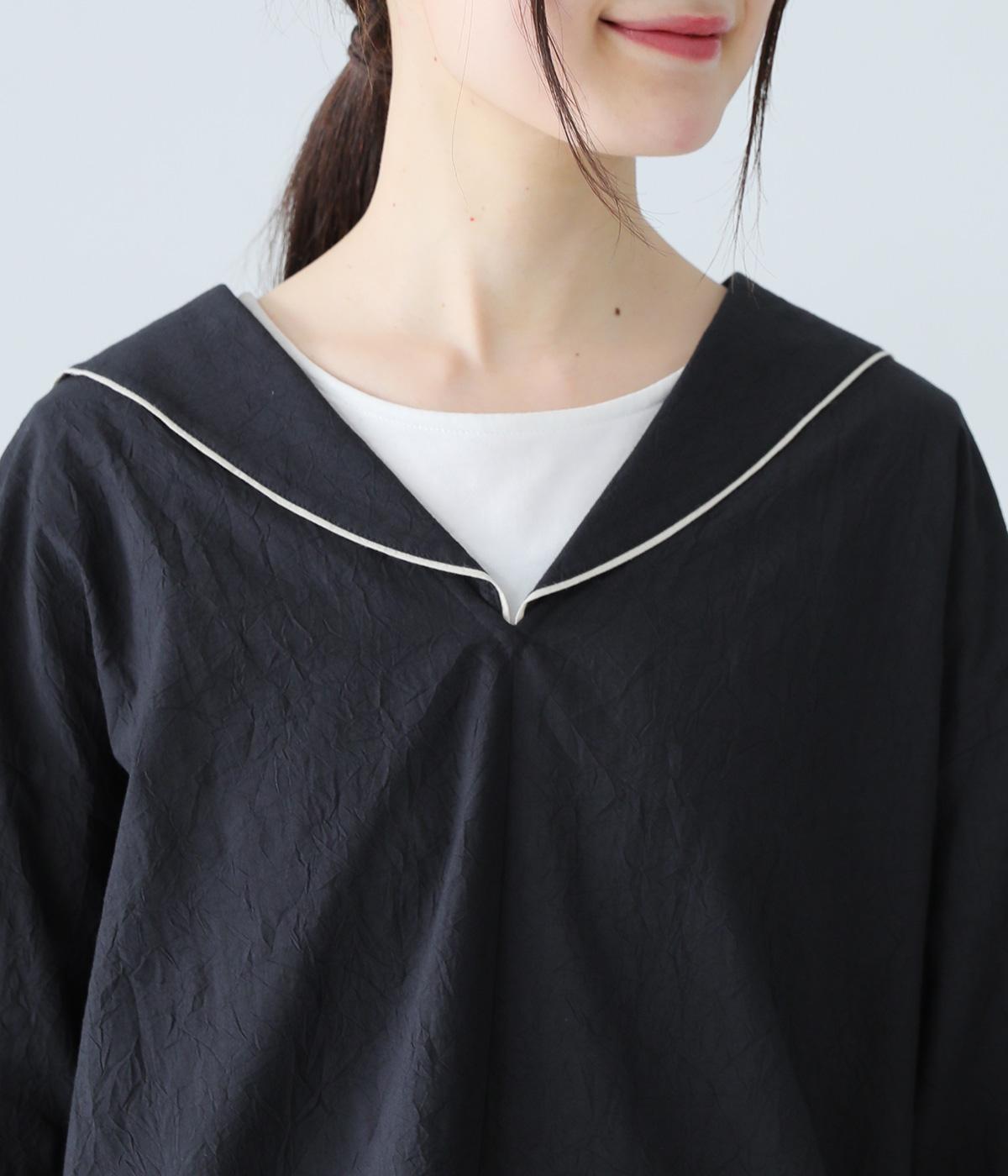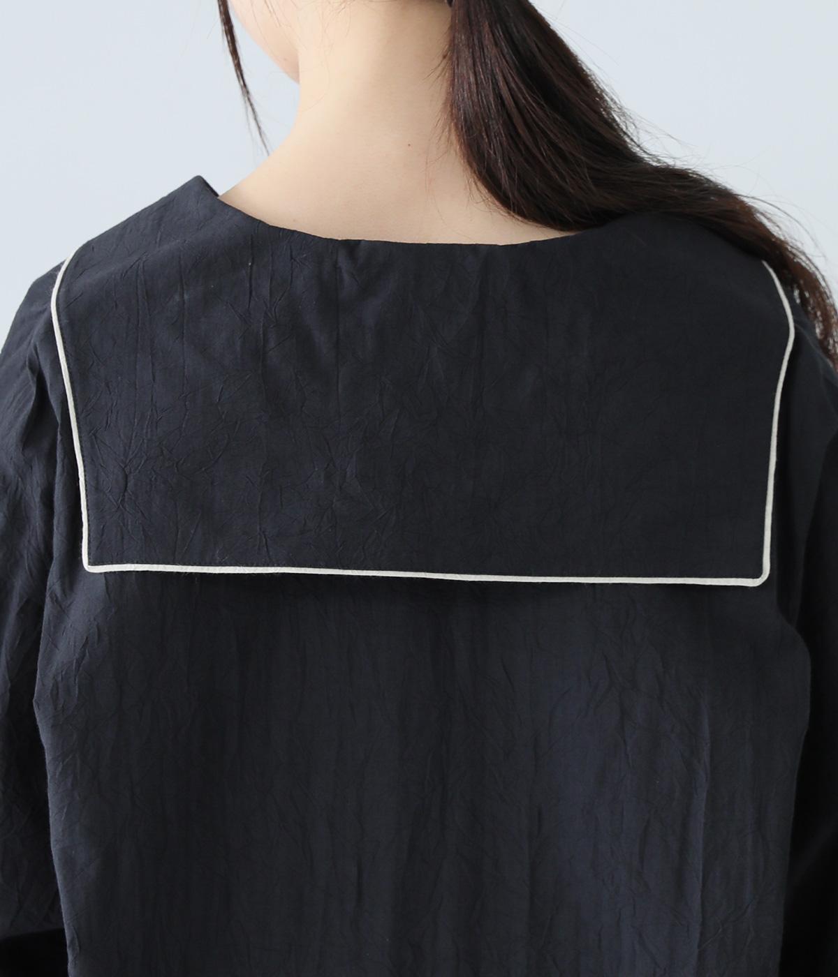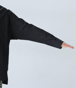 縁に配色を入れて存在感を出したセーラーカラーがポイント。視線が上がり、バランスのよい着こなしを後押ししてくれます。後ろの襟は大きすぎず、子どもっぽくなりにくいのがグッド。大きく前後差をつけ、ヒップまでカバーする着丈もポイントです。