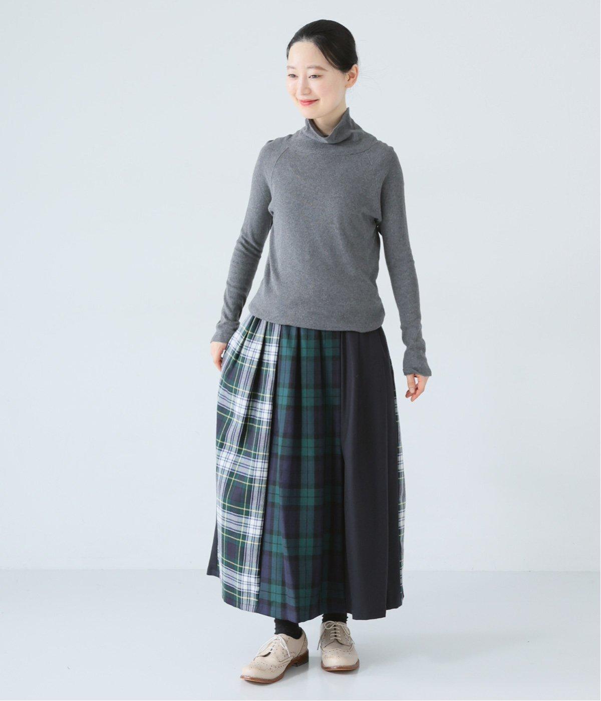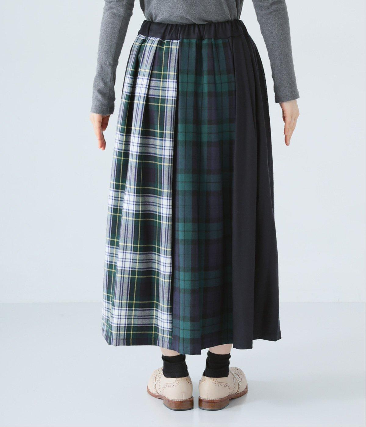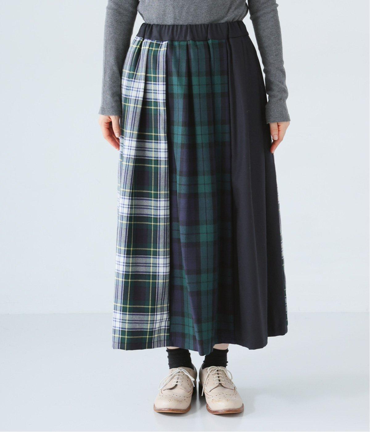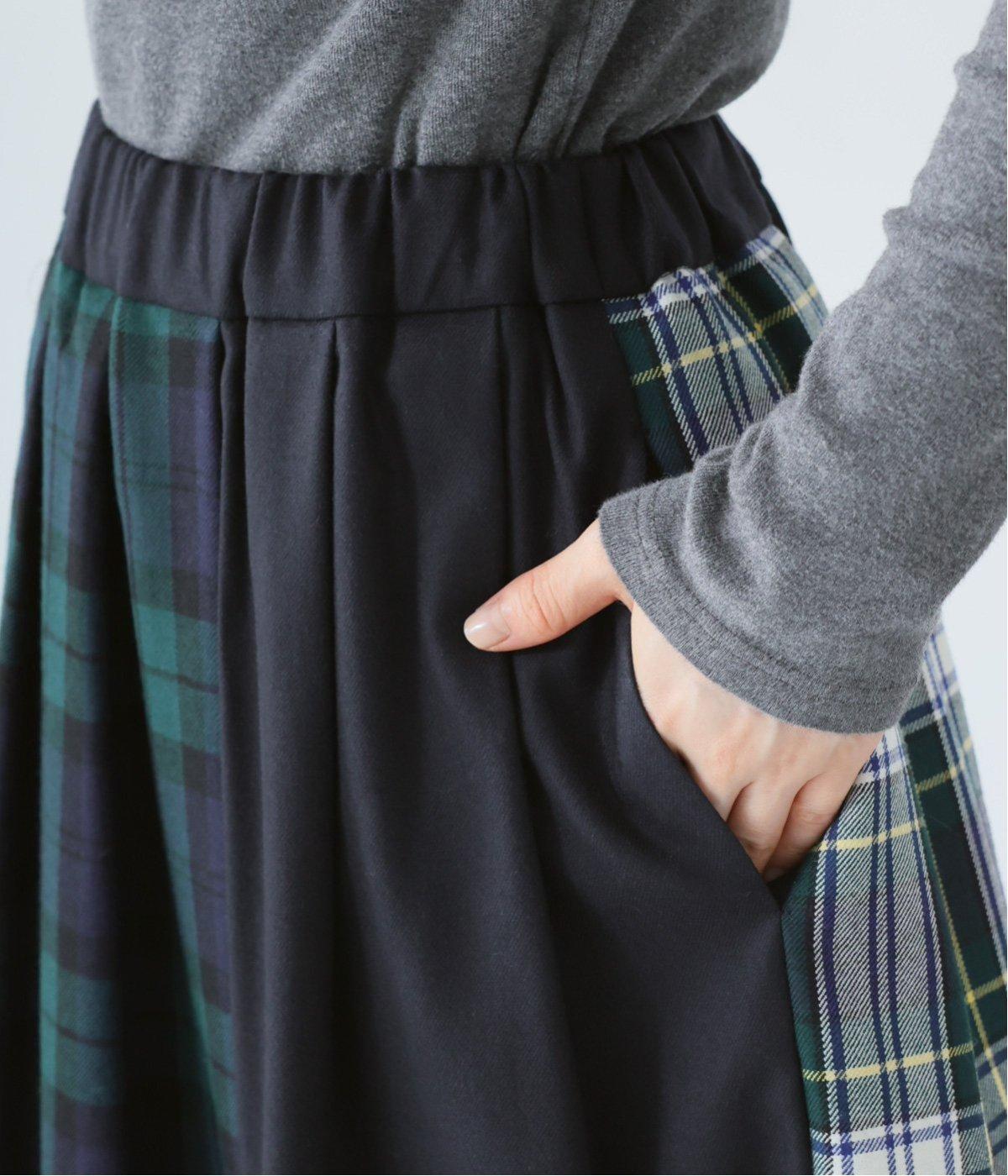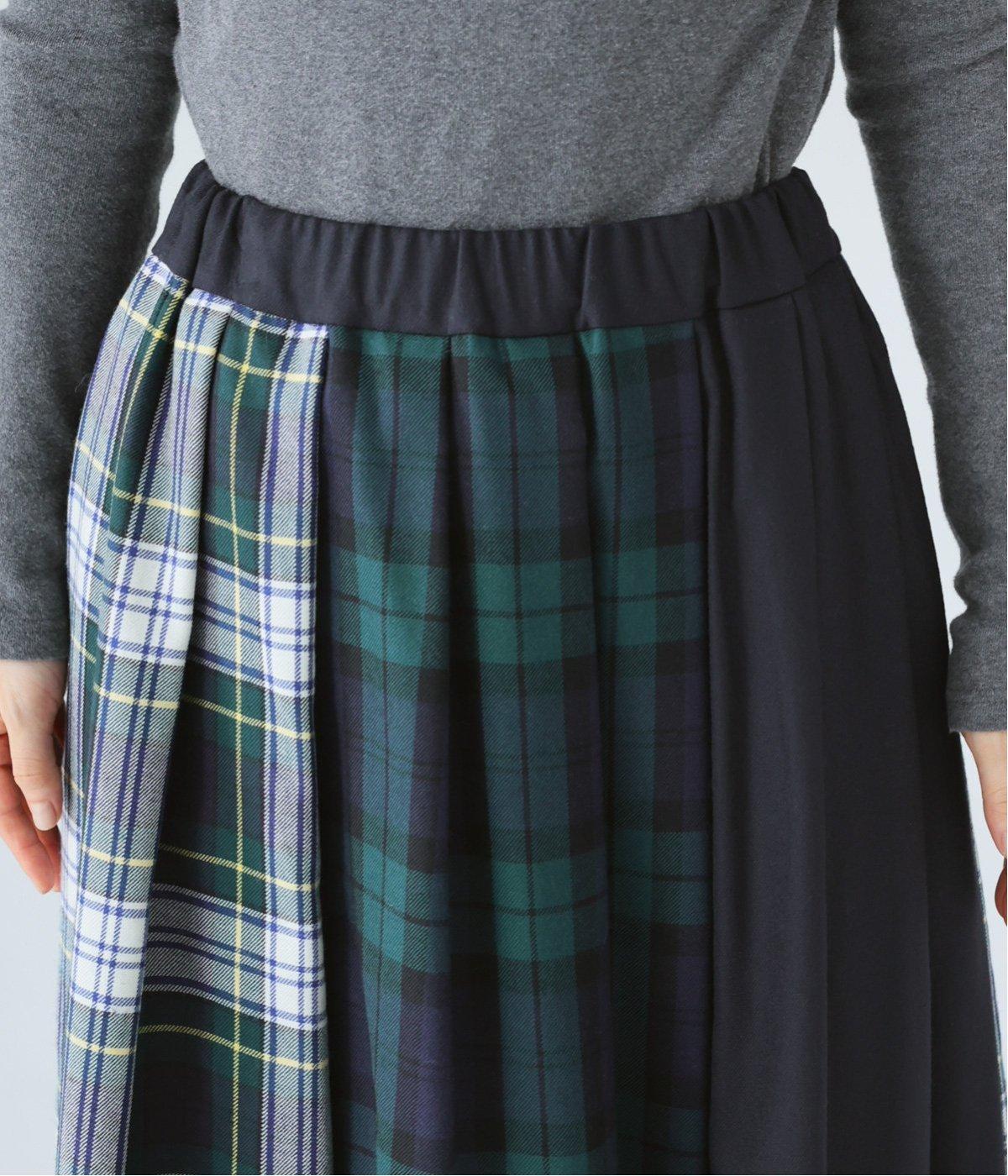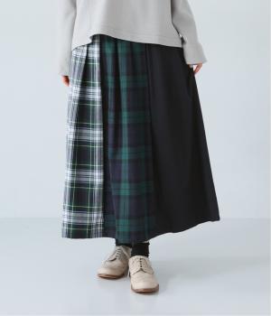 2種類のタータンチェックと無地生地を組み合わせた飽きの来ないデザインが魅力。一点投入でトラッド感漂う着こなしが叶います。ウエストのタックからドレープを広げたほどよいボリューム感が素敵。お腹まわりにやさしくフィットするゴム仕様のウエストもポイントです。