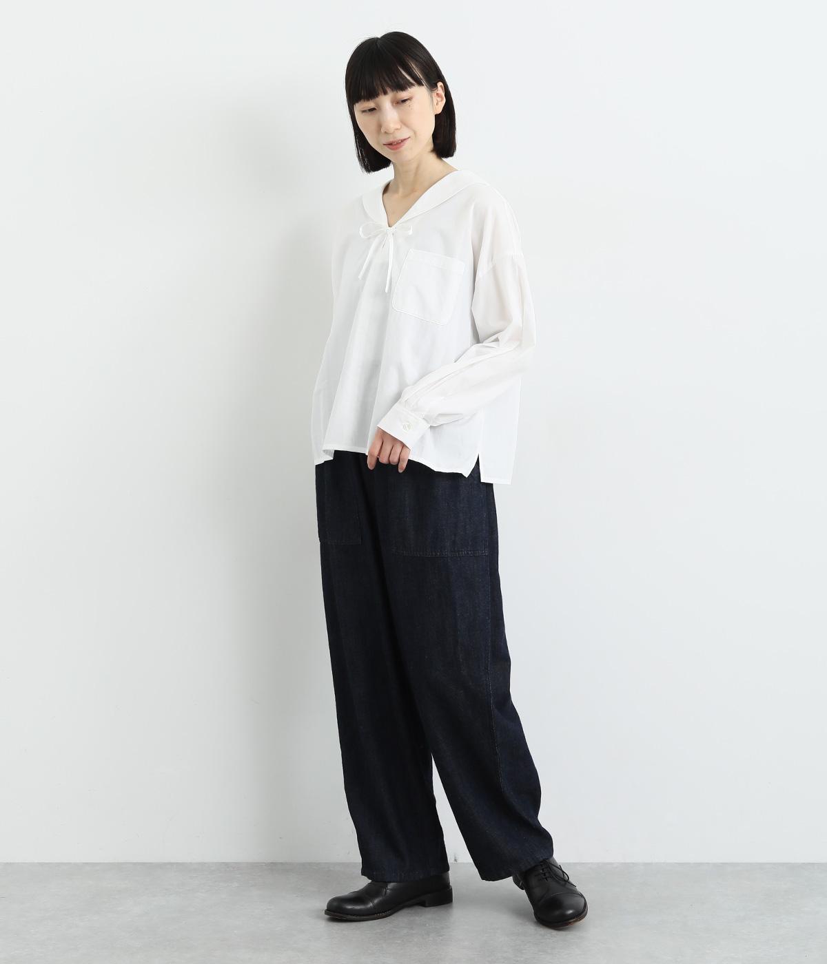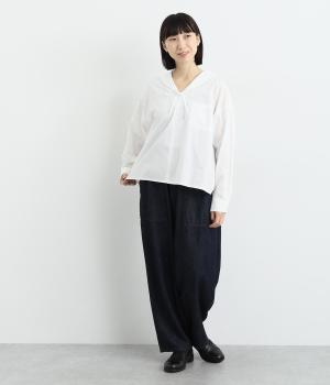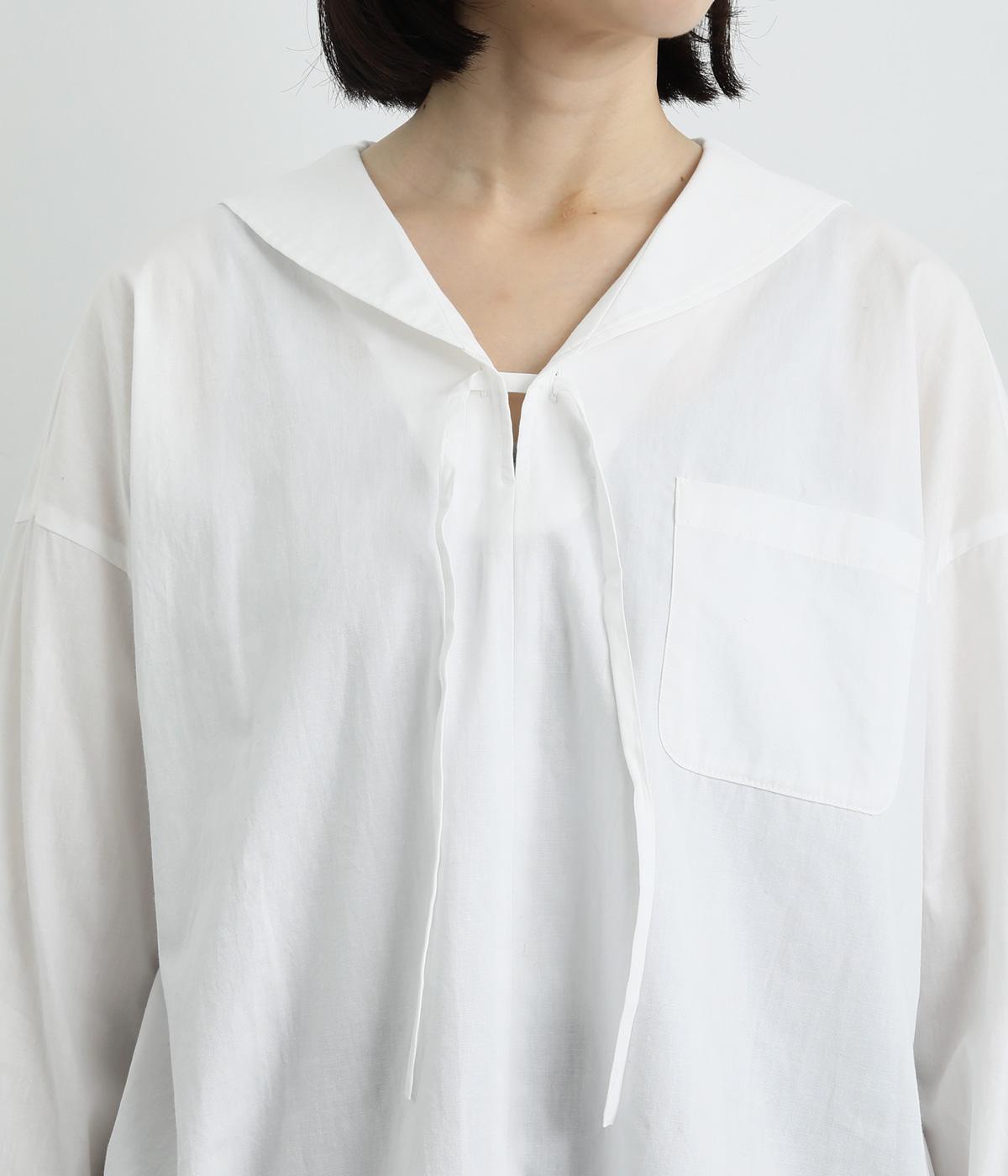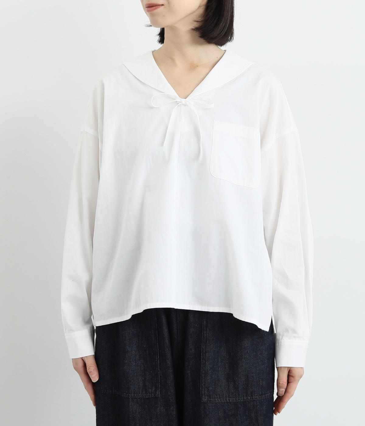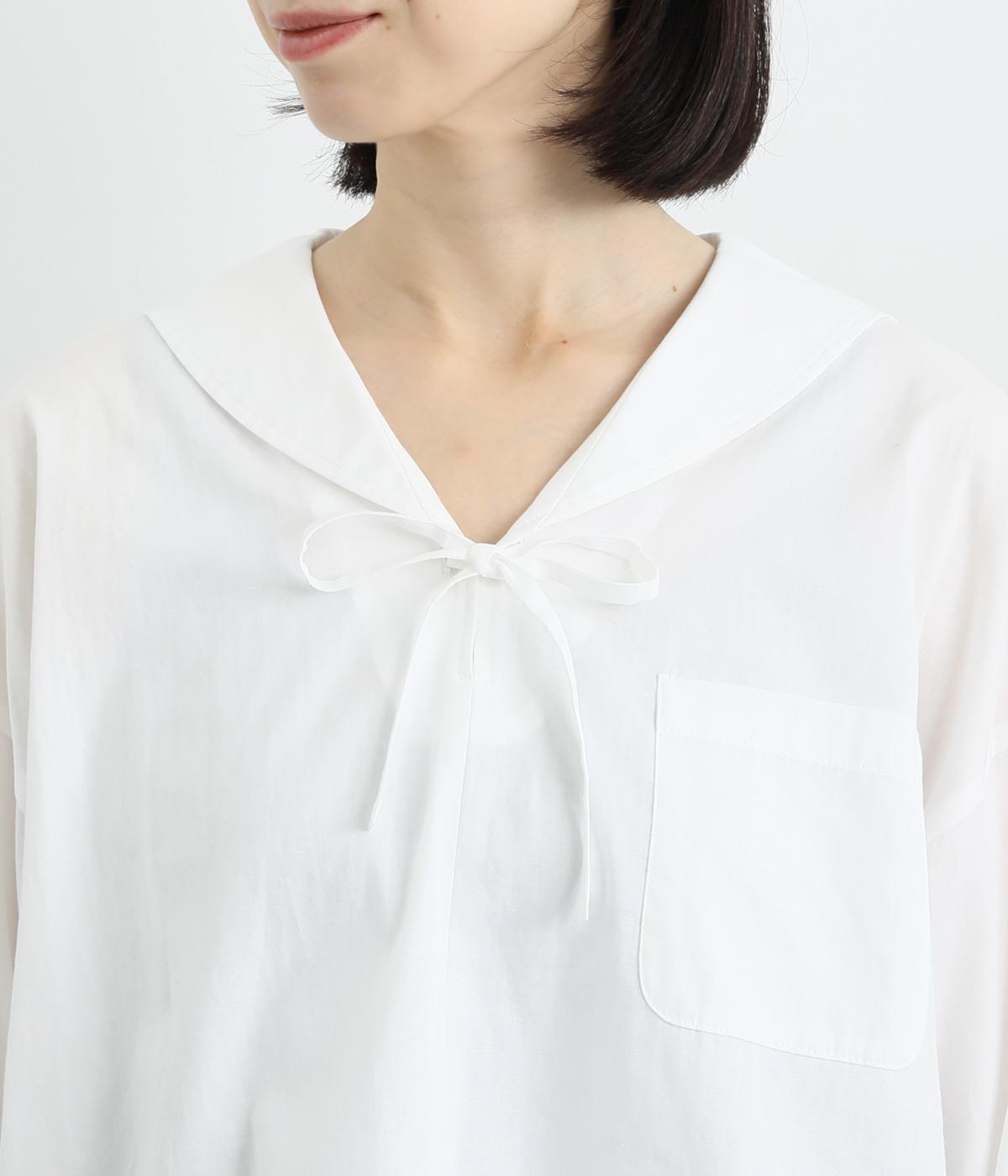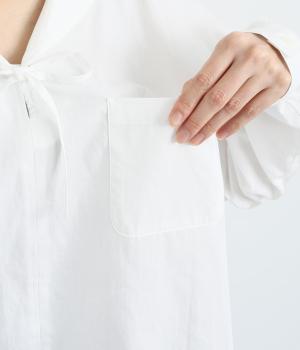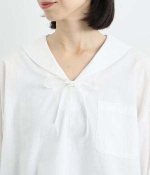 小さめのセーラーカラーで子どもっぽさをおさえた、大人の女性にぴったりなシャツ。すっきりとしたやや深めのVネックに愛らしいリボンを添えました。左胸に配したポケットがアクセントに。身幅にゆとりを持たせた分、着丈は短めに設定してバランス良く仕上げています。