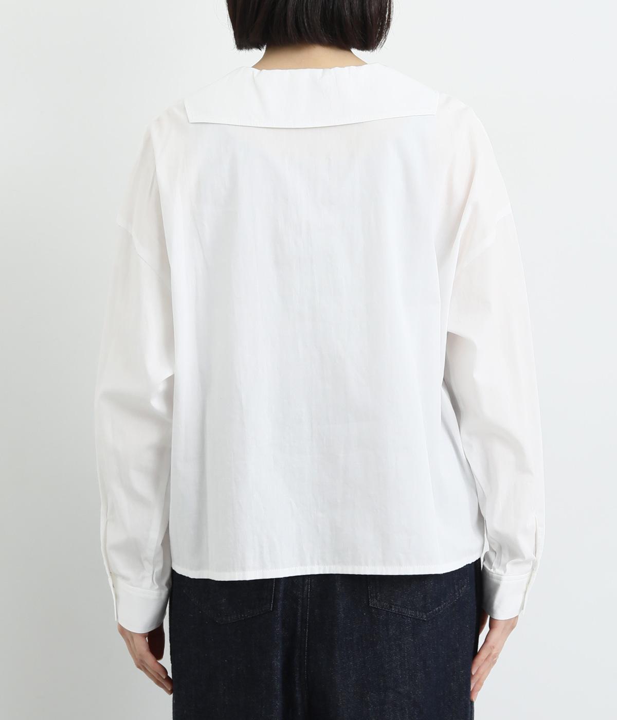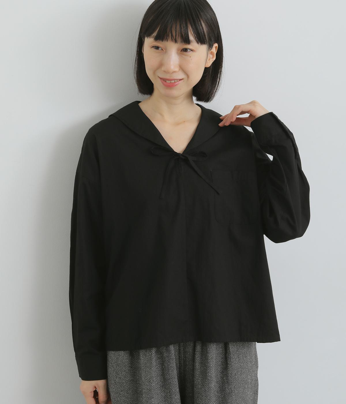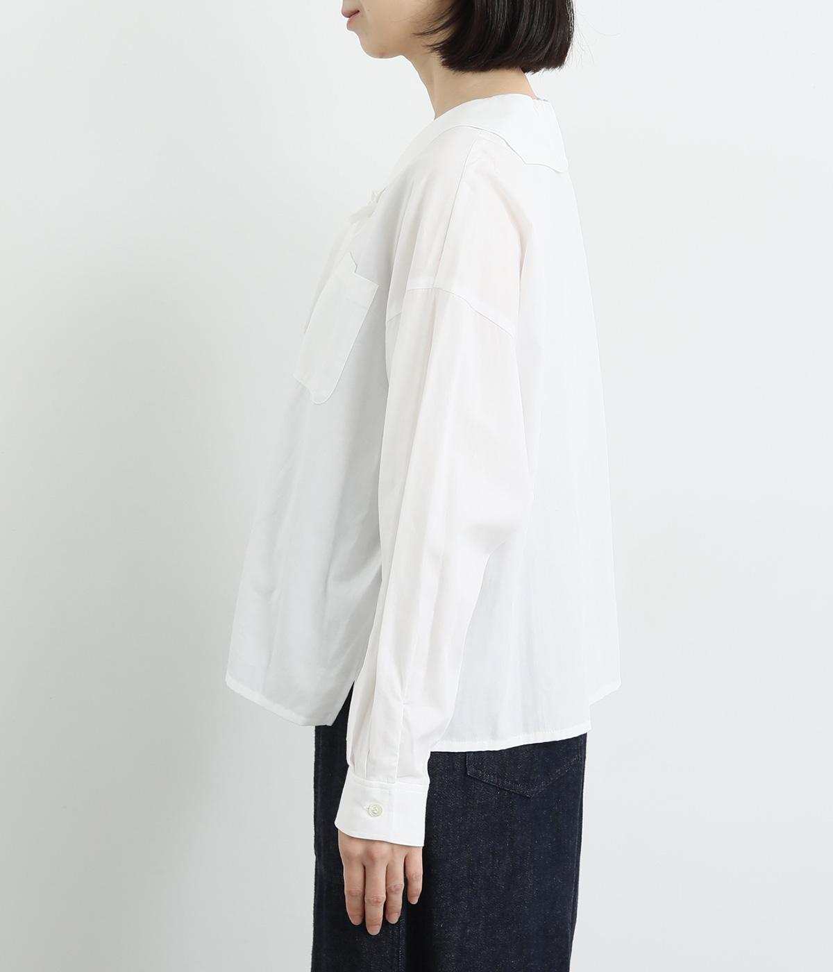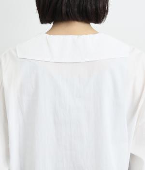 小さめのセーラーカラーで子どもっぽさをおさえた、大人の女性にぴったりなシャツ。すっきりとしたやや深めのVネックに愛らしいリボンを添えました。左胸に配したポケットがアクセントに。身幅にゆとりを持たせた分、着丈は短めに設定してバランス良く仕上げています。
