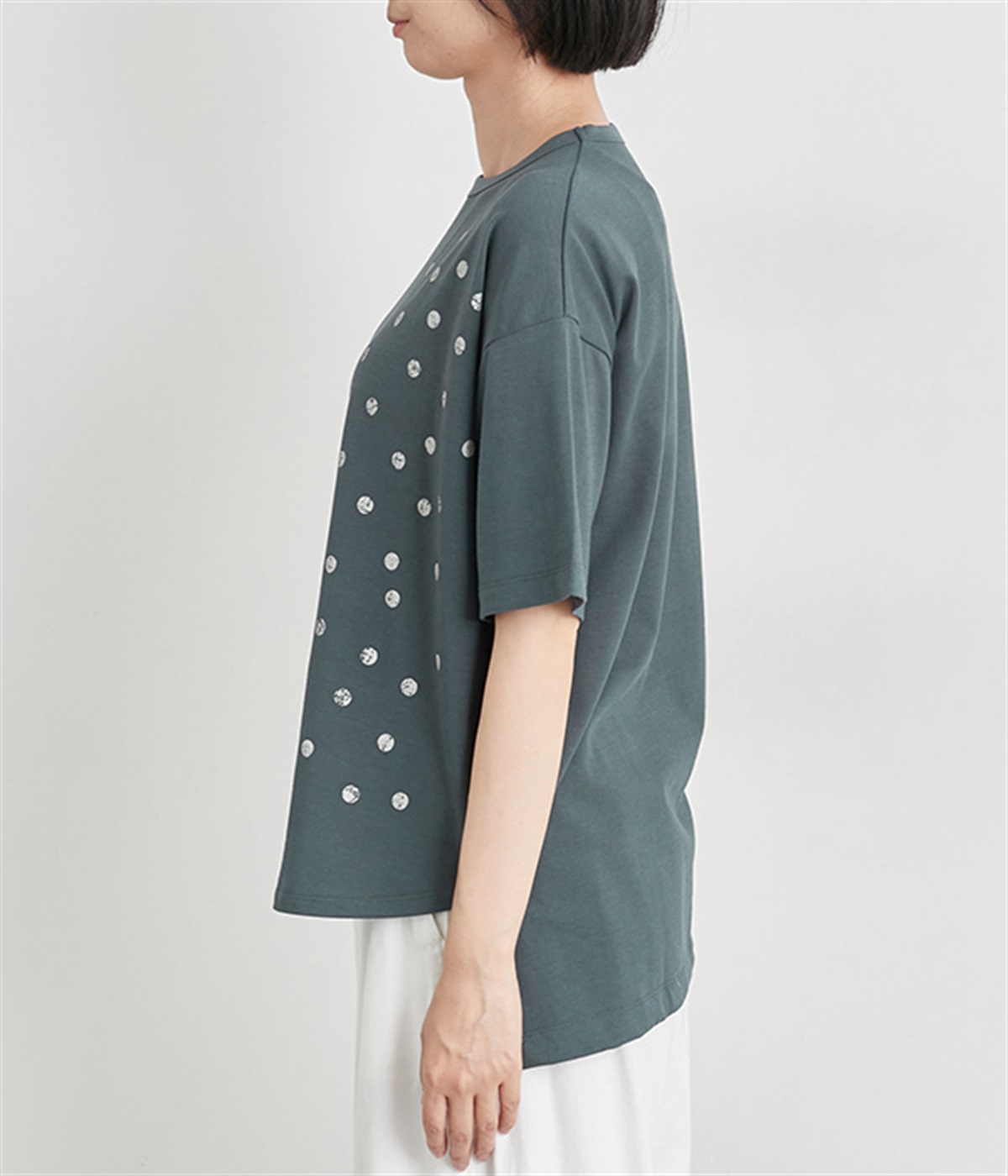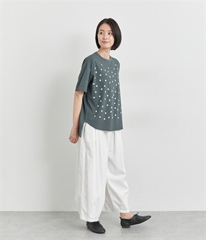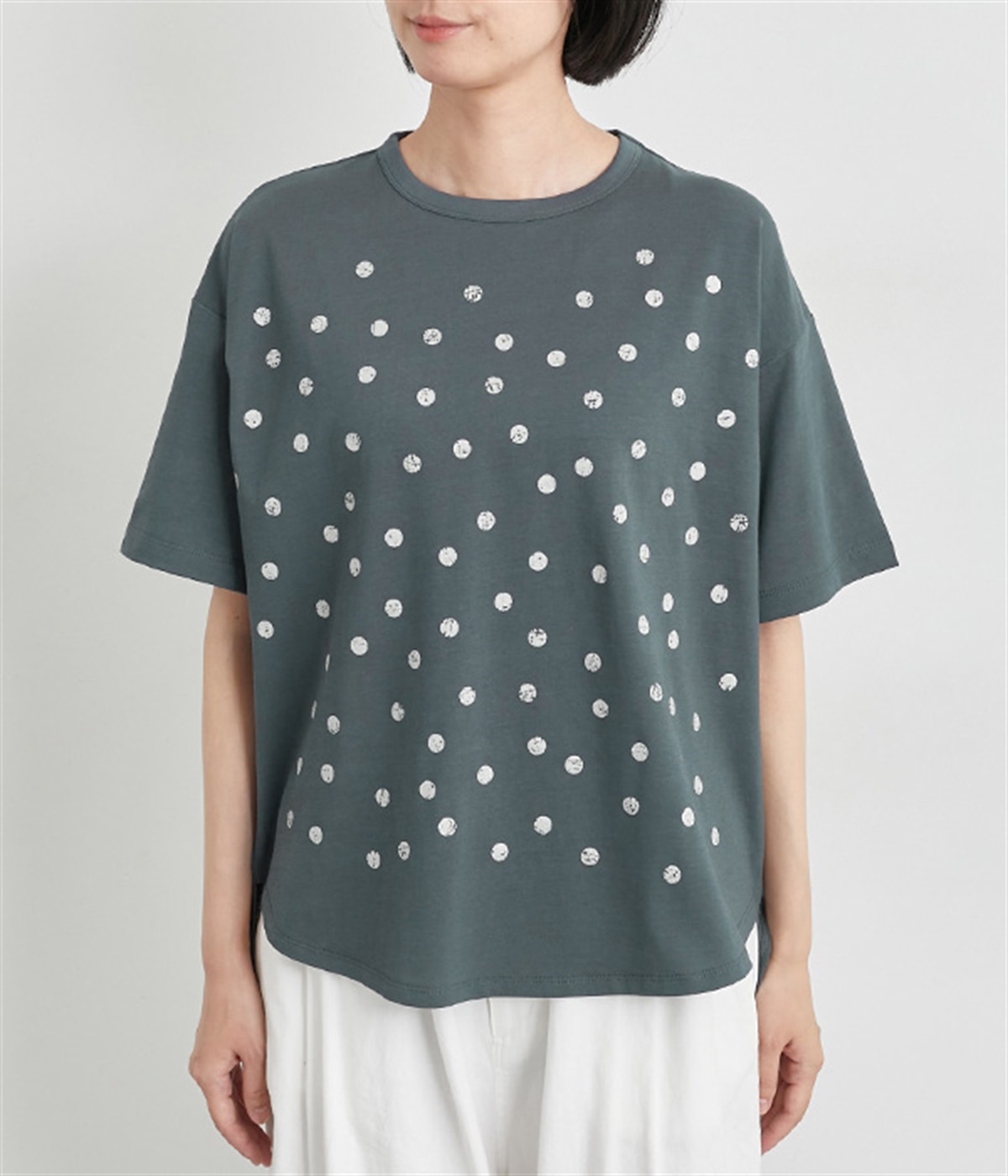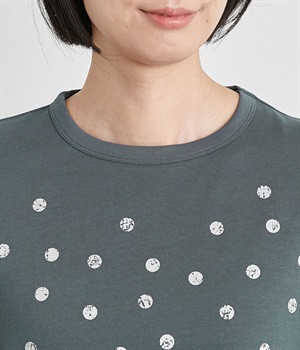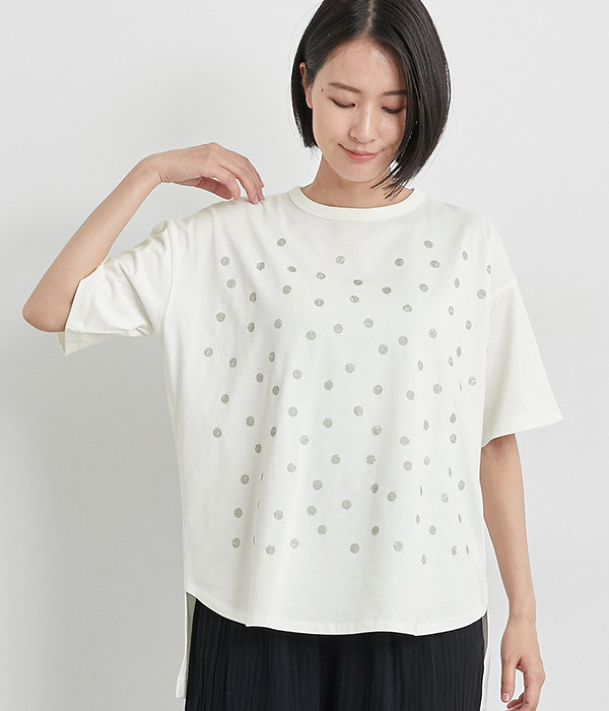 箔のようなラメ感のあるドットを前身頃のみほどこしました。ところどころかすれたようなドット柄が、甘すぎることなく自然体な仕上がりです。総柄ではないので着合わせしやすく、それでいてスタイリングのポイントになってくれます。
