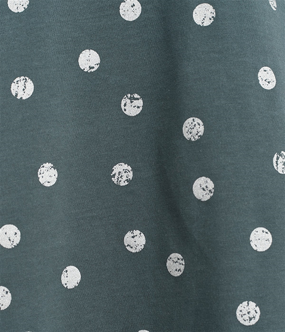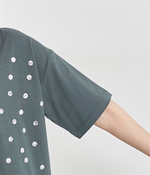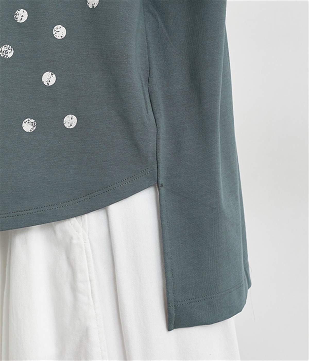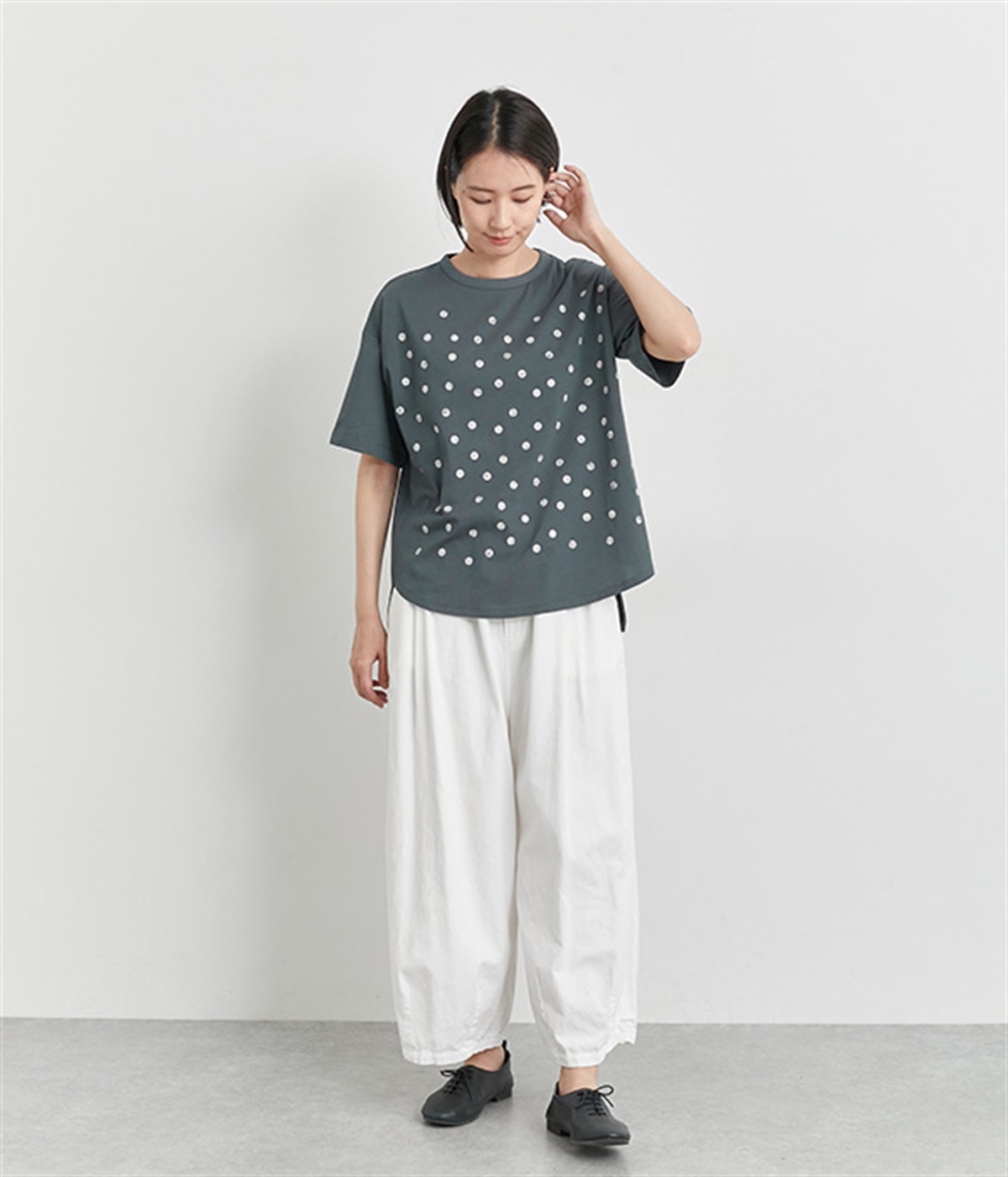 箔のようなラメ感のあるドットを前身頃のみほどこしました。ところどころかすれたようなドット柄が、甘すぎることなく自然体な仕上がりです。総柄ではないので着合わせしやすく、それでいてスタイリングのポイントになってくれます。