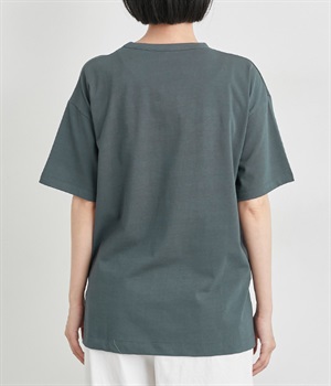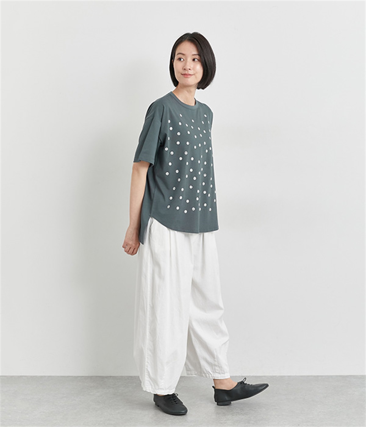 まいにちの装いに欠かせない、伸縮性があって着心地のいい綿天竺生地を採用しています。肉厚すぎない中厚素材で羽織りものなども合わせやすく使い勝手のいい生地感です。