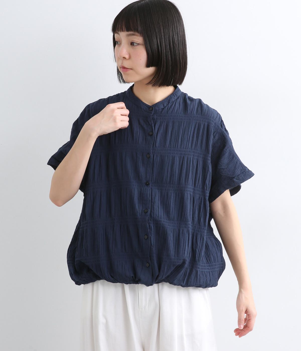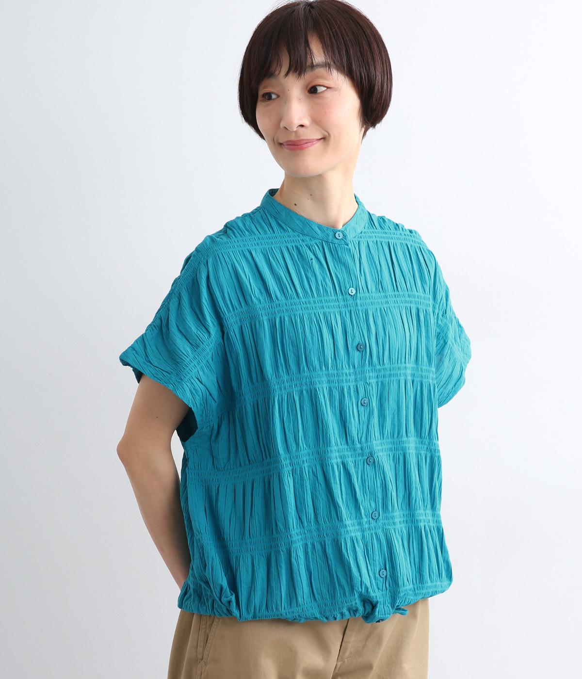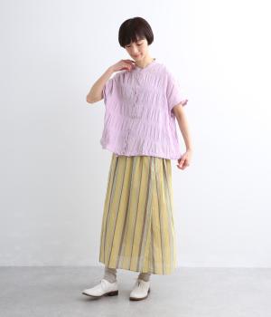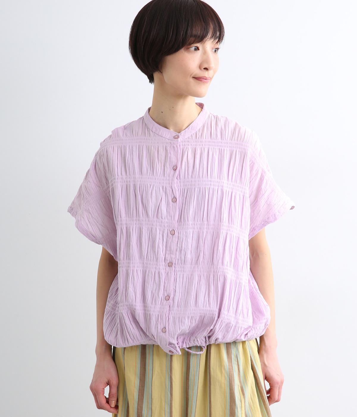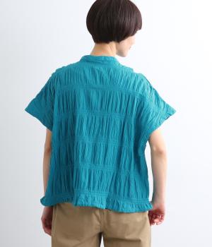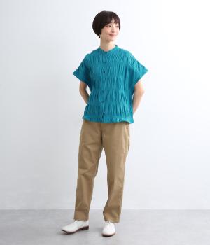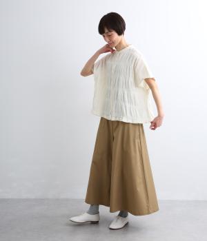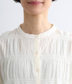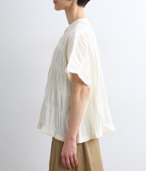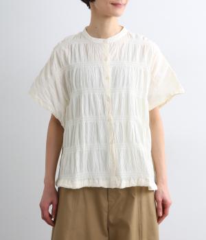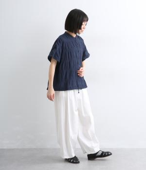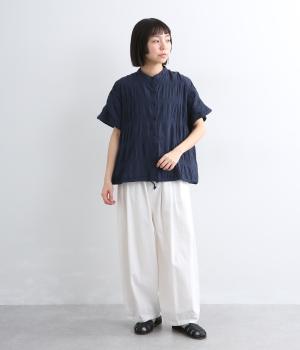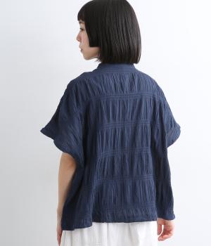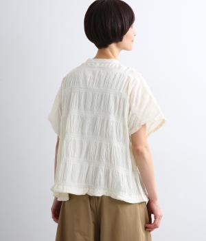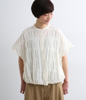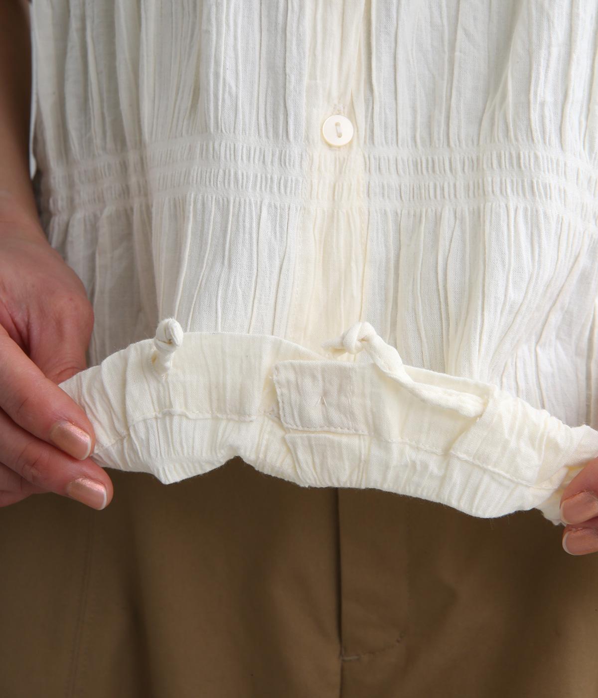 波打つような自然な凹凸感が特徴的な一枚。裾をしぼれるデザインで表情に変化をつけられます。ふわっと広がる袖は風通しがよく、適度な華やかさもプラス。前あき仕様でジレのようにレイヤードした装いも◎。