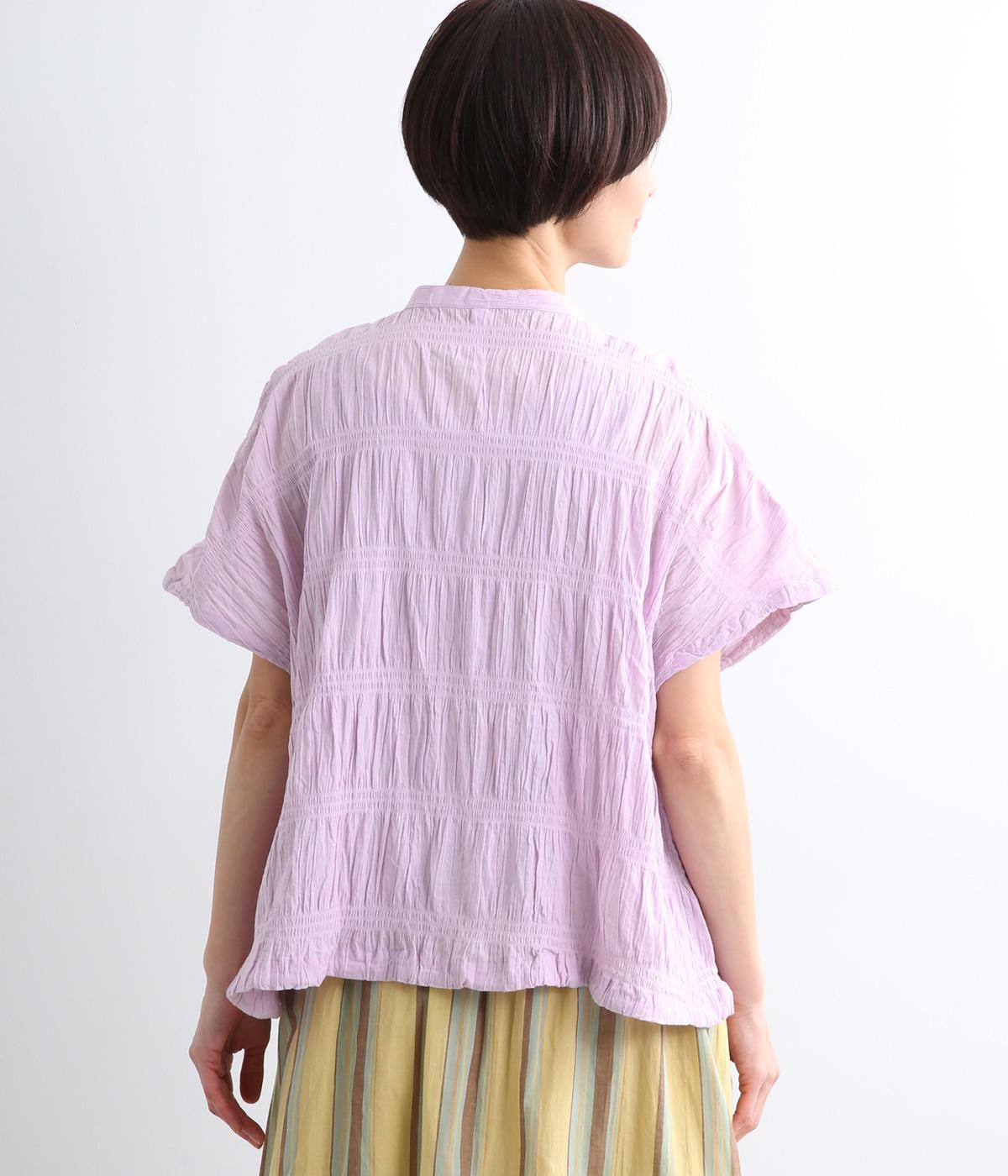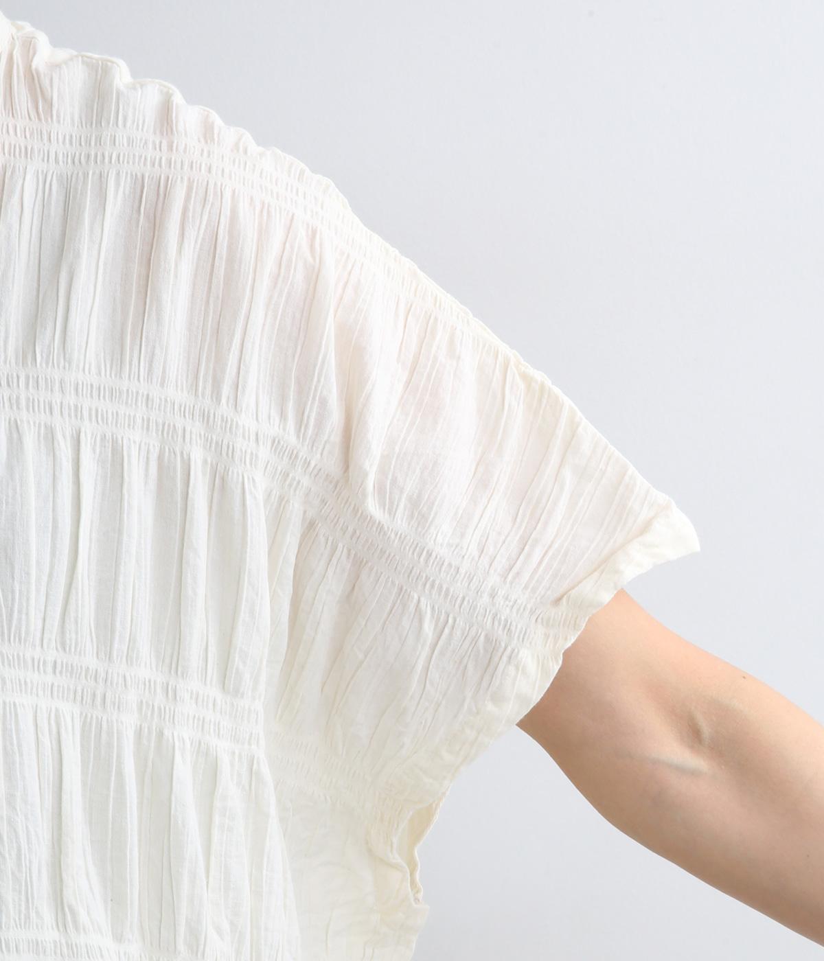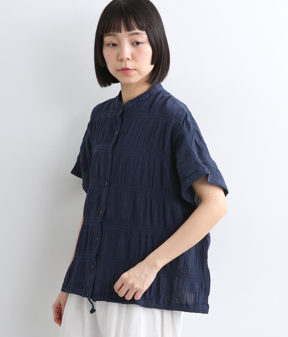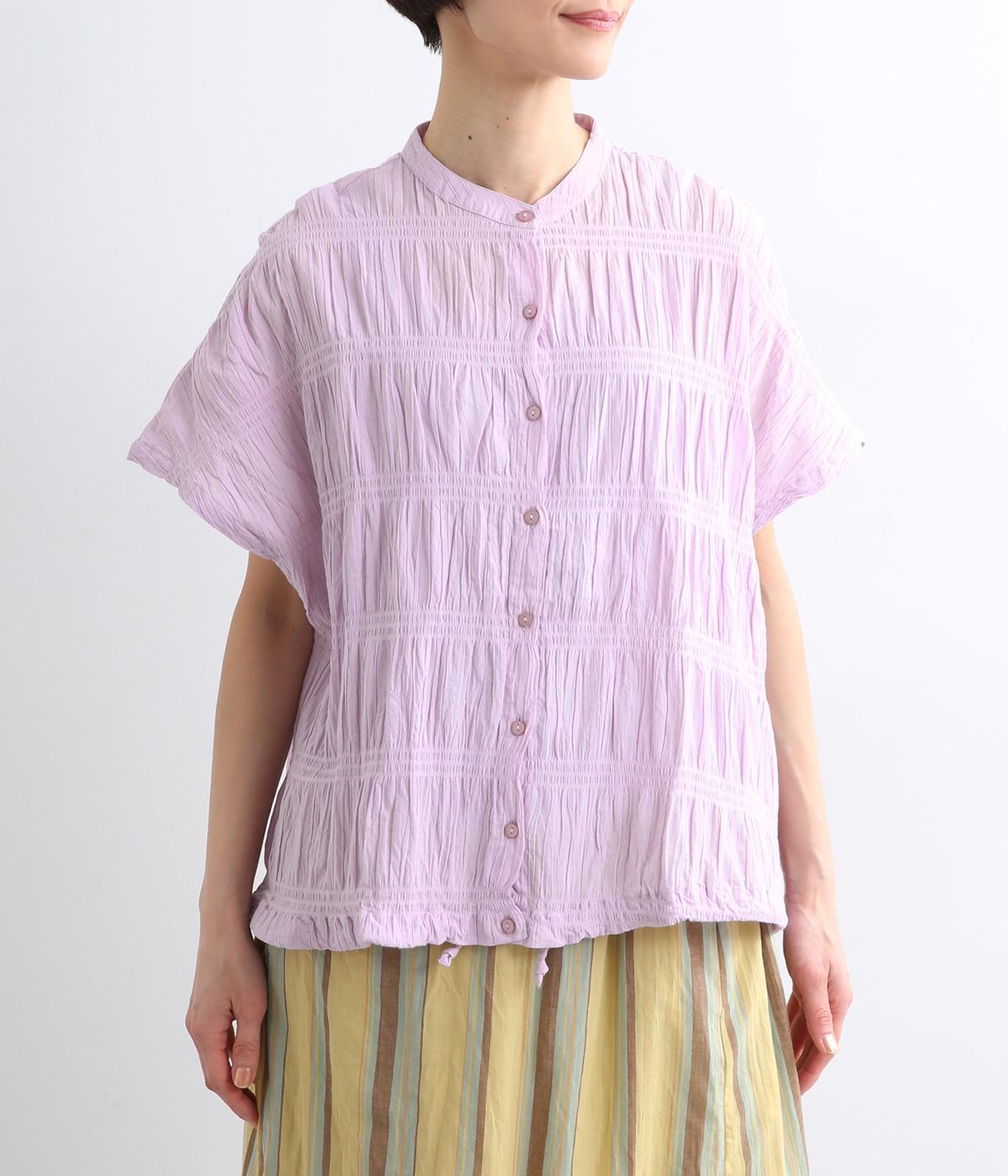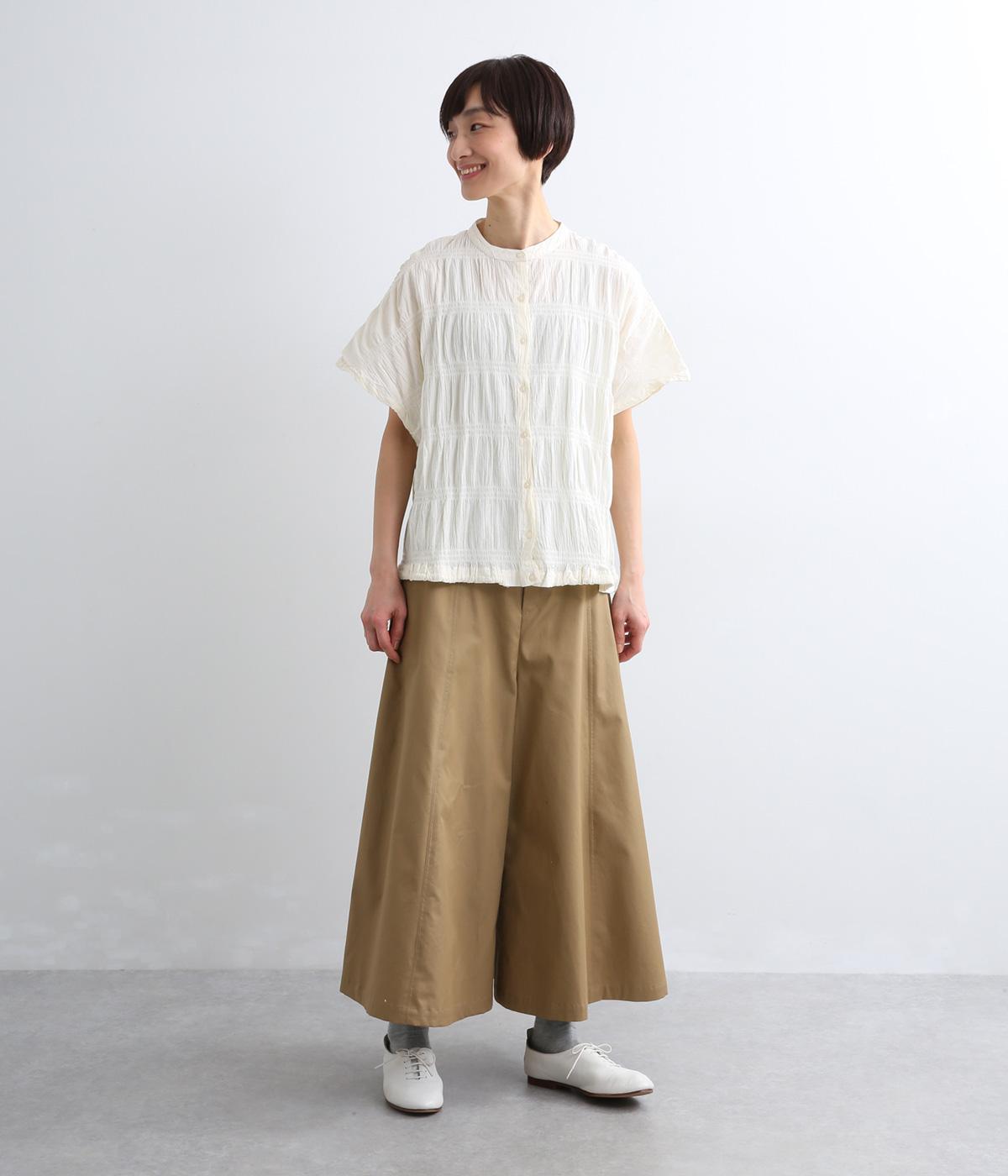 波打つような自然な凹凸感が特徴的な一枚。裾をしぼれるデザインで表情に変化をつけられます。ふわっと広がる袖は風通しがよく、適度な華やかさもプラス。前あき仕様でジレのようにレイヤードした装いも◎。