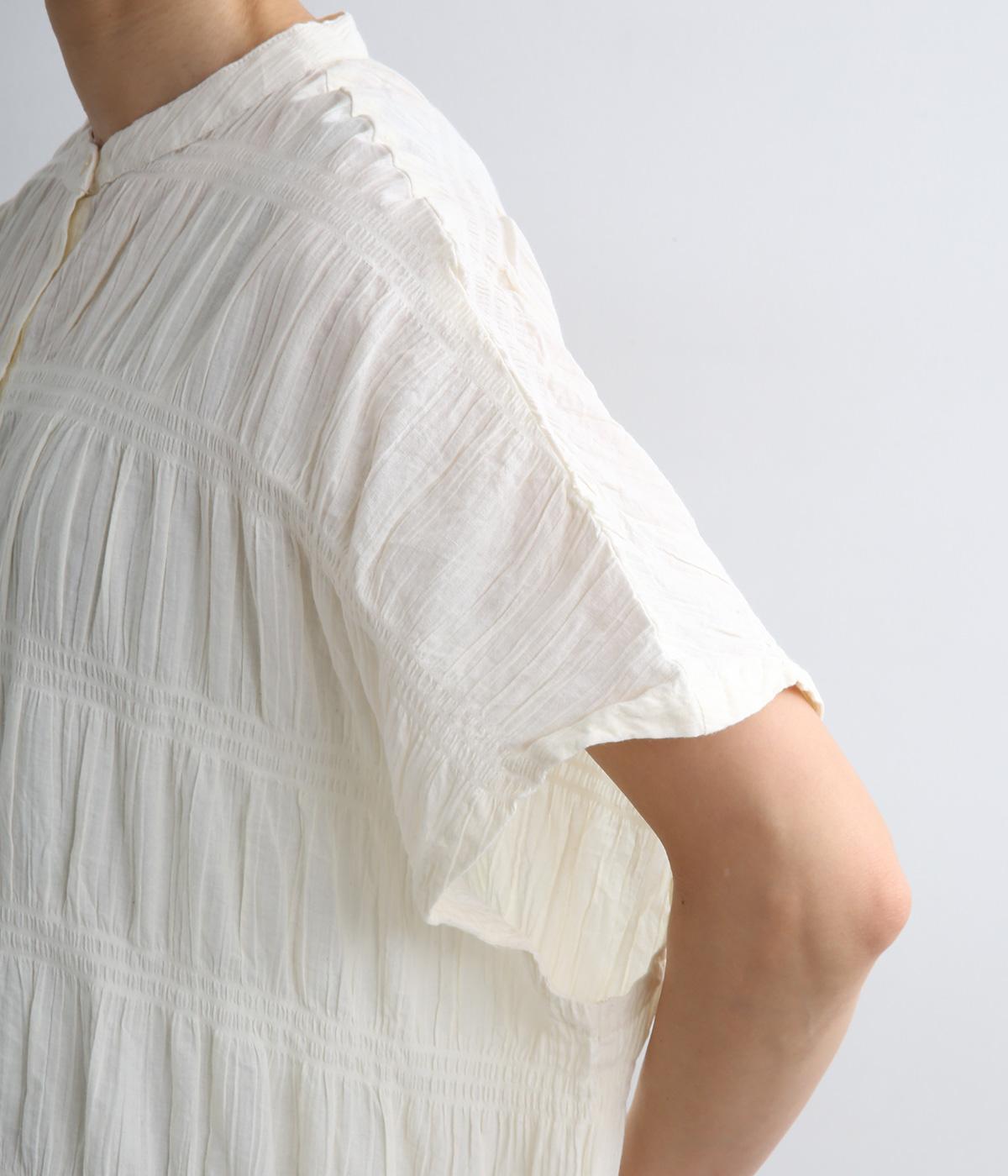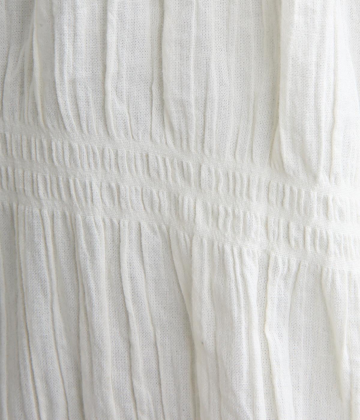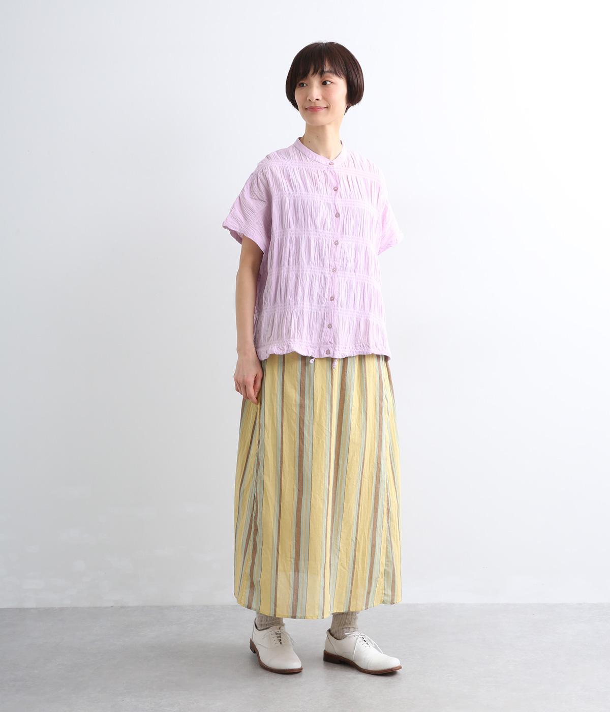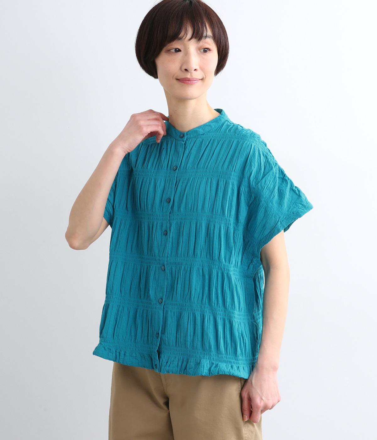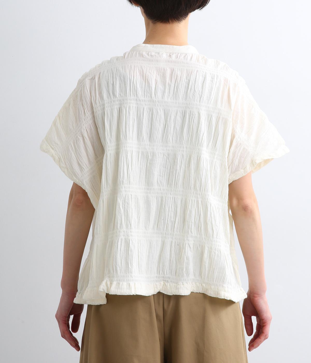 波打つような自然な凹凸感が特徴的な一枚。裾をしぼれるデザインで表情に変化をつけられます。ふわっと広がる袖は風通しがよく、適度な華やかさもプラス。前あき仕様でジレのようにレイヤードした装いも◎。