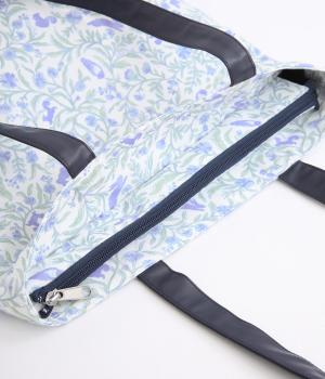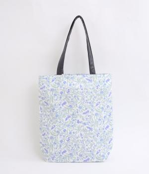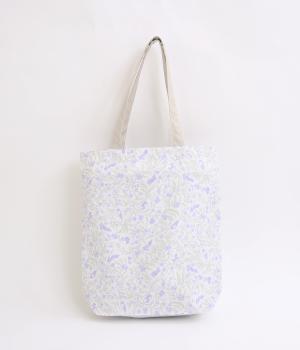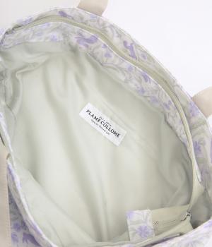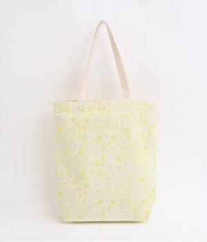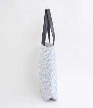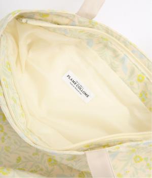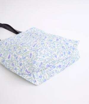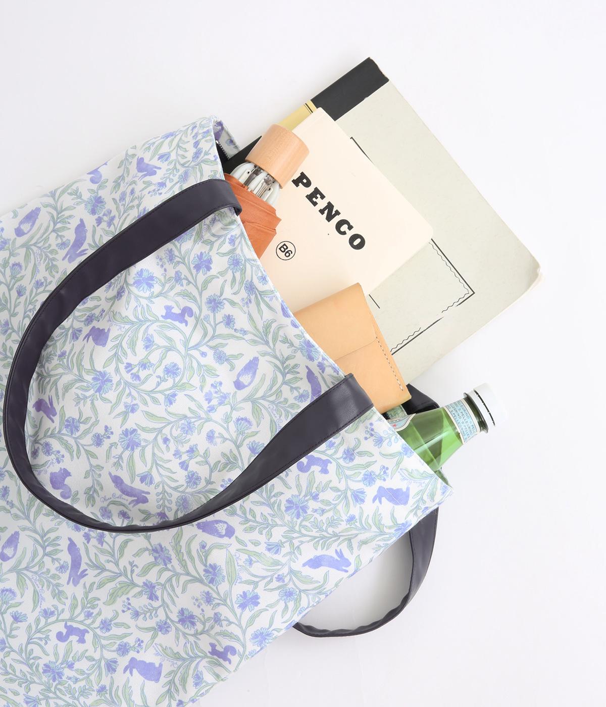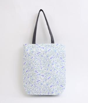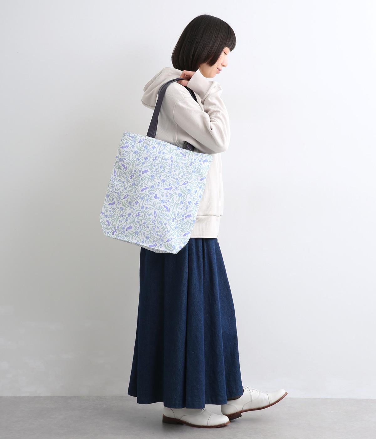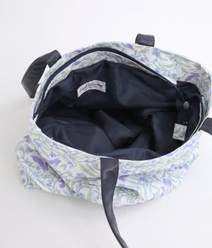 キャンバスのようなナチュラル感がありながらも、やわらかくなじみのいいプリント生地を使用。ハンドルや内布には光沢感のある生地を配してさり気ないコントラストに。