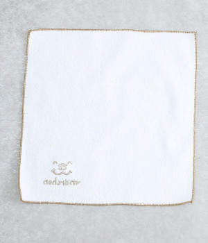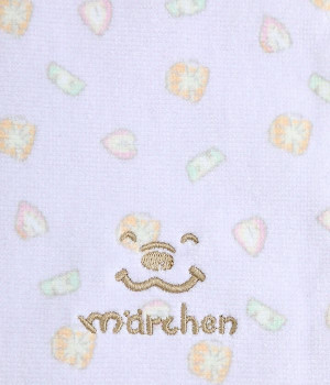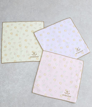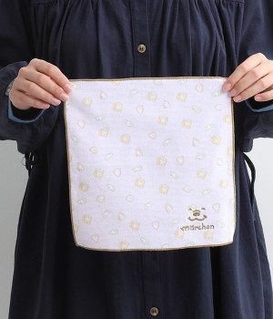 お出かけに欠かせないハンカチタオルはフルーツ総柄で気分が高まります。使い勝手のいいミニサイズはバッグの中で場所をとりにくいのもうれしいポイント。淡くやさしいタッチのフルーツ柄にくまのキャラクター「メルるん♪」の顔刺しゅうを施してメルヘン要素も◎。同じ柄のTシャツとおそろいでプレゼントにしても素敵です。